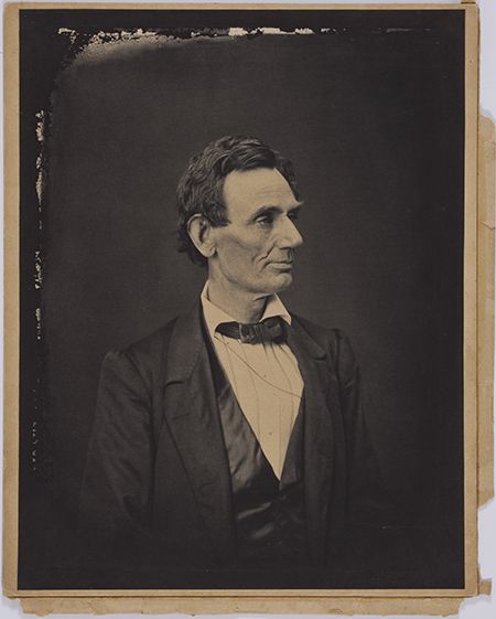 Superb platinum print portrait of Abraham Lincoln from an 1860 photograph by Alexander Hesler, printed by George B. Ayers in 1881. Image size 8" x 10" overall, blind embossed at bottom: G. B. AYRES COPYRIGHT 1881". The verso bears Ayres' manuscript notation: "Copyright Geo. B. Ayres Phila.". Some paper tape remnants remain affixed to margins on verso, otherwise fine condition. On June 3, 1860, Lincoln sat for photographer Hessler inside the former Old State House in Springfield, Illinois. Nominated for President by the Republican National Convention in Chicago only two weeks prior, Lincoln knew an updated represenative portrait of himself was needed for the benefit of potential voters who might want to see his likeness. Of the four known portraits Hessler shot that day, this image has become the most famous.