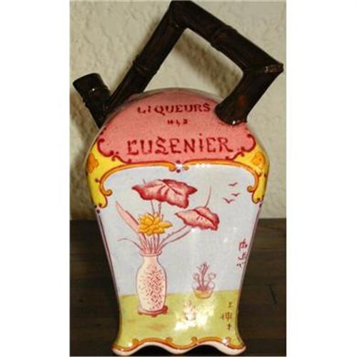 A rarely Sarreguemines(France)majolica jug for "liqueur CUSENIER"(absinte).VERY GOOD CONDITION.