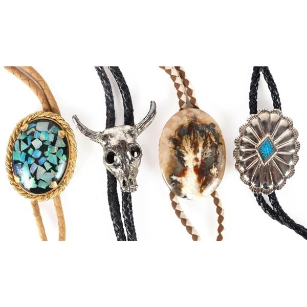 Collectible men's Western-style bolo ties to include one opal inset bolo tie, one polished cabochon stone bolo tie, one horn bolo tie and one fl...