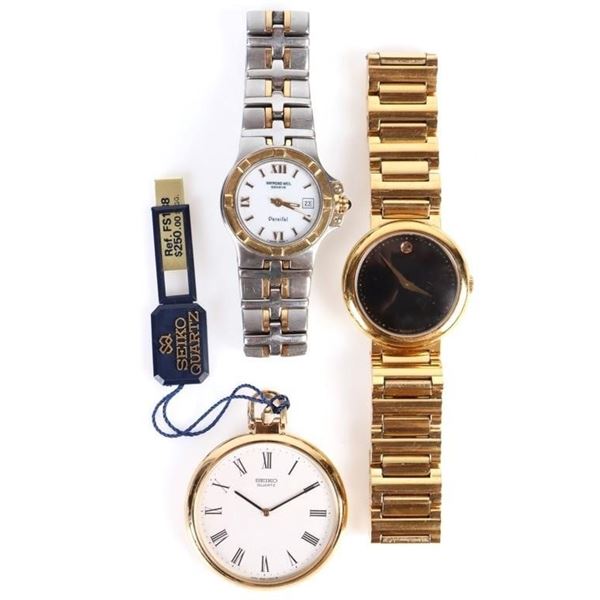 This lot includes three women's watches: a Raymond Weil Parsifal, a Movado MR, and a Seiko pocket watch. The Raymond Weil Parsifal is a sophisti...