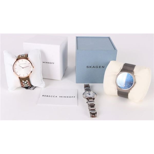 Collectible men's and women's watches to include one blue dial Bulova 96L215, one Rebecca Minkoff 2200095 ladies watch, and one Skagen Denma...