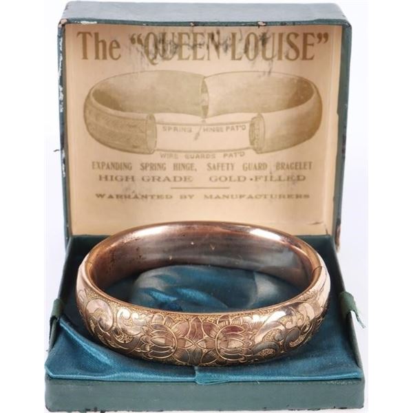 Vintage "Queen Louise" gold-filled bangle ornate ladies bracelet. Bracelet comes with original vintage box. Weight: 38.0 Grams Size: 8.0&q...