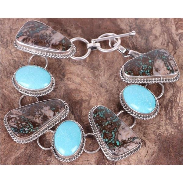 Turquoise and dyed stone sterling silver ladies bracelet. Stone Type: Aquamarine Weight: 47.4 Grams Size: 7.5" length Condition: Very fine.