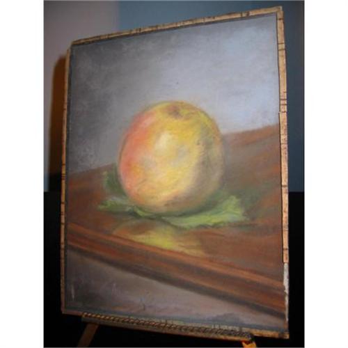 this delicate, magnificent art ignite the world of collectors. this pastel on board with untouched frame board, is rare peach "still life" fruit w background of soft pastel grey, and is signed by the artist in France - labeled on the back from Paris. it is an absolute collector's finds.... stand is f decorative purpose only and not included. it would look beautiful anywhere. although in delicate condition, it must be cared for. unable to verify artist's sign. but it's french. 9.5 " x 7.5 ".