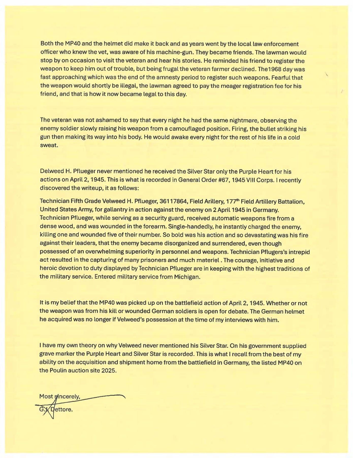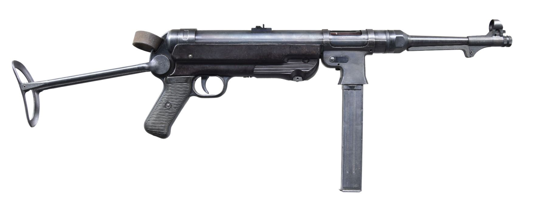 MP40 SUBMACHINE GUN, BATTLEFIELD PICKUP FROM THE EUROPEON THEATER OF WWII. Cal. 9mm. S# 44526. Bbl. 10". A beautiful example of an iconic, German, WWII era submachine gun w/ an interesting story, in amazing condition. It is accompanied by a copy of the original IRS Form 6, listing this firearm, dated February 15, 1946. It also includes an interesting record of events from an interview of the original owner of this firearm, Silver Star & Purple Heart recipient, Velweed Pflueger, about his experience in WWII, leading to the acquisition of this firearm. Of all the German WWII era SMGs, the MP40 may be the most iconic of them all. Its slow cyclic rate combined w/ decent sights & pleasant ergonomics make it as fun to operate as it is interesting to look at. It utilizes a very simplistic, yet incredibly smooth open bolt firing mechanism. The recoil system is typical of German over engineering consisting of a 3 piece telescoping rod w/ a captured spring that doubles as the connection point for the firing pin which slides inside of the bolt. The safety mechanism is an extremely simple design which shares commonalties w/ other WWII era SMGs. It consists of a rearward notch that interfaces w/ the cocking handle holding the bolt to the rear. This example was manufactured by Haenel. Early, first generation mag. housing which is smooth, w/ a square notch facing the shooter. All visibly numbered parts share matching numbers which is incredibly desirable & increasingly rare these days. The extruded receiver tube matches the grip frame, barrel, trigger housing, stock, bolt, barrel nut, rear sight & front sight. Hooded fixed blade front sight. Dual leaf rear sight is windage drift adjustable. Waffenamts appear on multiple parts including rear receiver just above folding stock mechanism "WaA254", front sight mechanism just forward of resting bar is also Eagle "37", front of receiver tube just rear of bbl. nut Eagle w/ "WaA44". Under folding stock, dark brown Bakelite grips & lower receiver cover. MAGS: 4 steel 32 rd. UNATTACHED ACCESSORIES: 1 original mag. loader, 1 spare barrel assembly, 2 3-mag. pouches & black, nylon Galati transport case. CONDITION: .Original finish on all exposed metal surfaces are remarkably complete & consistent w/ light thinning on high spots & in areas of mechanical intervention. Stock locks tight & remains firm as intended in both folded & extended positions. Grips appear in nice condition free of any obvious structural damage beyond some light handling marks under close examination. Bakelite receiver has a few light, typical use marks w/ a few very light scratches Bright bore w/ strong rifling. This is in amazing condition for a battlefield pickup in the Europeon Theater of WWII. Fire control mechanism appears to function correctly when cycled by hand. THIS IS A NATIONAL FIREARMS ACT CURIO & RELIC MACHINE GUN REQUIRING BATF TRANSFER BEFORE TAKING POSSESSION. FULLY TRANSFERABLE. (PROVENANCE) Copy of IRS Form 6 "Application For Importation of Firearms" dated 02/15/46, listing this firearm for Velweed Pflueger, obtained as a souvenir & letter from the consigner detailing his conversation w/ Mr. Pflueger, his time in WWII & how he obtained this firearm. (03-1844/JZ). CURIO. CLASS III. $18,000-28,000.
