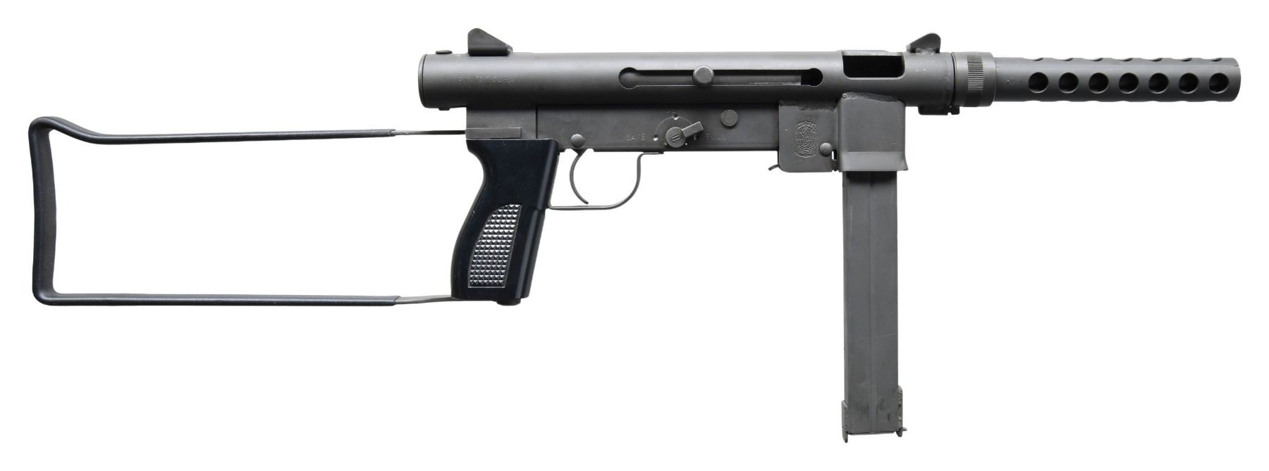WESSON MODEL 76 SUBMACHINE GUN. Cal. 9mm. S# U618. Bbl. 8". The Smith 76, as its commonly referred to, is a factory S&W open bolt SMG. It has a left side folding loop style stock. The tubular receiver is similar in aesthetics to the more commonly seen British Sten, although w/ the S&W the mag. protrudes from the bottom in a more traditional design. Dark black factory parkerized finish on exposed metal surfaces. The black plastic pistol grip is integral w/ the folding stock. The receiver incorporates two sling attachment points at approx. the 11 o'clock position. Protected post fixed front sight, fixed protected peep rear sight. Ambidextrous safety/selector. The bbl. nut is very similar in design to that of the combat proven Uzi SMG & utilizes an integral 6" slotted shroud to protect user from contacting a hot bbl. Left side marking on tubular receiver "SMITH & WESSON". Left side rearward of mag. well "Made in USA / Marcas Registradas / Smith & Wesson / Springfield, MASS." Safety/selector markings "Safe - Semi - Full". Right side marking tubular receiver above pistol grip "MOD76 U618". Safety selector markings repeated on right side. Right side rear of mag. well is large SW Trademark. MAGS: 3 steel 36 rd. UNATTACHED ACCESSORIES: Photocopied S&W 76 factory pamphlet & 2 blank firing barrels. CONDITION: All aspects indicate both light usage & proper care in storage. Parkerizing on exposed metal surfaces is complete & consistent w/ very little wear, aside from thinning in areas of mechanical intervention, which happens almost immediately. Folding stock locks correctly in open & closed positions & rubber coating is complete & free of any visible blemishing. Bright bore w/ well pronounced rifling. Fire control mechanism appears to function correctly when cycled by hand. NATIONAL FIREARMS ACT MG REQUIRING BATF TRANSFER BEFORE TAKING POSSESSION. FULLY TRANSFERABLE. (03-1891/JZ). CURIO CLASS III. $9,000-12,000.
