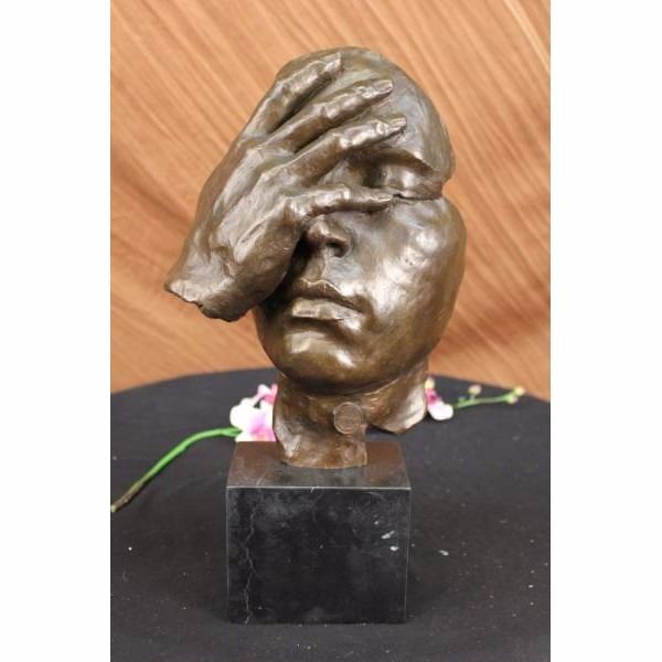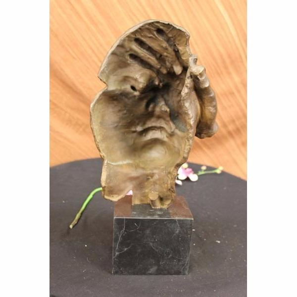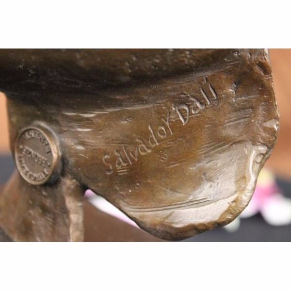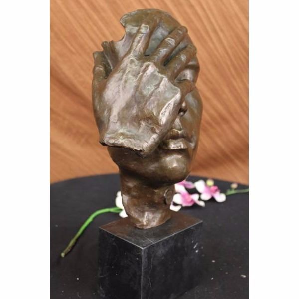 This unique abstract of a man putting hisright hand up against his face gently as heseem tobe in pain. He has his eyes close as if he could have a bad headache, he has no head its more of a creative way of making a modern sculpture. This would be the perfect gift for anyone who likes amazing and creative pieces. The hand and face has amazing details in each line and cut on it, giving it a even better and more outstanding look. This sculpture was casted using the ancient "Lost Wax Method" usingtwotone brownpatina. Mounted atop a black marble base, signed Salvador Dali. Condition: This sculpture is in perfect condition. Bronze Dimensions with Marble Base:Height 17" X Width 9" Marble Dimensions: 5" X 4" Height without base: 12" Weight : 15 LBS Inventory:61X21214516