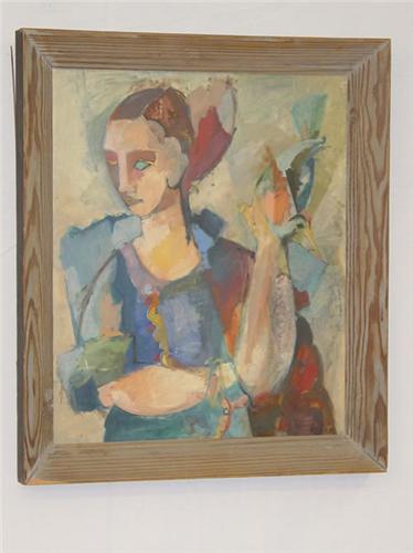 ABSTRACT OIL ON MASONITE MOUNTED CANVAS PORTRAIT OF A WOMAN HOLDING AN EXOTIC BIRD SIGNED HIGGINS IN A DEEP PINE FRAME (25" X 20 1/2") - LOSSES TO FRAME, IMPERFECTIONS