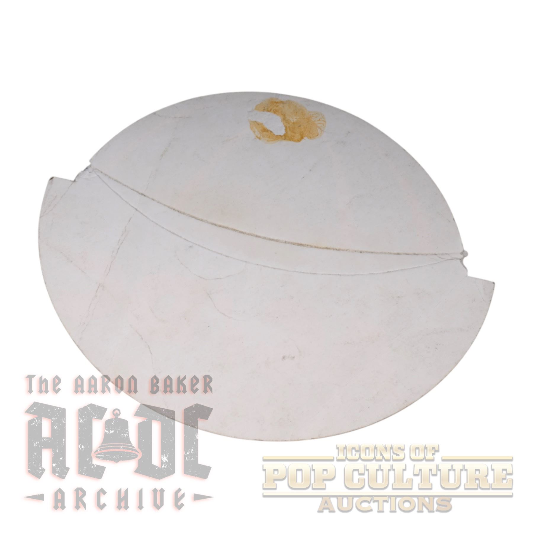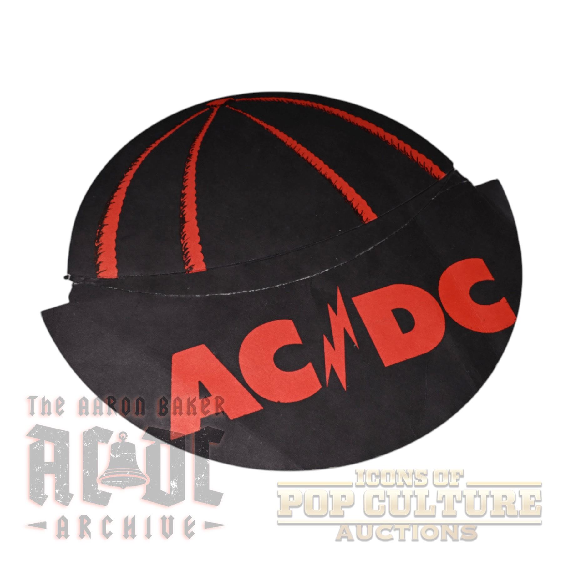 Original 1976 AC/DC promotional display piece created during the band’s early international rise following the release of High Voltage. Designed in the shape of Angus Young’s signature schoolboy cap, this die-cut cardstock piece, printed in black with bold red AC/DC lettering and lightning bolt detailing. Measuring approximately 9" x 8", it was distributed to record stores and at promotional events as part of the band’s Bon Scott–era marketing campaign. A distinctive and uncommon artifact from AC/DC’s formative years.