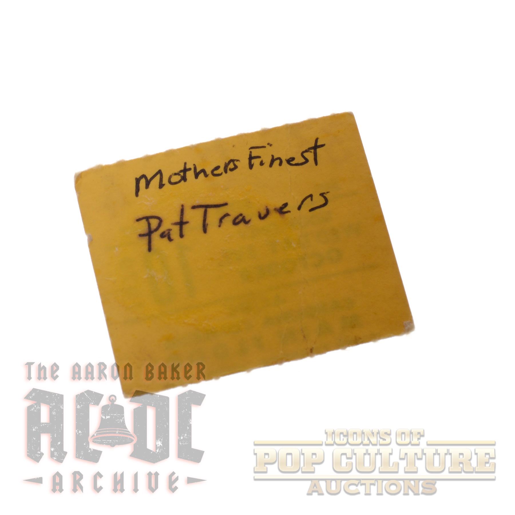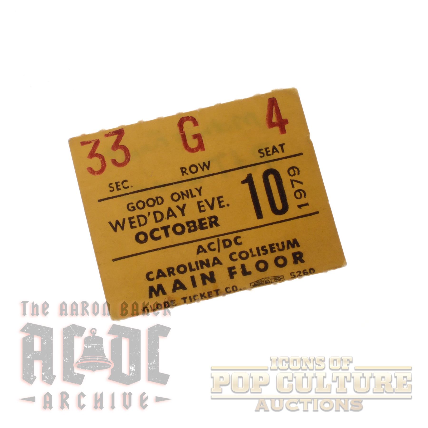 This is an original 1.5" x 1.25" ticket stub from AC/DC’s October 10, 1979 show at the Carolina Coliseum in Columbia, South Carolina. Part of their landmark Highway to Hell U.S. tour, this performance featured Bon Scott, just months before his untimely passing. Printed by Globe Ticket Co., the stub shows Section 33, Row G, Seat 4, and lists AC/DC as the headliner with handwritten notes on the back adding “Mother’s Finest” and “Pat Travers” as support acts. A small but powerful artifact from a thunderous night of hard rock history in the Deep South.