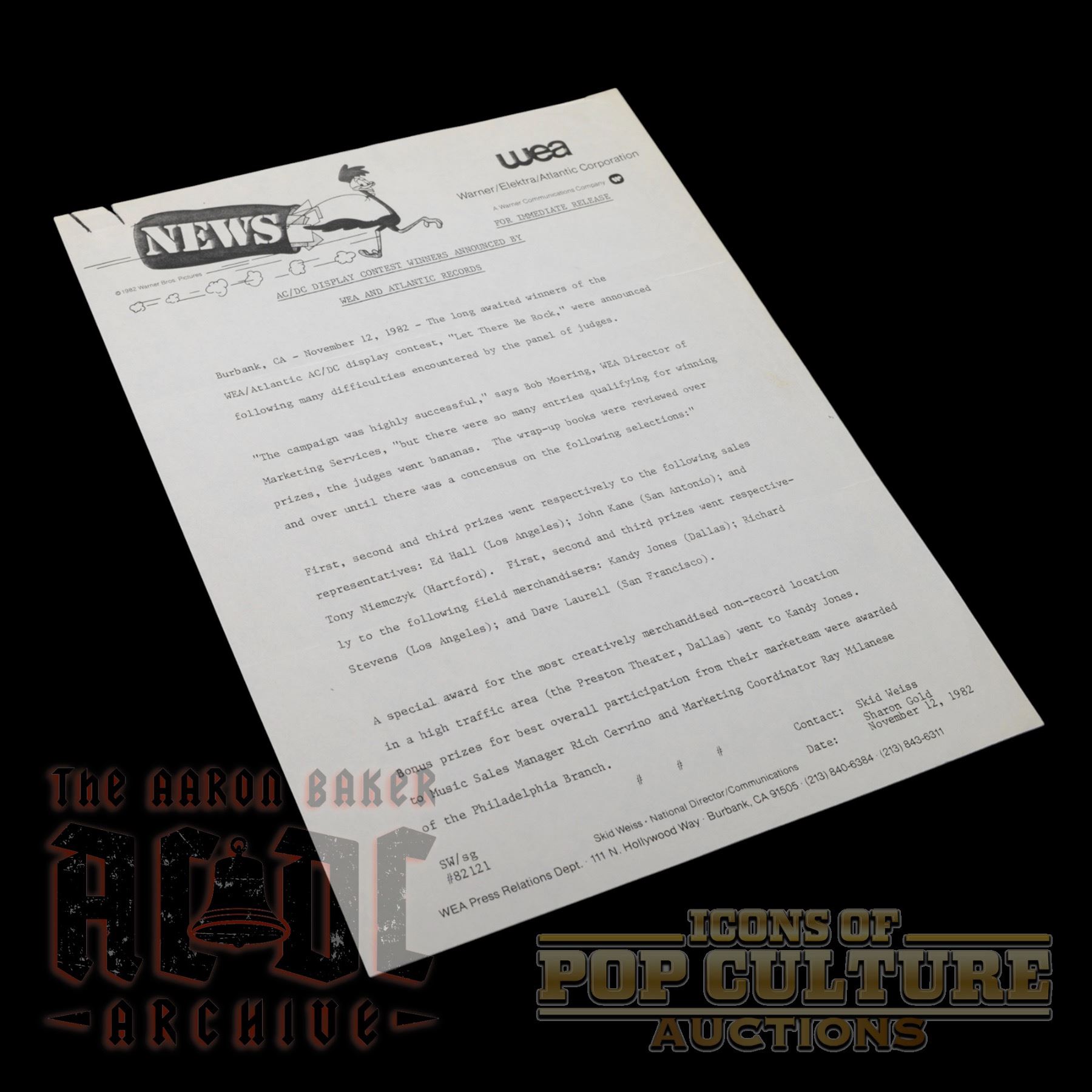 This is an original press release issued by Warner/Elektra/Atlantic (WEA) Corporation and Atlantic Records dated November 12, 1982, announcing the winners of the nationwide AC/DC “Let There Be Rock” display contest.