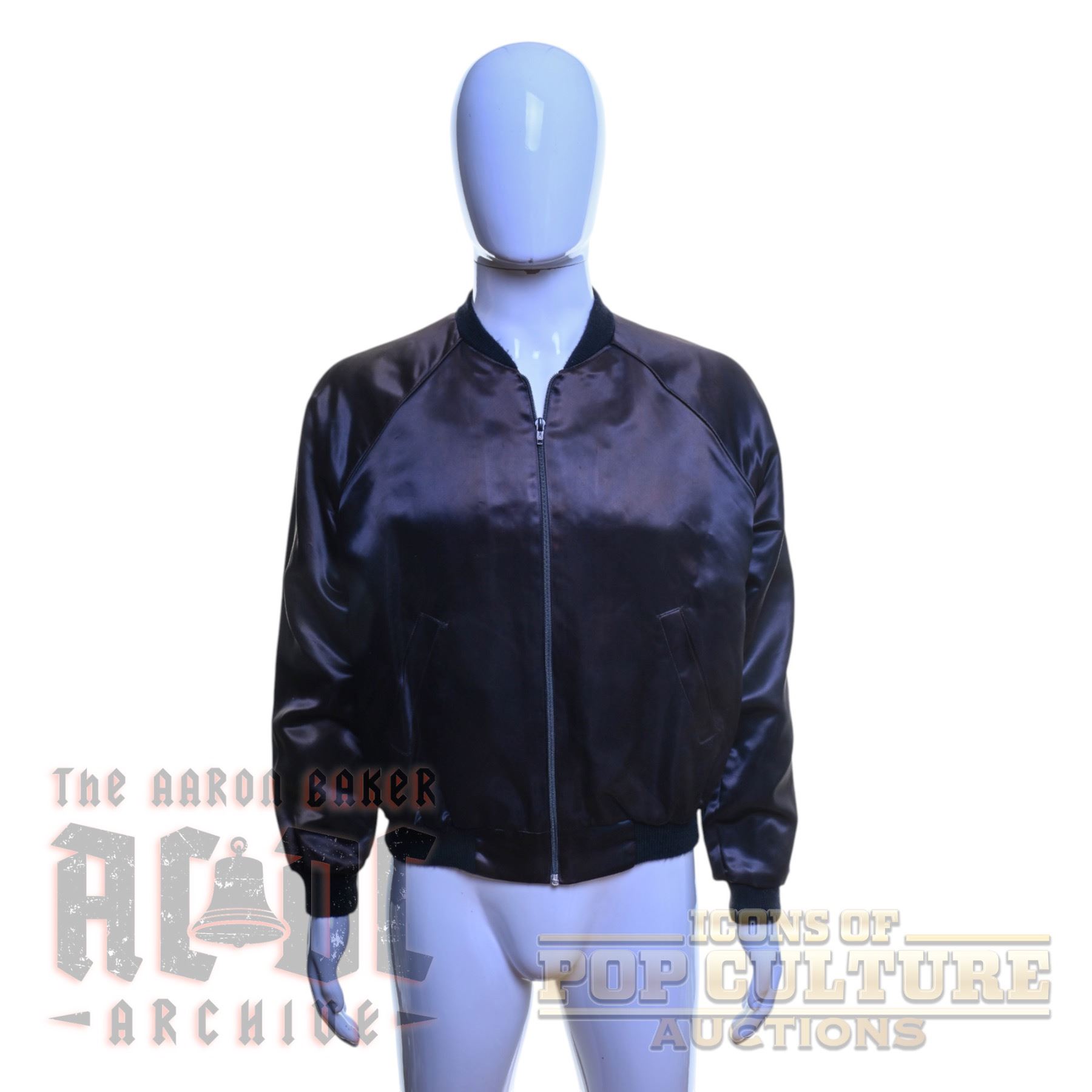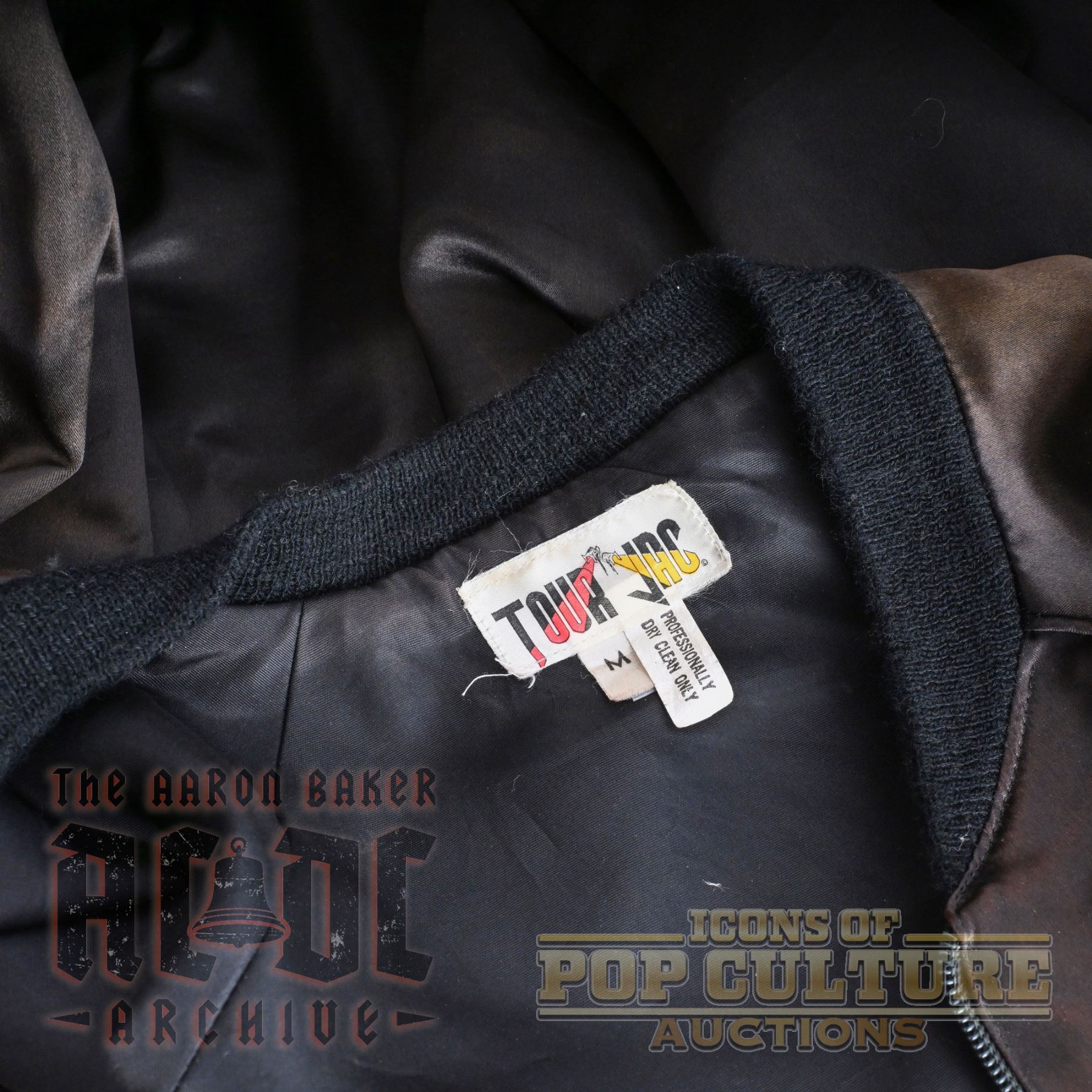 This AC/DC satin tour jacket, size medium, is from the band’s 1983 USA Tour. Produced by Tour Inc., the jacket is black with a zip front and ribbed cuffs, collar, and waistband. The back features bold embroidery of the AC/DC logo in yellow and red, surrounded by flames, with “USA Tour 1983” stitched underneath. The front is plain black, giving the fiery back design extra impact. A vintage piece of official tour merchandise, this jacket captures the energy of AC/DC’s early 1980s touring era and is a must-have for collectors.