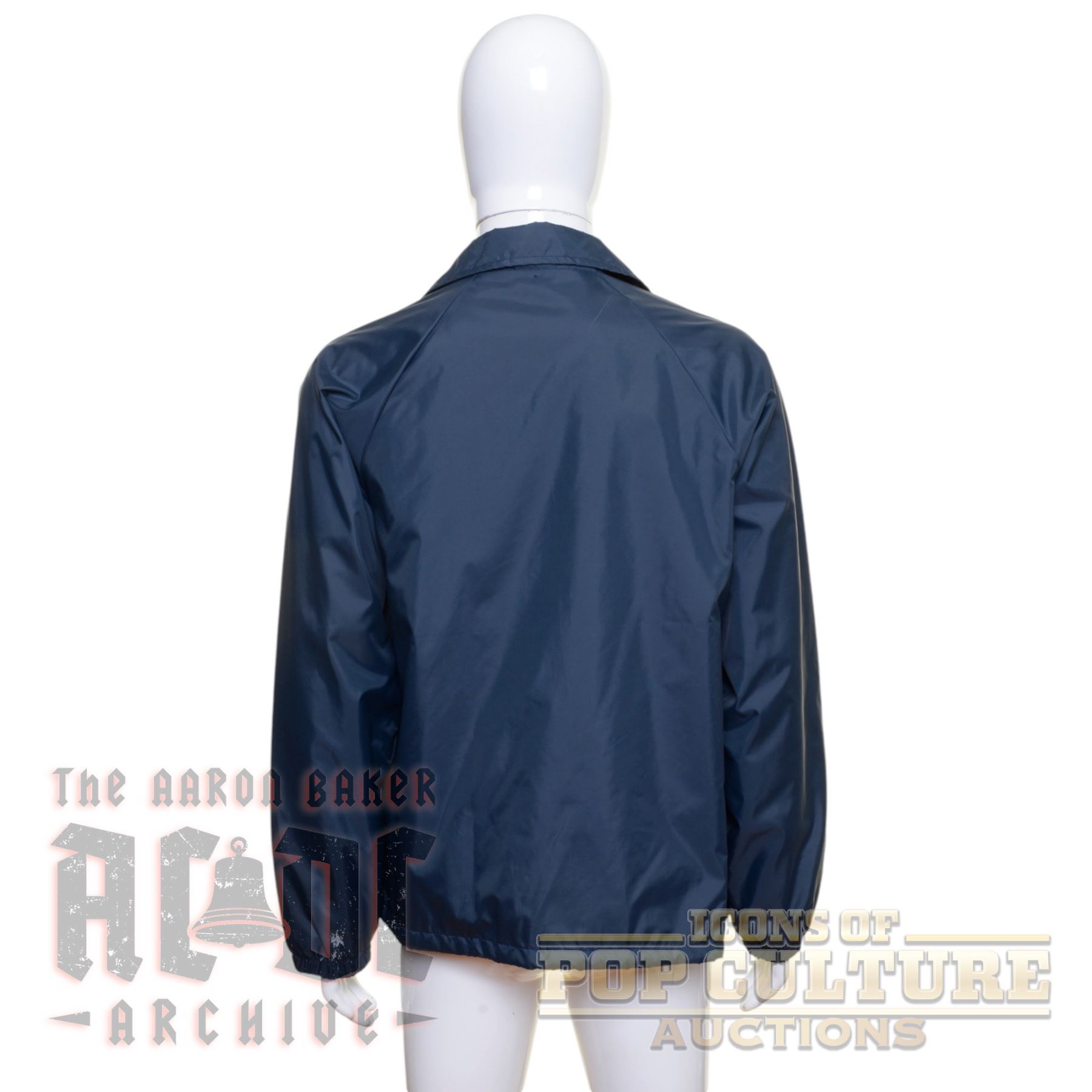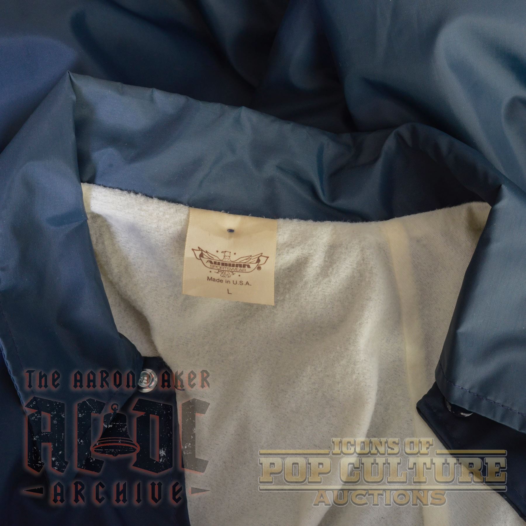 Issued to a crew member during AC/DC’s Blow Up Your Video World Tour in 1988, this size large, USA-made windbreaker features the band's embroidered logo on the chest. The lightweight navy shell is lined with soft fleece and shows only minor wear from use on the road. A rare and authentic piece of tour history from AC/DC’s explosive late-’80s era.