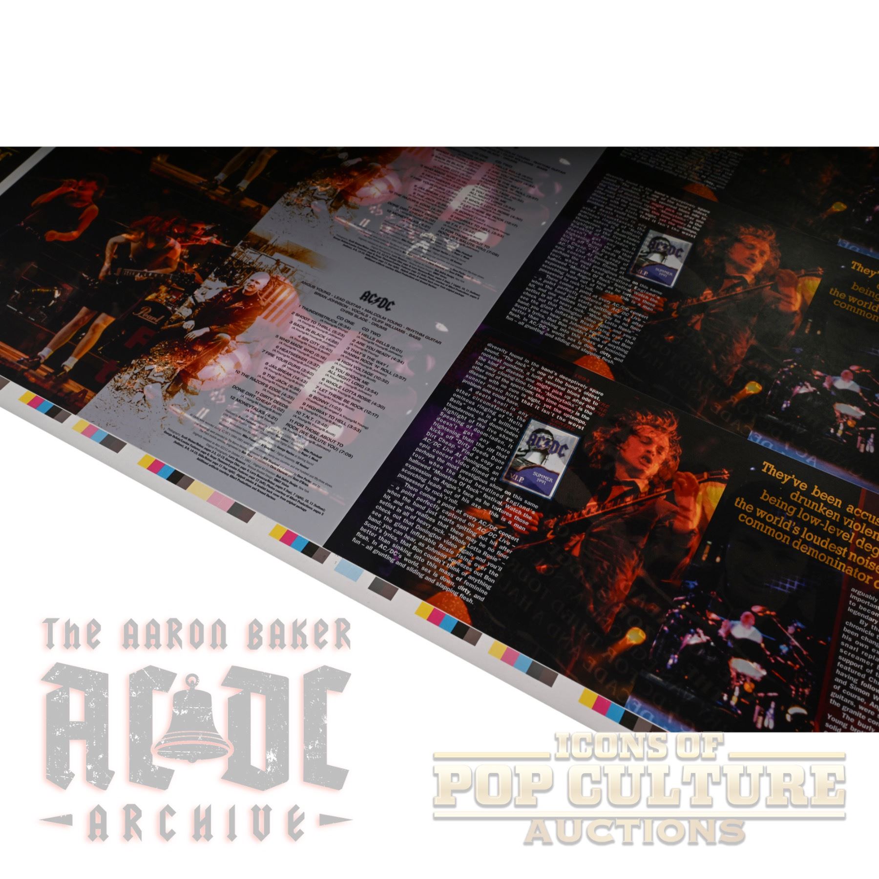 Offered here is an original 40" x 21" full-color two-sided printer’s proof sheet created for a compact disc release of AC/DC’s Live album, first issued in 1992. The sheet displays multiple repetitions of the CD packaging artwork, including front and back covers, booklet panels, and inner tray designs, all laid out for pre-production alignment. Printer’s proofs were produced by print houses for quality checks on image clarity, registration, and color accuracy prior to mass production. Never intended for public sale, these sheets are rare artifacts directly connected to the production process. This proof represents AC/DC’s powerful live album era, capturing the band’s explosive stage presence and offering a unique collectible tied to the group’s history.