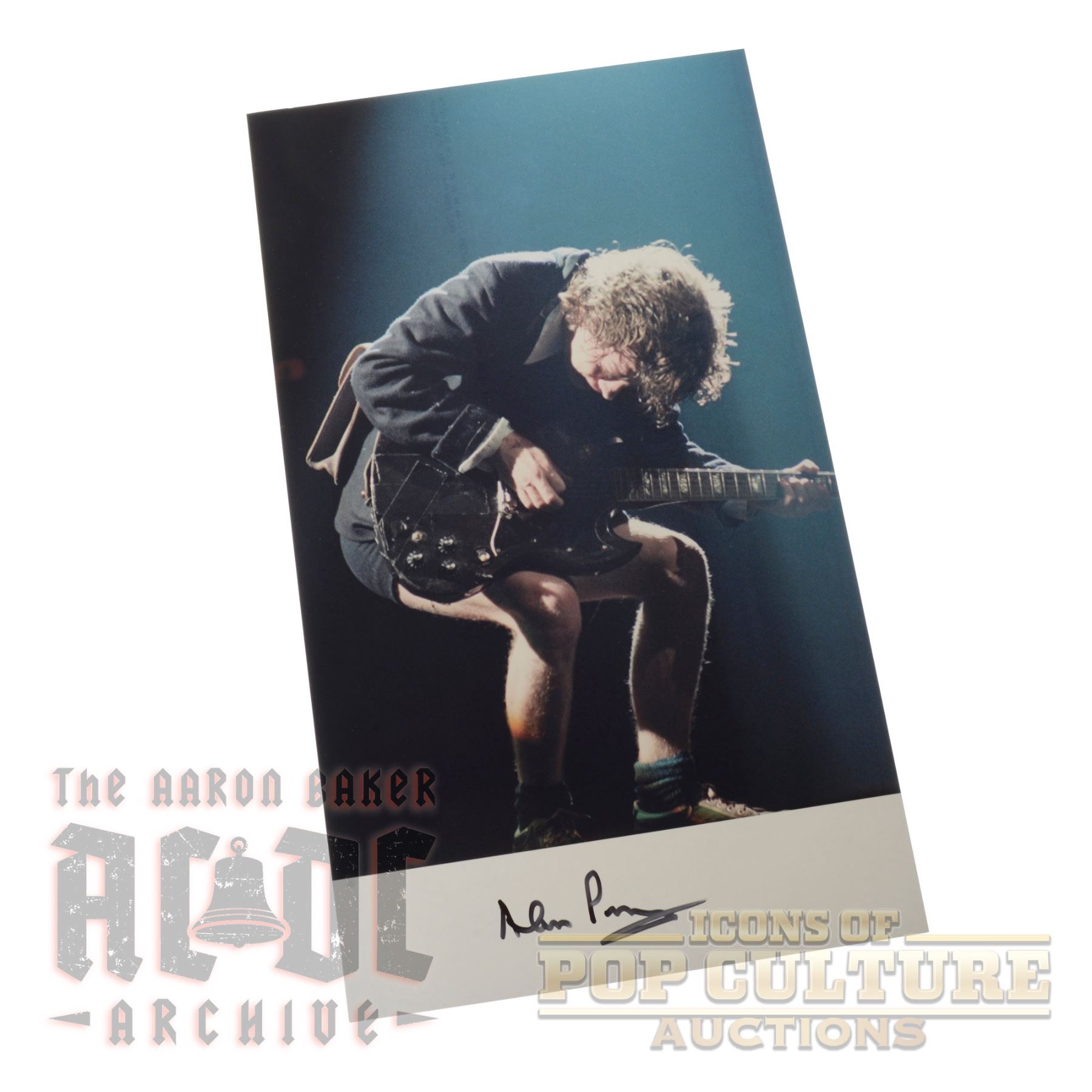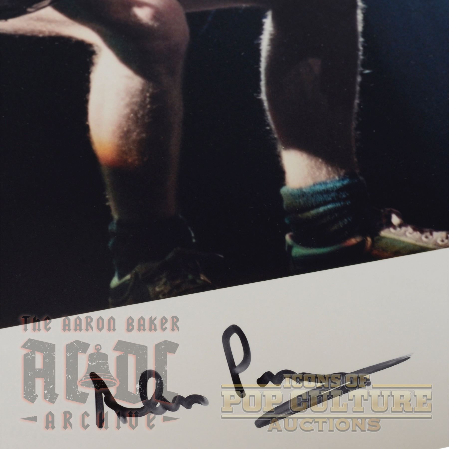 An 8" x 14" color photographic print of AC/DC’s legendary lead guitarist Angus Young, captured on stage by renowned rock photographer Alan Perry. Dressed in his signature schoolboy outfit, Angus is seen in a moment of deep focus, seated low with his Gibson SG, lost in the intensity of performance. Dramatic lighting casts a powerful spotlight over the scene, highlighting both the raw emotion and theatrical energy that define Angus’s stage presence. The image features a clean white lower border with Perry’s bold signature in black ink, making it a striking collectible for any AC/DC fan.