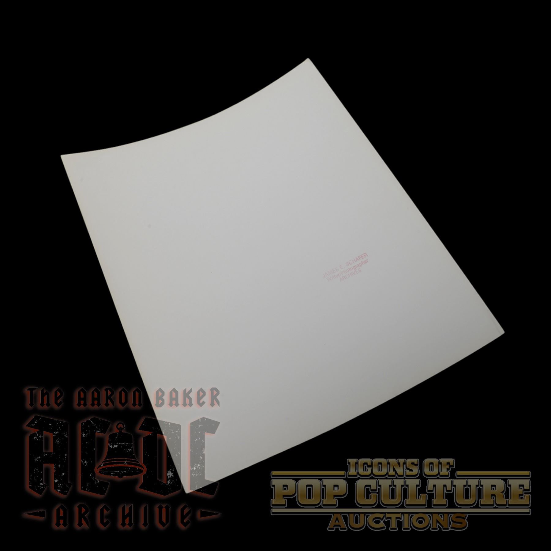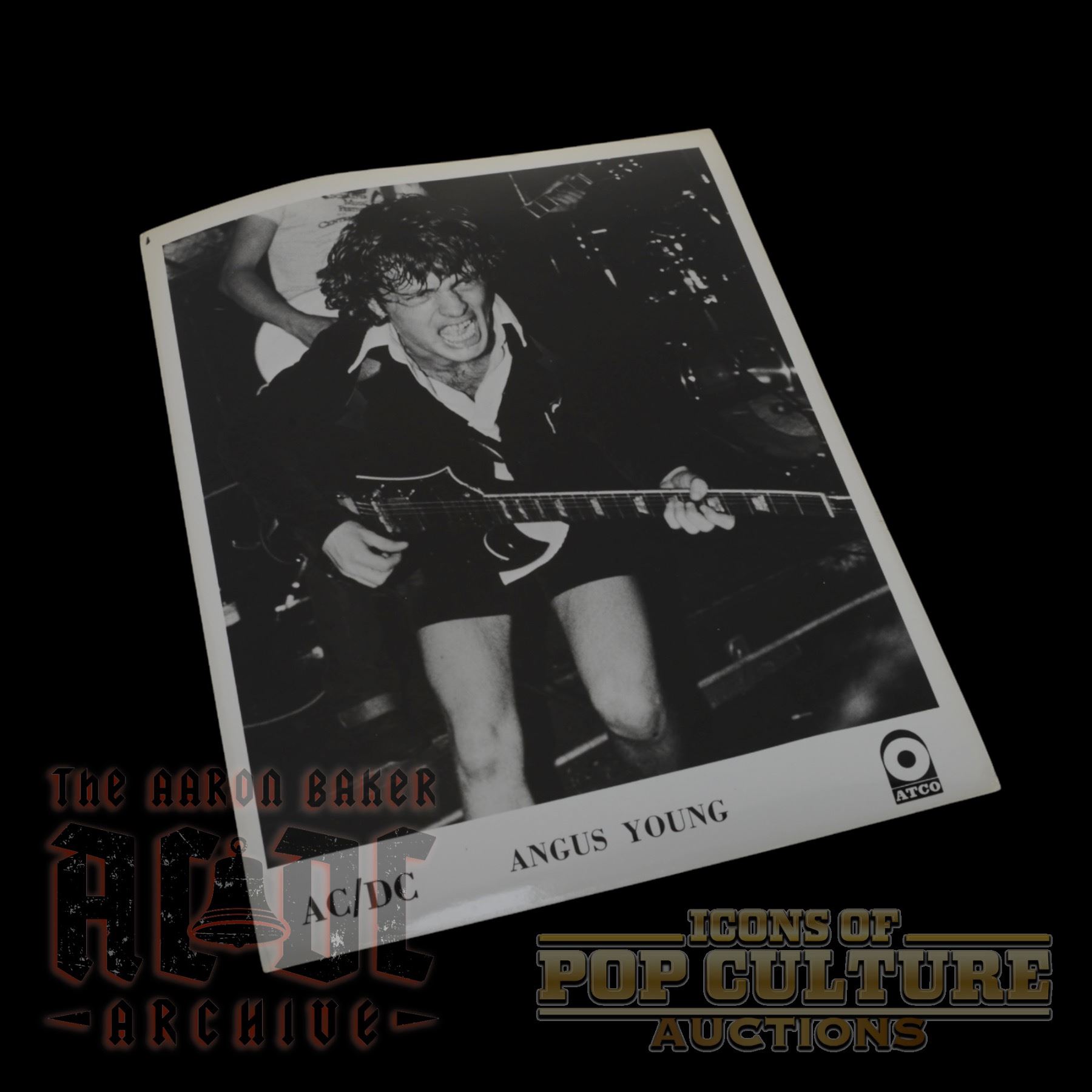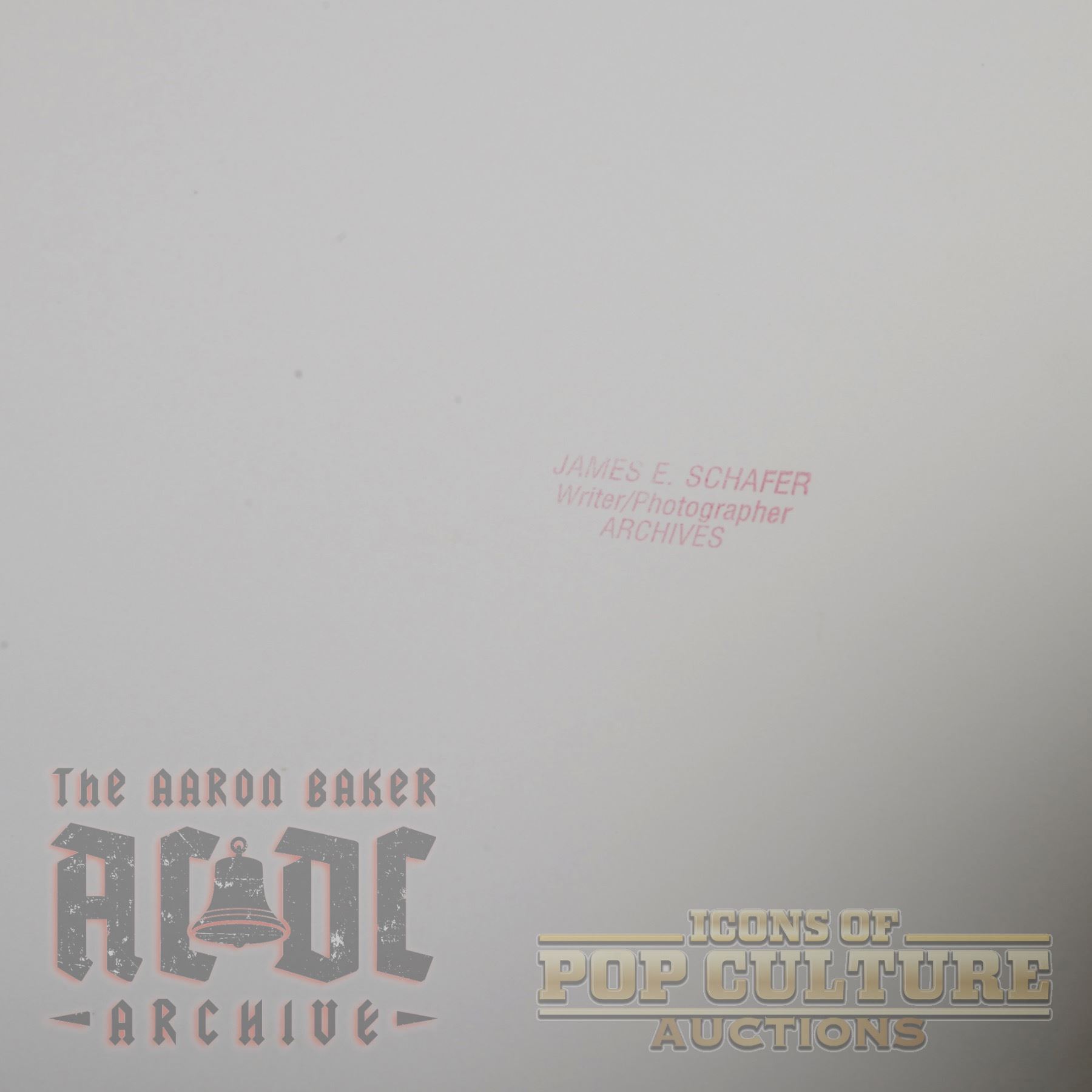 Original 8" x 10" black-and-white ATCO Records press photograph of Angus Young of AC/DC, captured mid-performance in his iconic schoolboy uniform and playing his signature Gibson SG guitar. The high-energy image showcases Young’s trademark stage presence, with the ATCO Records logo printed at the bottom. The reverse bears the photographer’s archival stamp, reading “James E. Schafer, Writer/Photographer Archives,” confirming its provenance from Schafer’s collection.