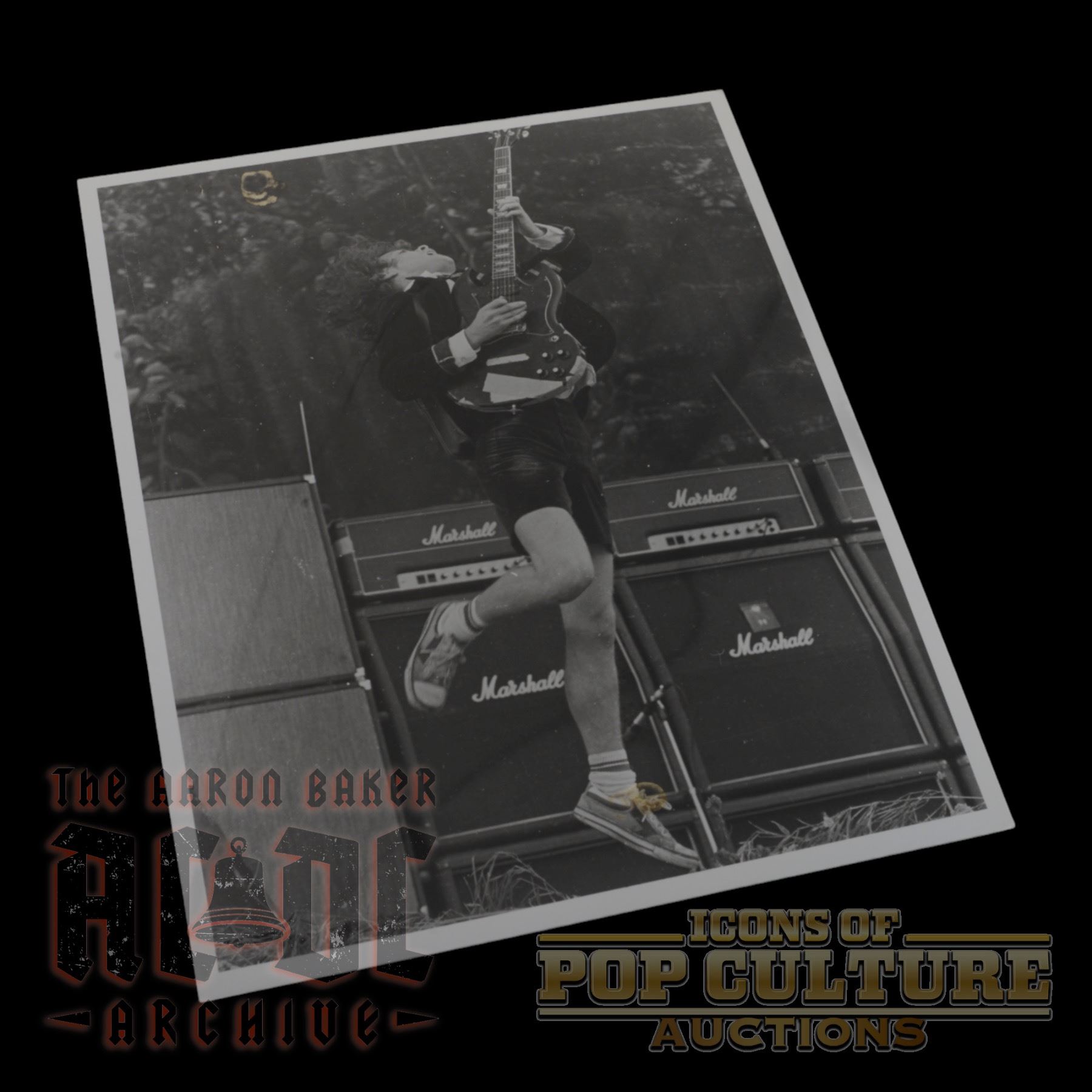 Original 8" x 10" black-and-white photograph of Angus Young of AC/DC captured mid-performance in his signature schoolboy uniform, playing his iconic Gibson SG guitar. The image shows Young in a dynamic jump, framed by a backdrop of towering Marshall amplifiers, embodying the high-energy stage presence that has defined AC/DC’s live shows for decades.