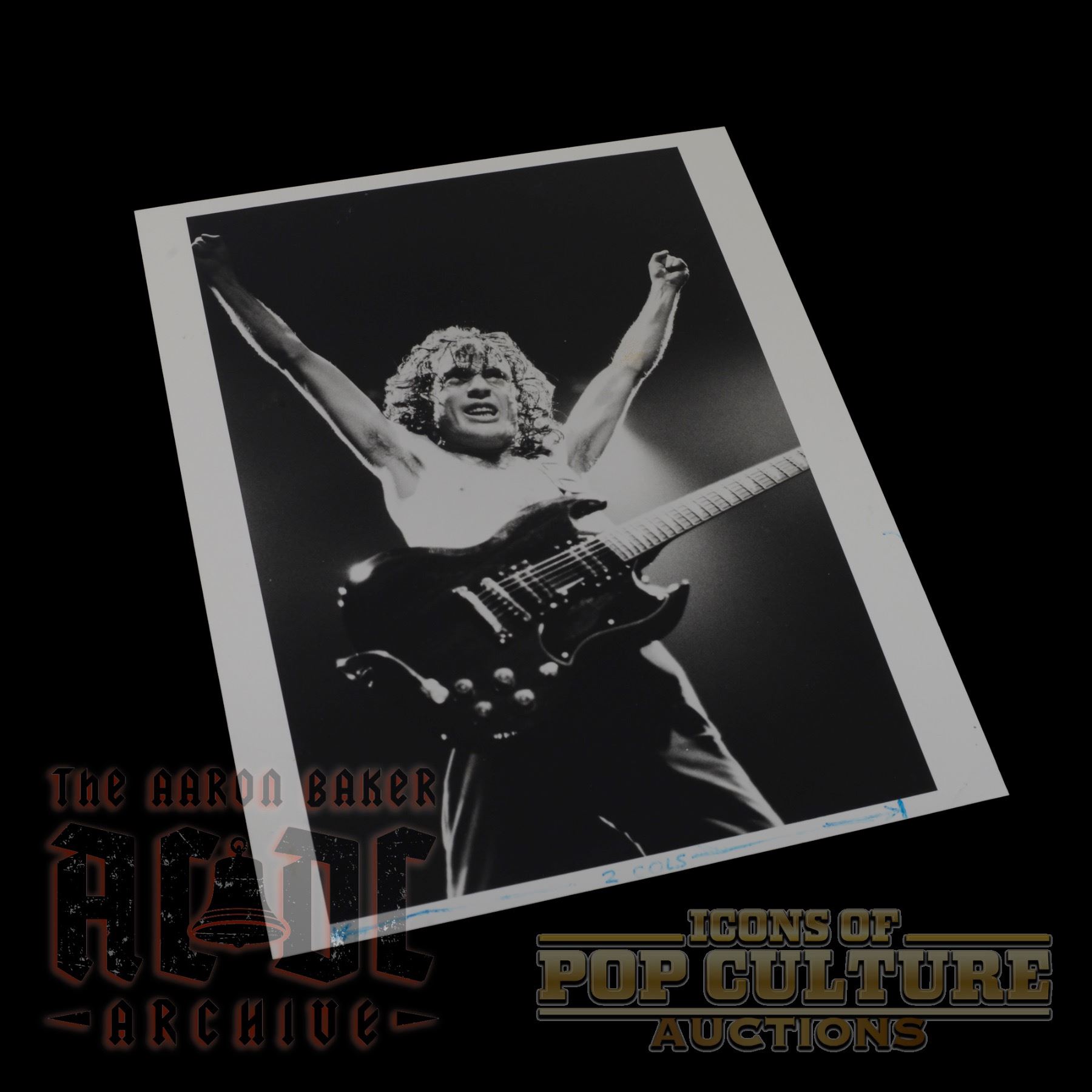 Presented here is an original 8" x 10" black-and-white photographic print capturing AC/DC’s legendary guitarist Angus Young in full performance mode. Shot mid-concert, the image showcases Angus with arms raised triumphantly, his Gibson SG slung across his body, embodying the raw power and energy that defined AC/DC’s live shows. The back of the photo is stamped with his name and band, “Angus Young / AC/DC,” along with handwritten editorial notations, indicating its original use as a press or publication photo. A striking piece of rock photography, this print immortalizes Angus in his element, sweaty, fierce, and larger than life, making it a must-have for any serious AC/DC collector