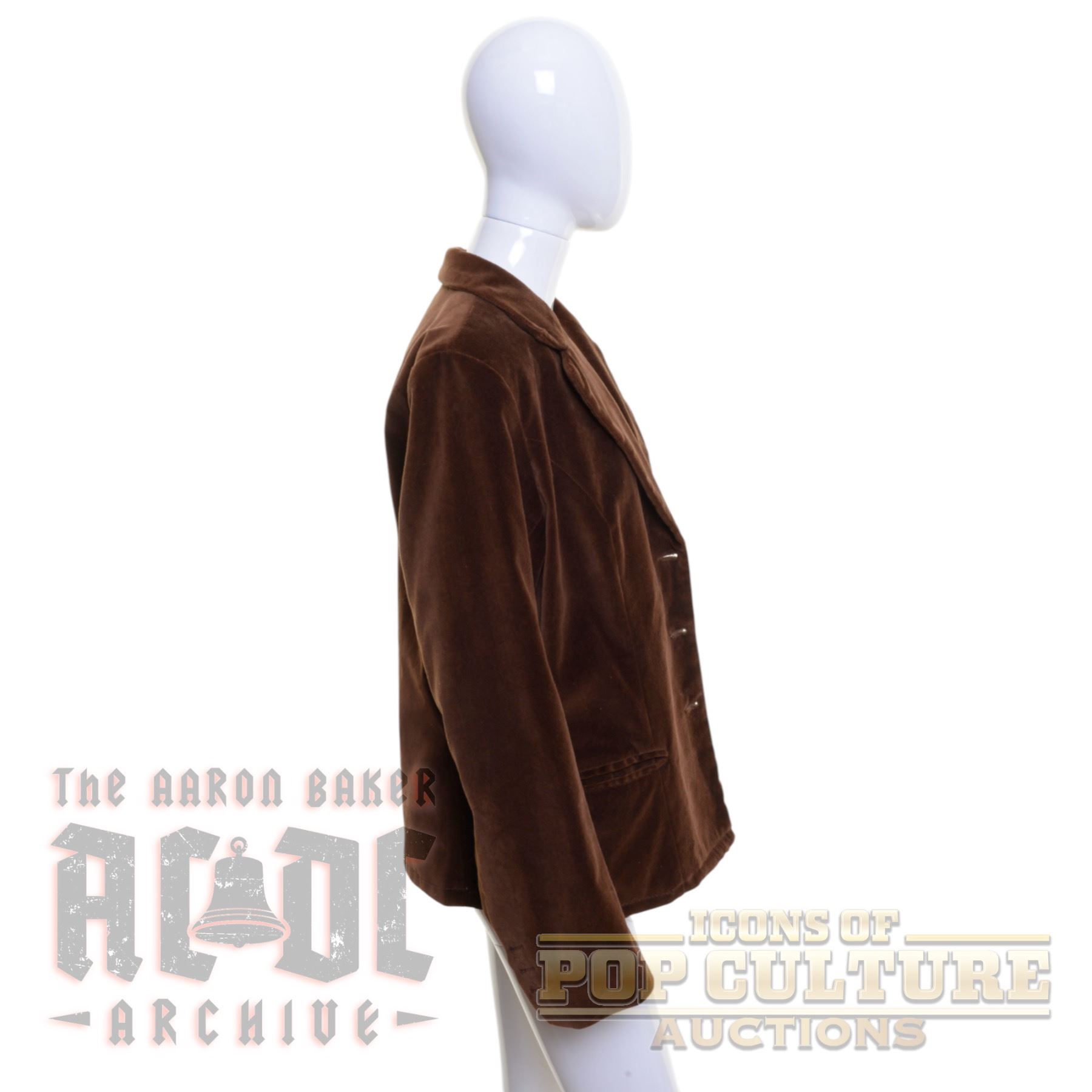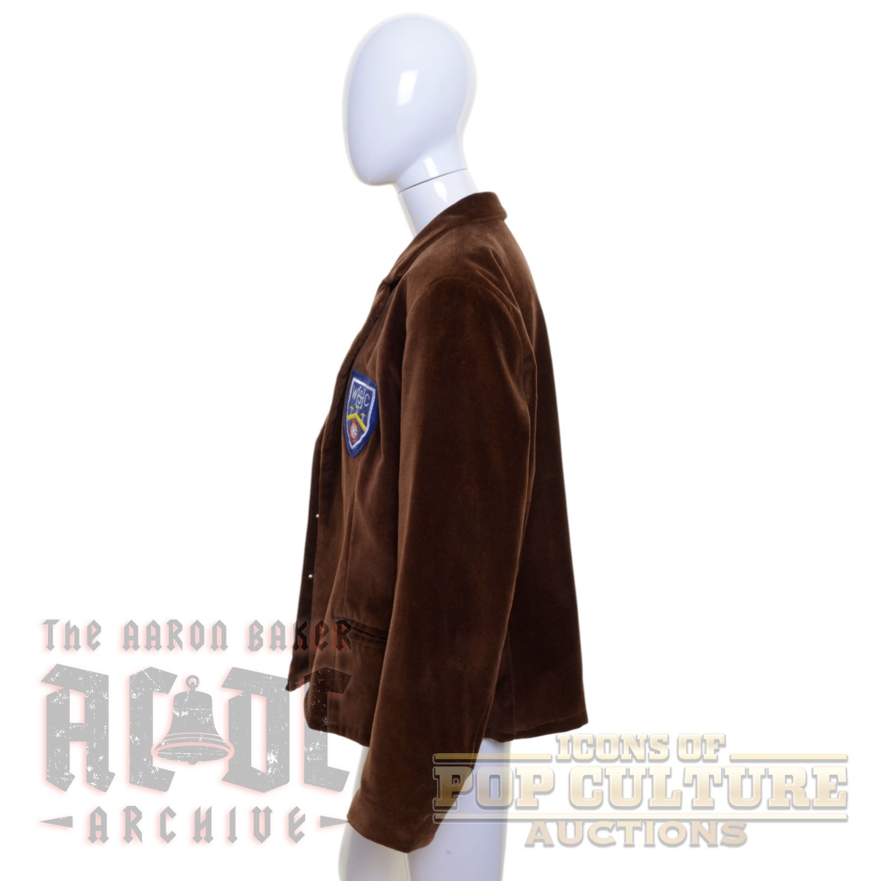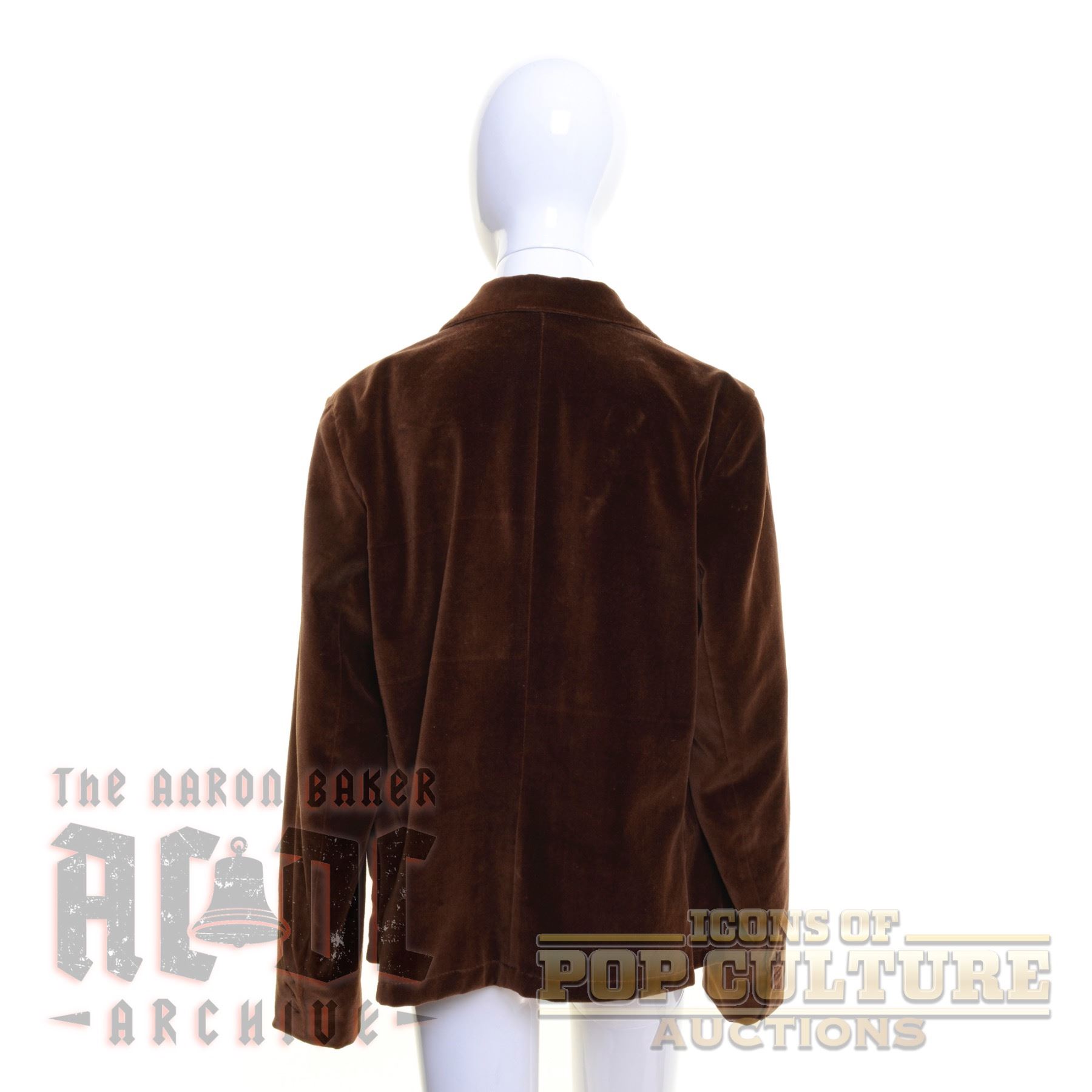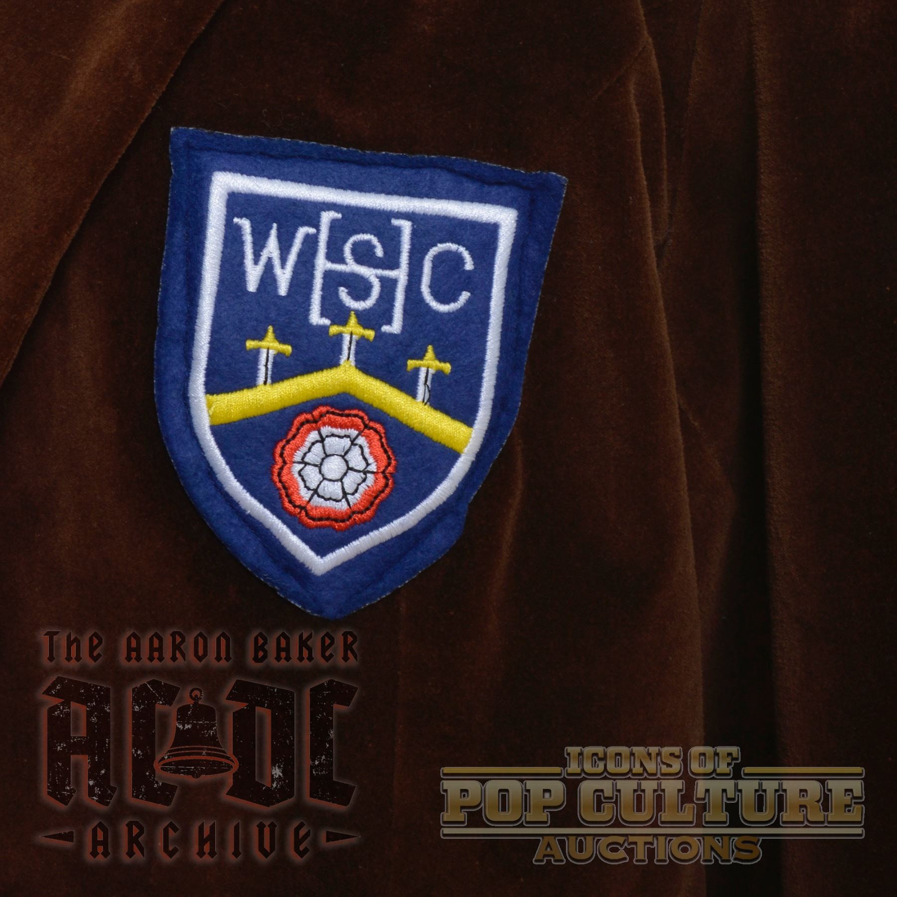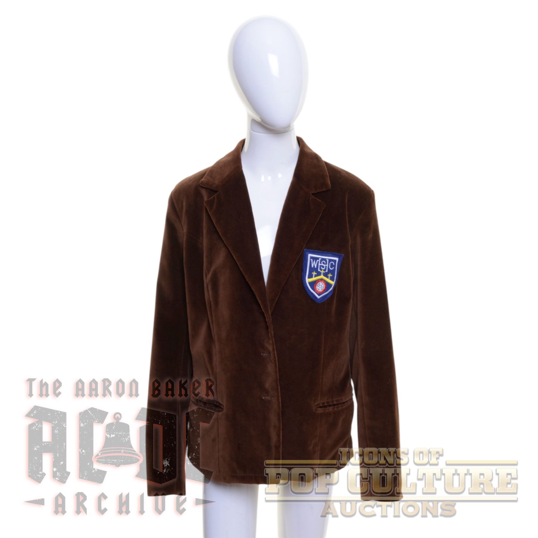 This brown crushed velvet schoolboy-style blazer stands as an unmistakable symbol of rock history, worn on stage by AC/DC’s legendary guitarist, Angus Young. Renowned for his high-energy performances and trademark schoolboy attire, Angus transformed this look into one of rock’s most iconic stage costumes. The blazer features a blue and gold embroidered crest reading “WSC” on the chest—evoking the mischievous, academic persona that became synonymous with his electrifying performances. Crafted in soft, rich velvet with classic lapels and front pockets, the jacket perfectly captures the playful sophistication of Angus’s onstage image.