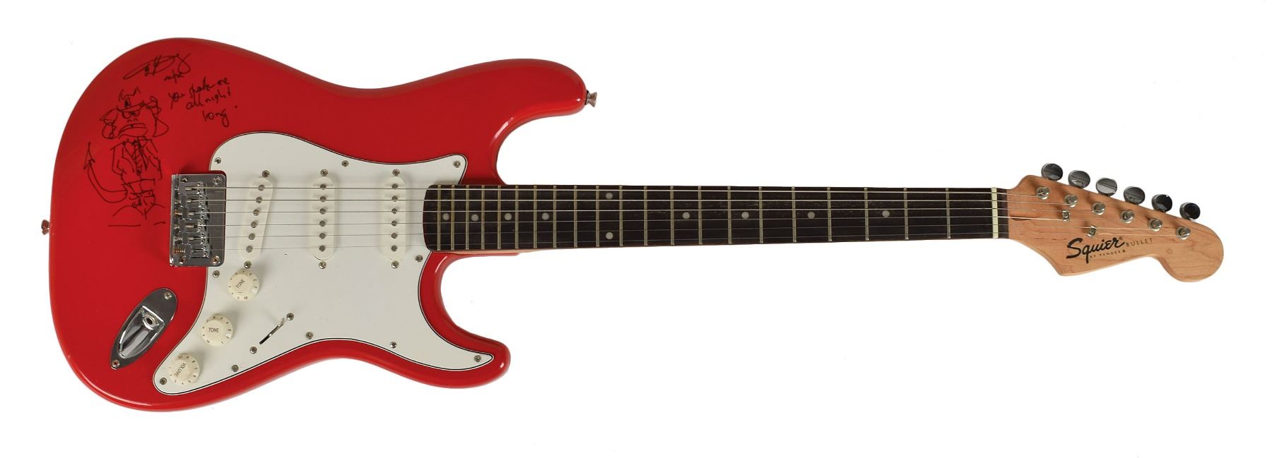 Red-bodied Fender Squier Bullet Strat electric guitar, signed on the body in black felt tip, "Angus Young, AC/DC, You shook me all night long," with Young adding a wonderful full-length 'devil' sketch of himself below. In fine condition, with a few small dings and nicks to body, the majority on the back side. Accompanied by a gig bag. Originally obtained by in-person specialist Mike Wehrmann.