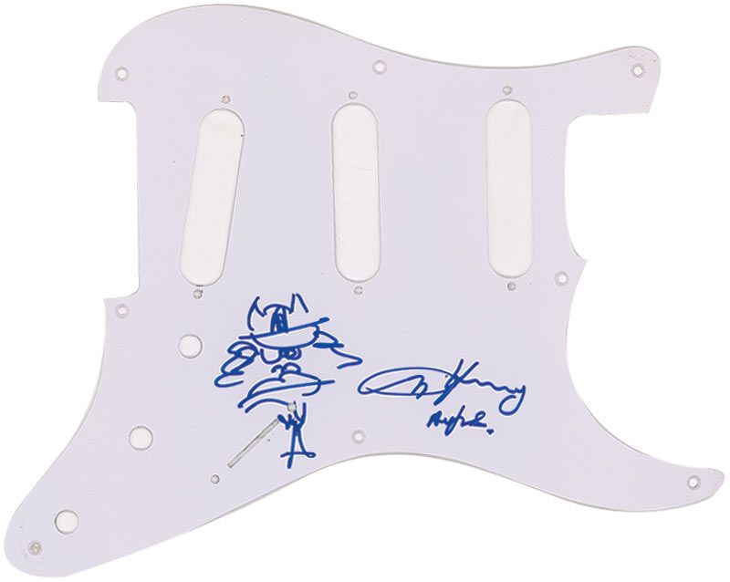 White pickguard for a standard-size strat, signed in blue felt tip, “Angus Young, AC/DC,” and adding a self-portrait caricature sketch, complete with devil horns. In fine condition, with a few trivial surface marks.