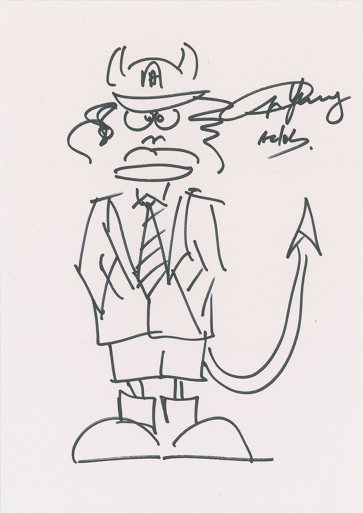 Fantastic original self-portrait sketch accomplished in felt tip by Young on a white 8.25 x 11.75 sheet, signed in the upper right, "Angus Young, AC/DC." Young draws himself in one of his famous and immediately recognizable schoolboy-uniform stage outfits. In very fine condition.