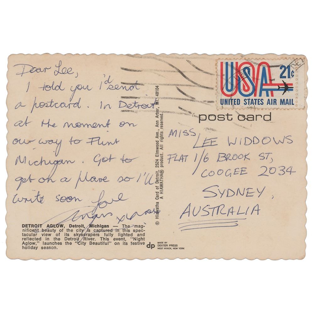 ALS signed ‰ÛÏAngus, xxxx,‰Û penned on the reverse of a 5.75 x 4 postcard of Detroit, Michigan, December 1977. Handwritten letter to his girlfriend, Lee Widdows, in full: "I told you I'd send a postcard. In Detroit at the moment on our way to Flint, Michigan. Got to get on a plane so I'll write soon." In fine condition.