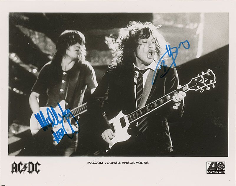 Glossy 10 x 8 Atlantic Record publicity photo, signed in-person in blue felt tip by Malcolm and Angus Young. In fine condition. Originally obtained by in-person specialist Mike Wehrmann.