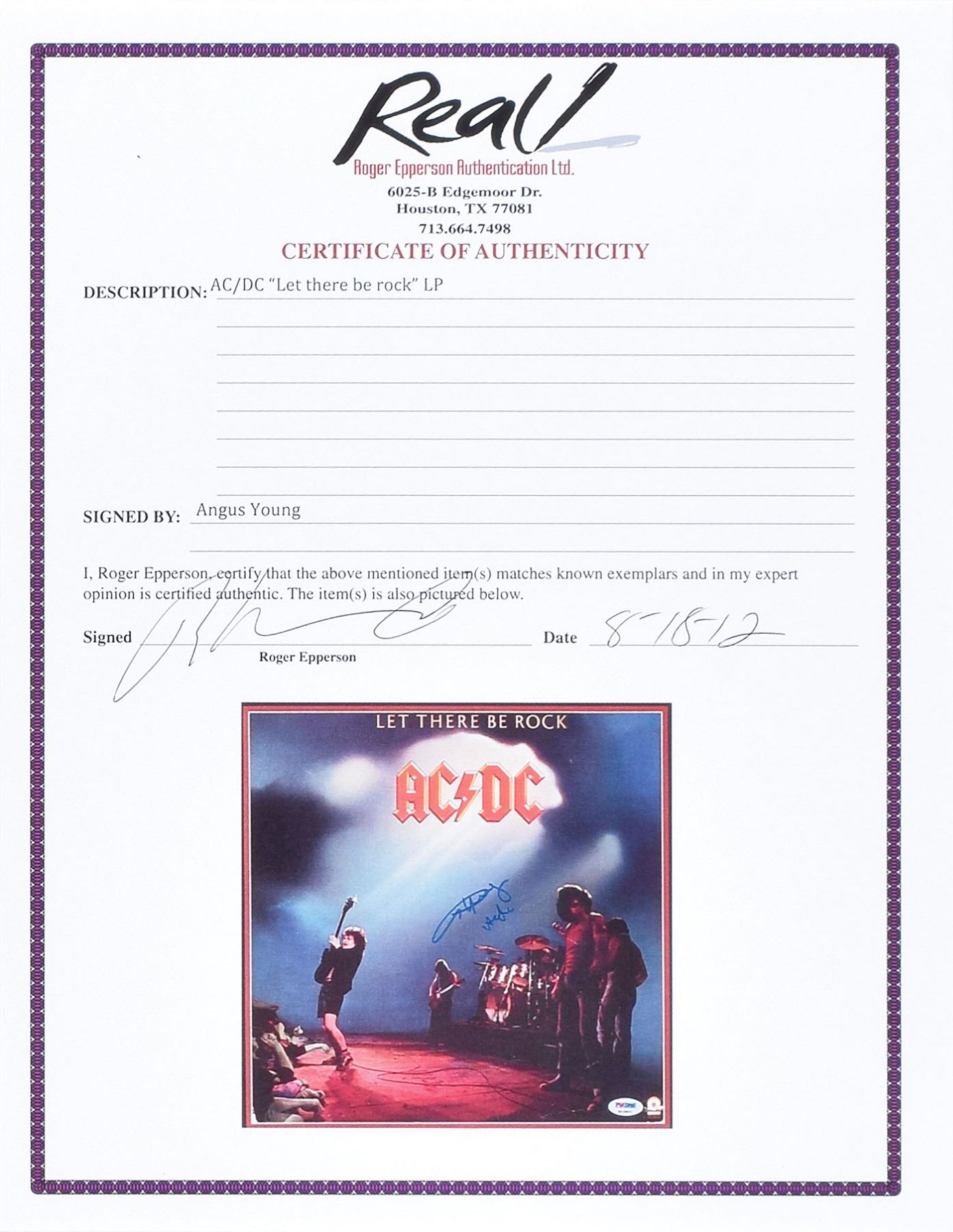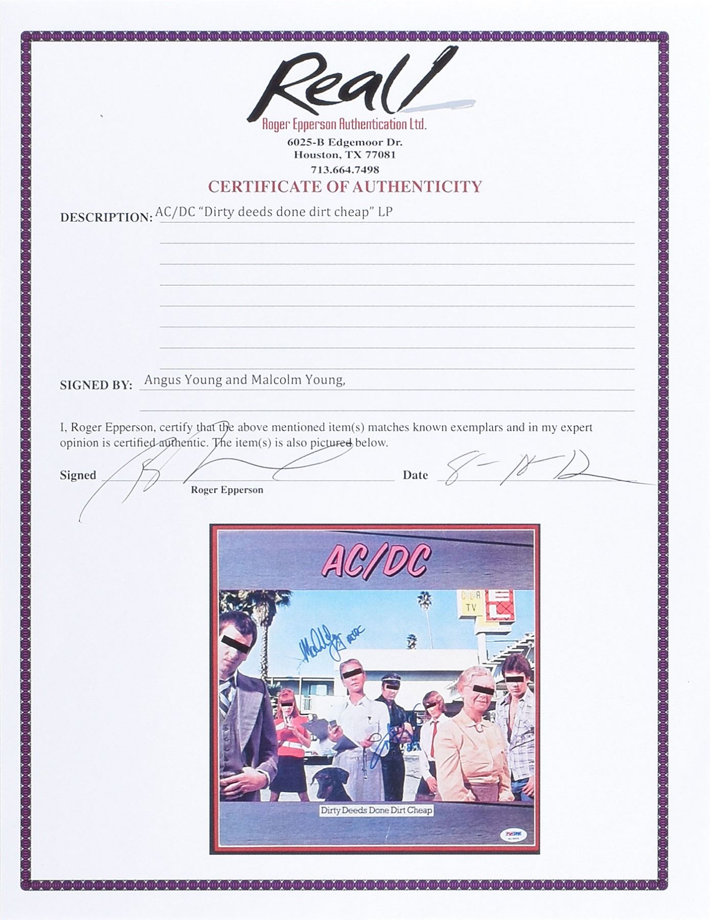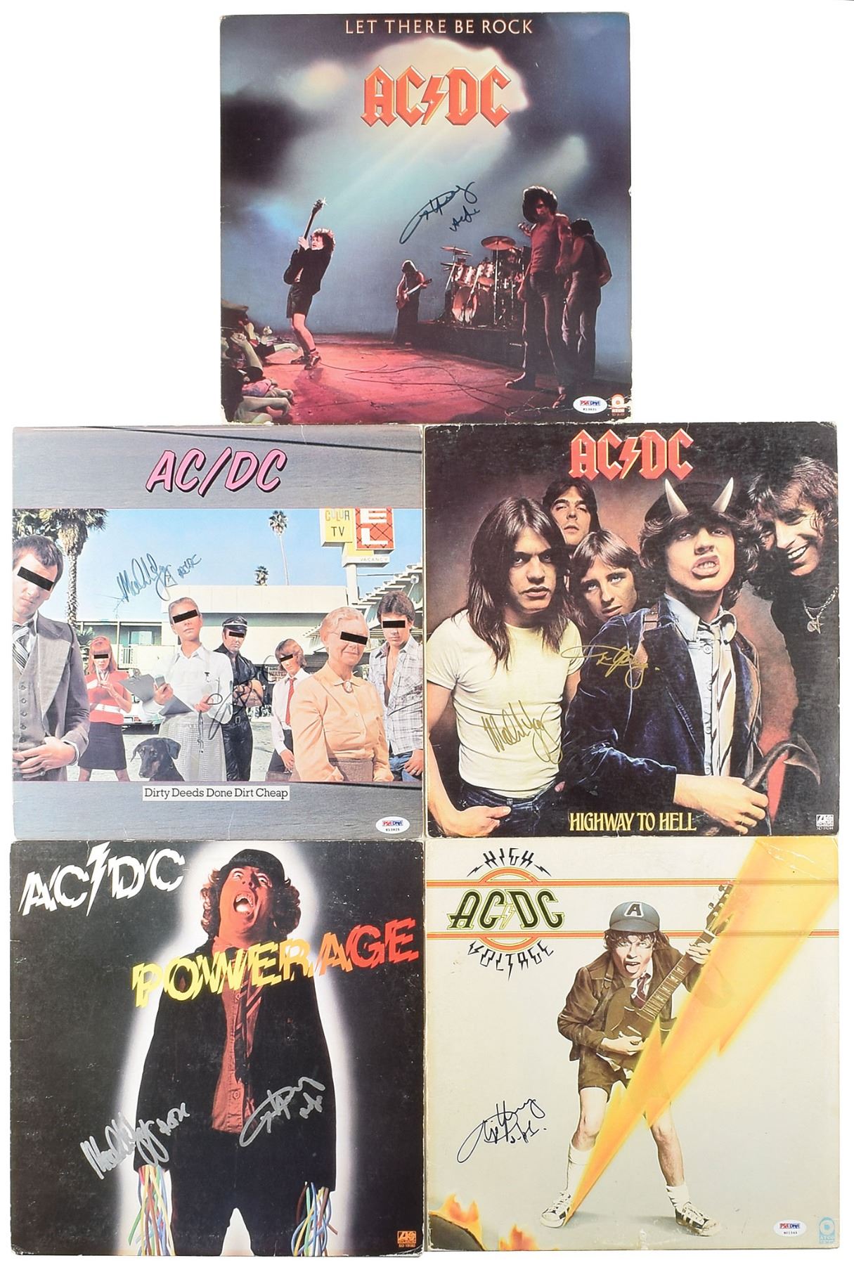 Five AC/DC albums signed on the front cover in ink or felt tip by Angus Young, with three also signed by his brother Malcolm. Album titles include: Dirty Deeds Done Dirt Cheap (both), High Voltage, Highway to Hell (both), Let There Be Rock, and Powerage (both). In overall very good to fine condition. The records are not included. Accompanied by full letters of authenticity from JSA for Highway and Powerage, full letters and certificates of authenticity from REAL and PSA/DNA for Let There and Dirty Deeds, and a certificate of authenticity from PSA/DNA for High Voltage.