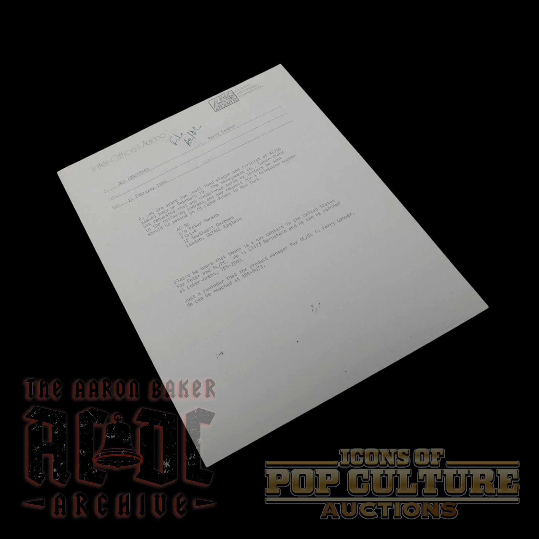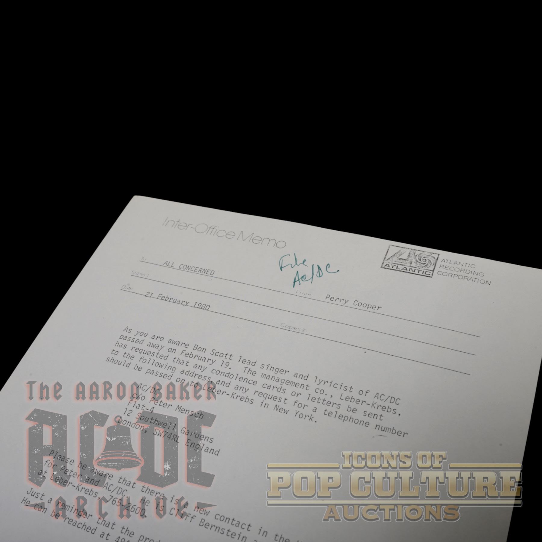 AC/DC - Atlantic Records "File Copy" Inter-Office Memo – Bon Scott Condolence Instructions