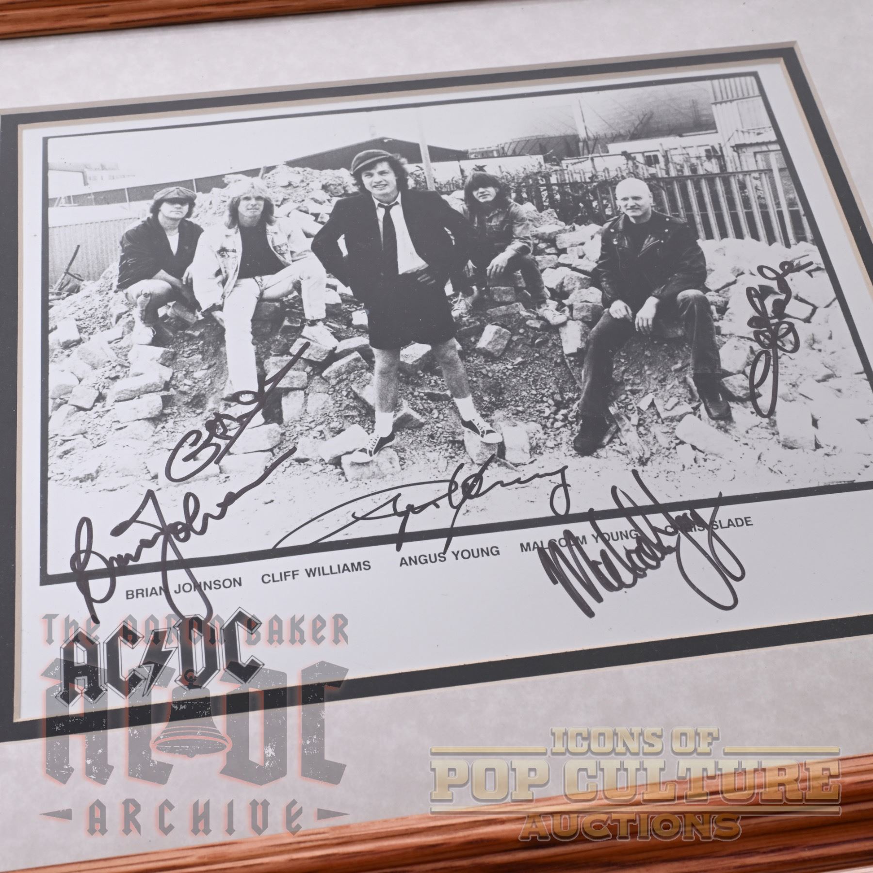 Original 8" x 10" Atco Records AC/DC promotional press photograph signed by the full band lineup, Angus Young, Malcolm Young, Brian Johnson, Cliff Williams, and Chris Slade. The black-and-white image captures the group posed on a pile of rubble, reflecting the gritty, hard-edged attitude that defines their sound and image. Each band member’s autograph appears prominently in black ink across the photo. The piece is presented in a wooden frame measuring approximately 15.75" x 12.75". A striking and authentic piece of AC/DC memorabilia from one of rock’s most powerful lineups.