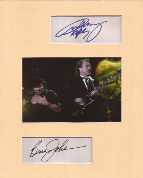 Bon Scott, Brian Johnson and Angus Young autographs on paper mounted and presented alongside images of the musicians. Also with an official 1981 AC/DC Monsters Of Rock Programme from 1981. (3 items)