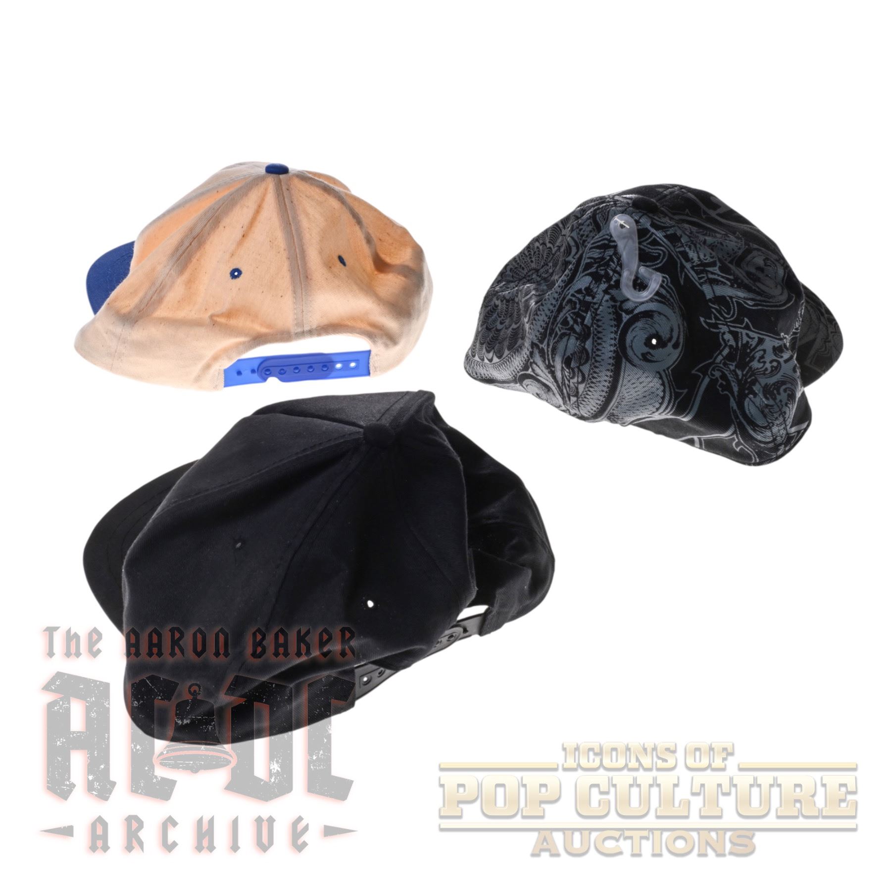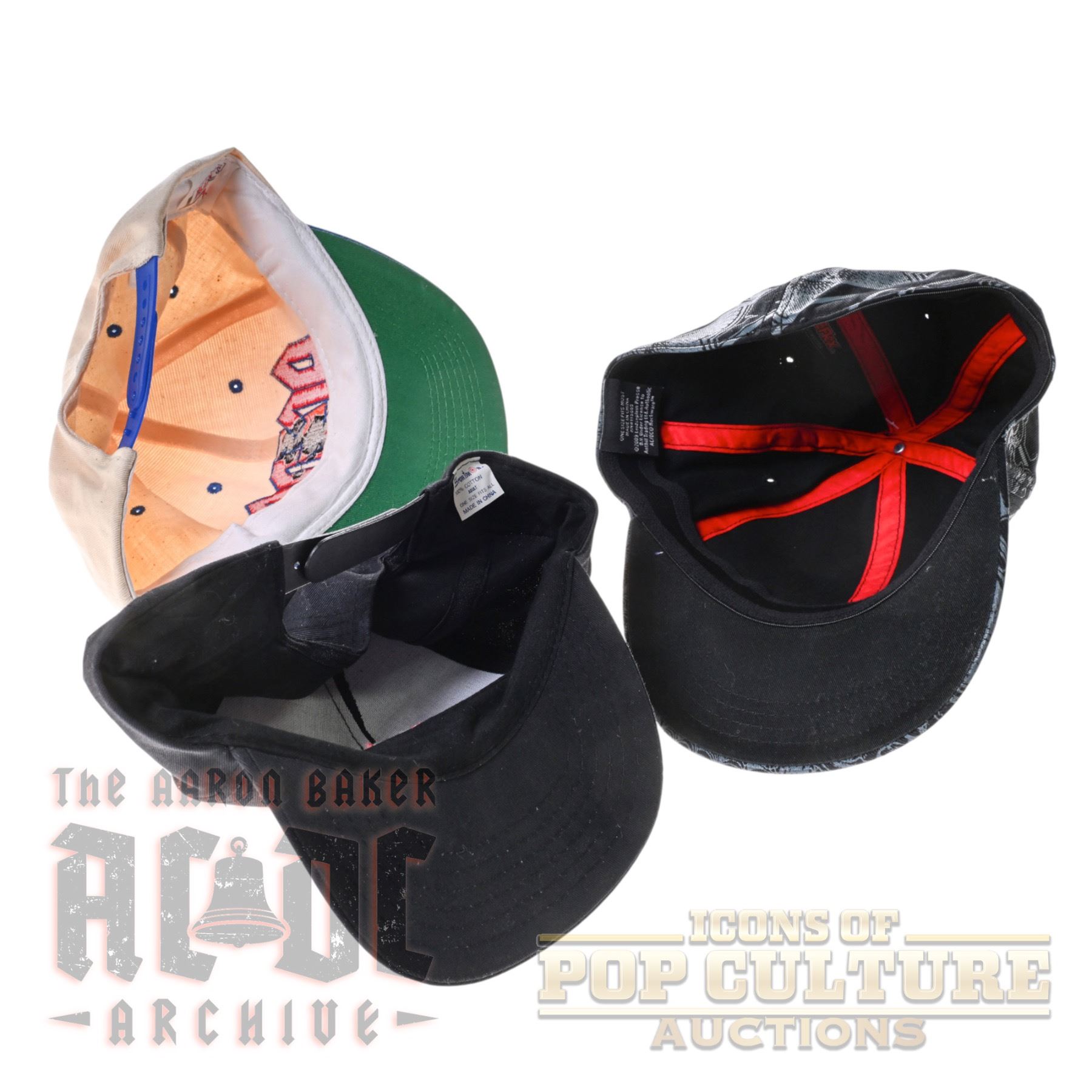 Set of three AC/DC logo baseball-style hats representing different designs and eras of band merchandise. The group includes one tan-and-blue cap featuring the classic AC/DC logo with lightning bolt and Angus artwork detail, one all-black hat with red embroidered AC/DC lettering, and one black-and-gray cap with a stylized all-over graphic print and red logo. Each showcases variations on the band’s iconic branding inspired by their unmistakable hard rock legacy. A great trio of collectible apparel items for any AC/DC fan or rock memorabilia collector.