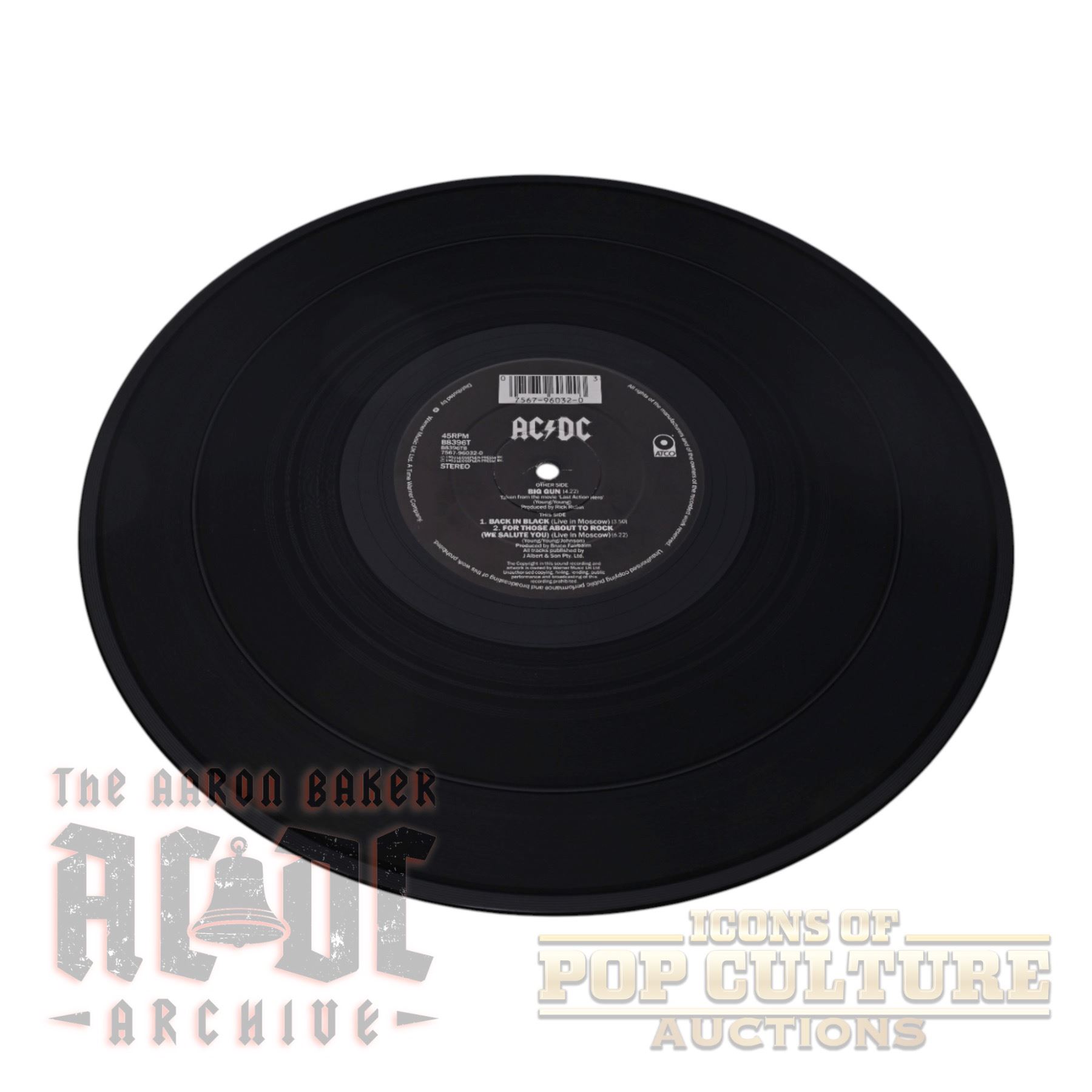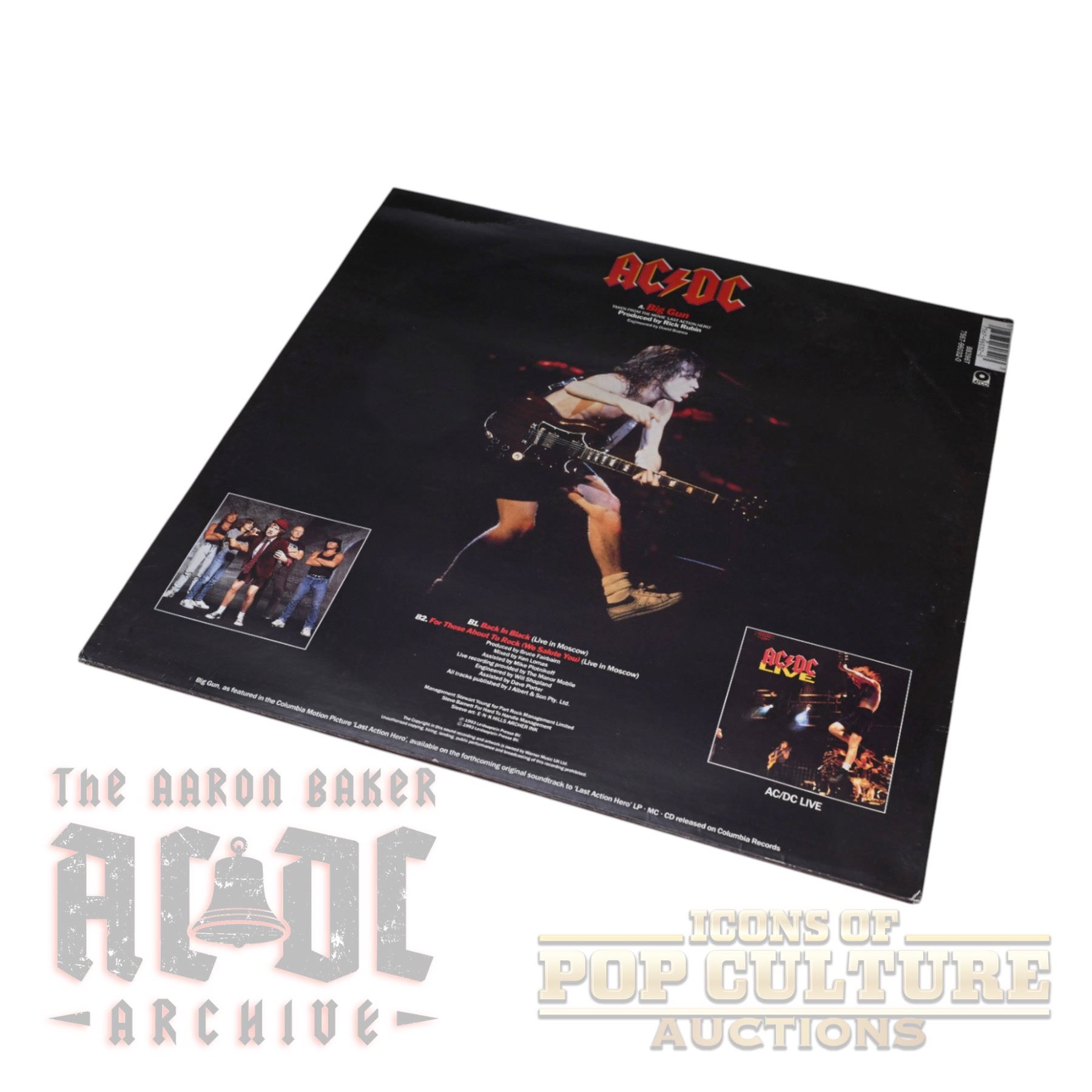 This is the 1993 UK 12" vinyl single Big Gun, catalog number B-8396T, released by ATCO Records. Side A features the studio version of Big Gun, recorded for the motion picture Last Action Hero. The B-side includes live tracks recorded in Moscow: Back In Black (Live) and For Those About To Rock (We Salute You) (Live). This maxi-single pressing is a UK import.