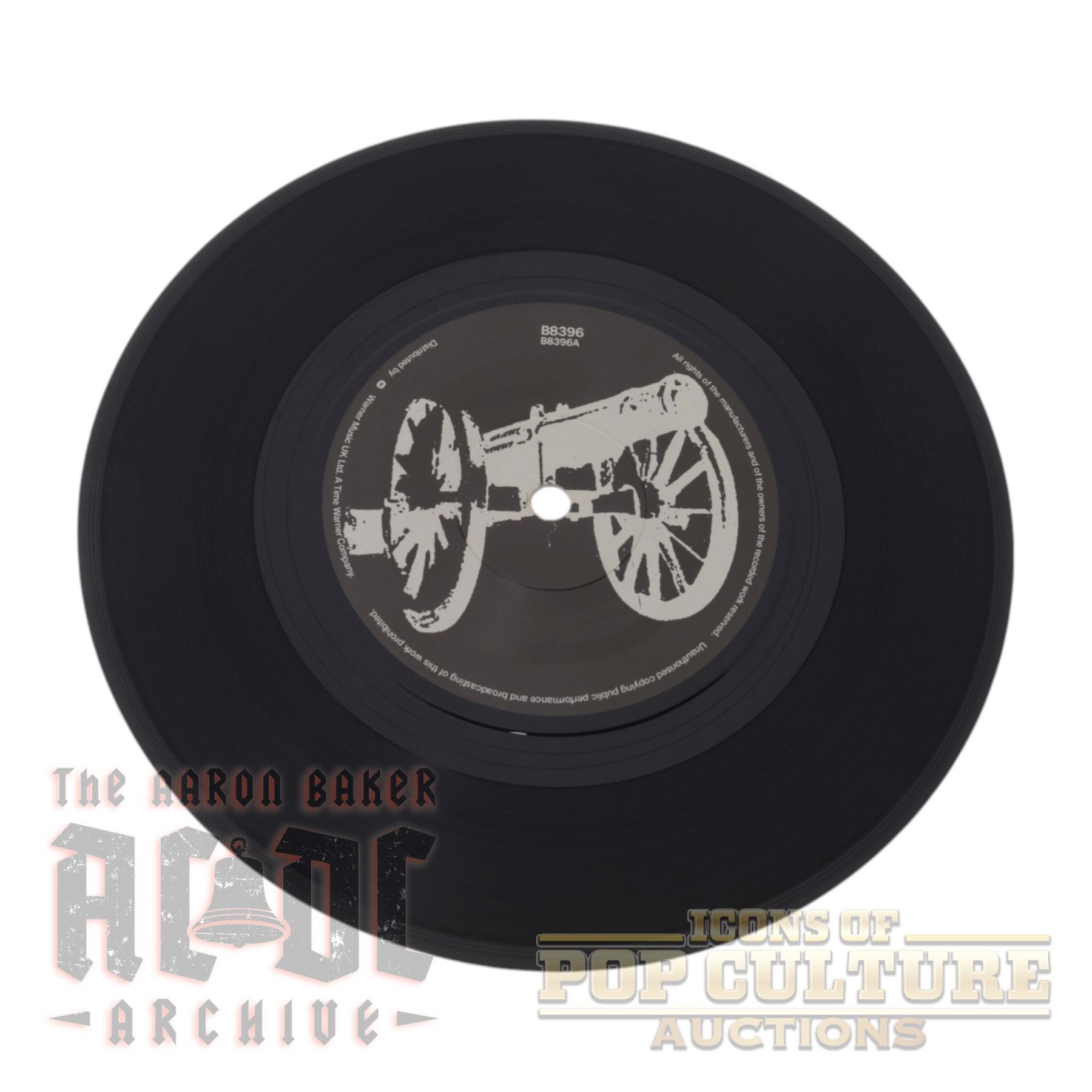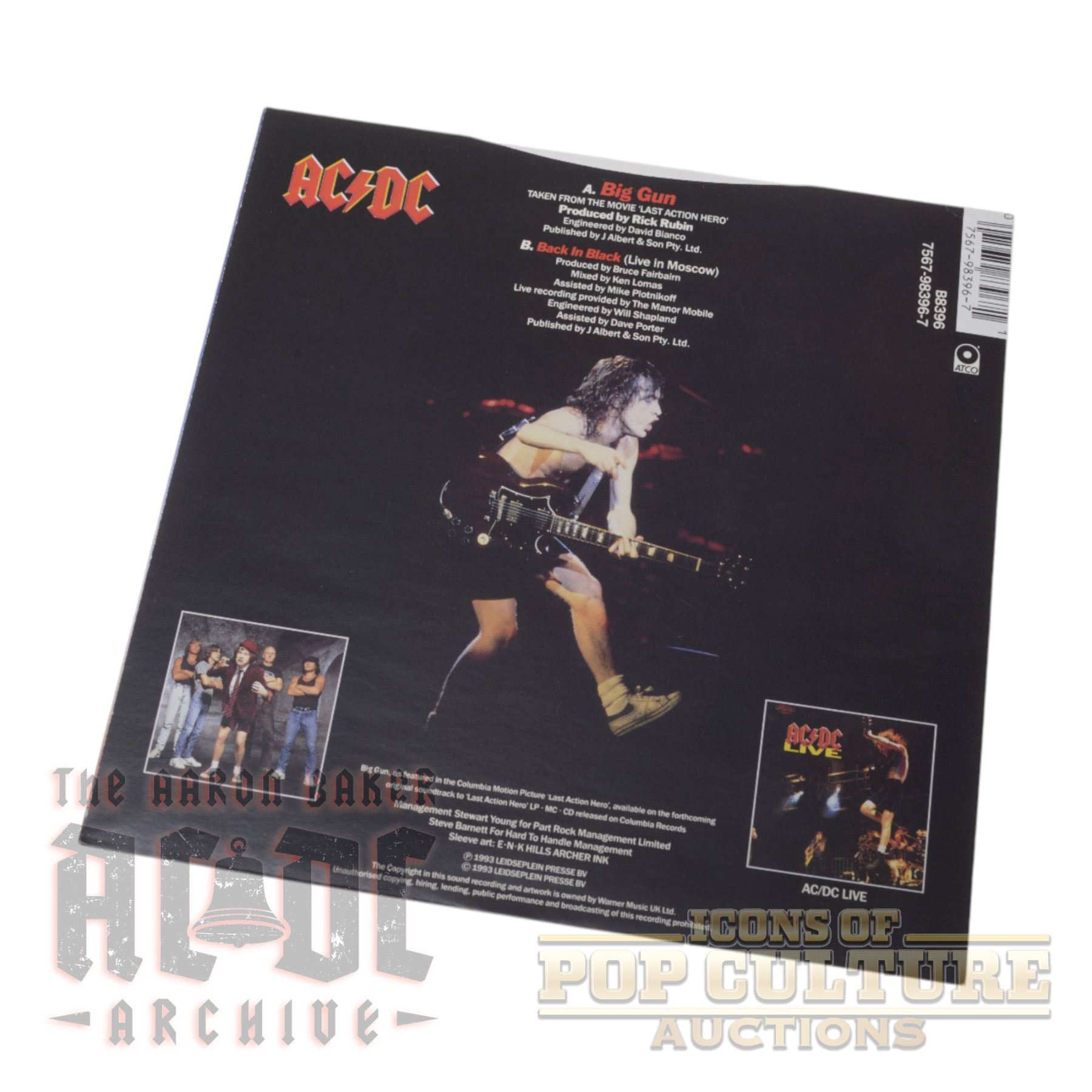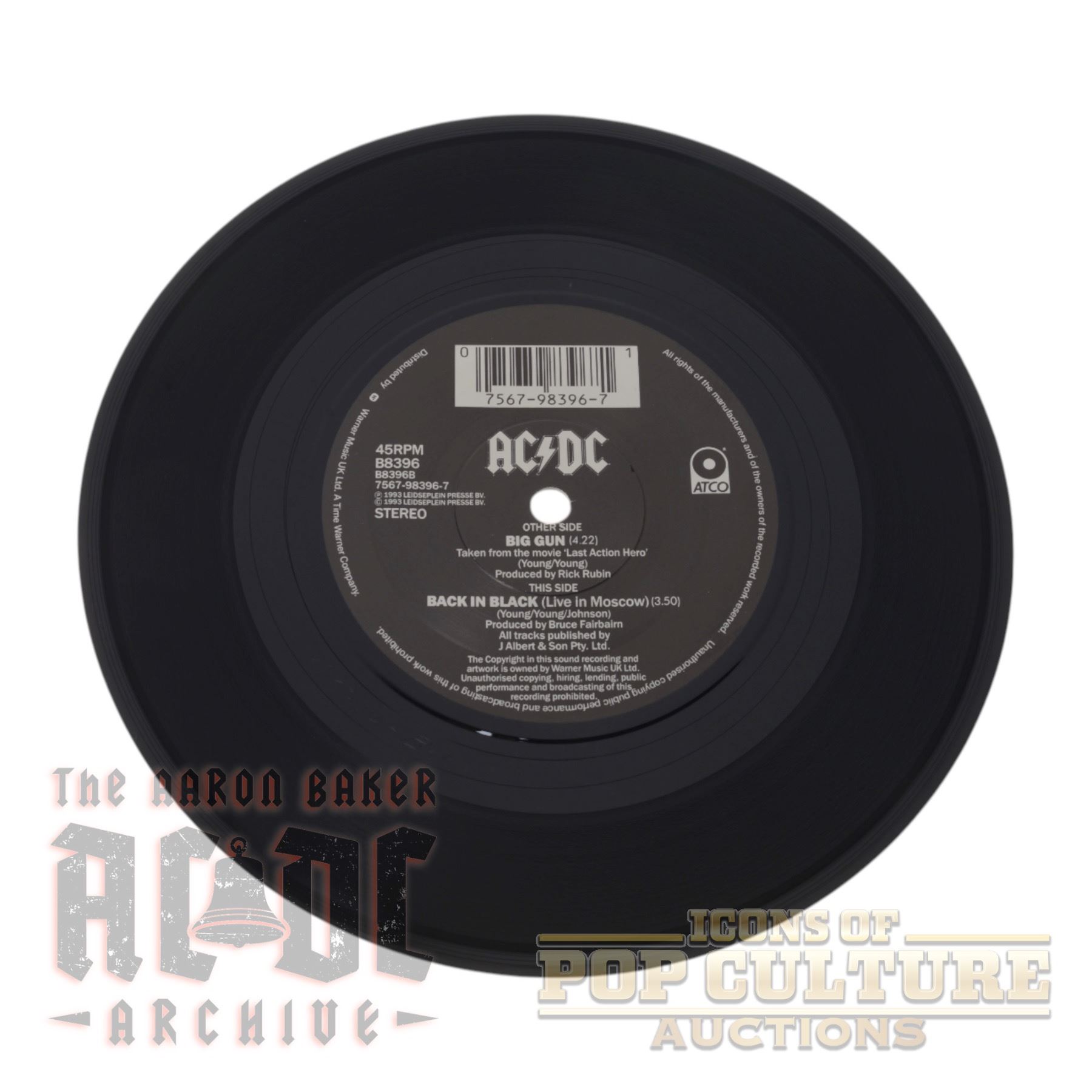 This is an original UK 7″ vinyl single by AC/DC, released in 1993 under catalog number B8396 on ATCO Records. Side A features “Big Gun,” produced by Rick Rubin and originally included on the soundtrack to the film Last Action Hero. Side B includes a live version of “Back in Black,” recorded in Moscow and produced by Bruce Fairbairn.