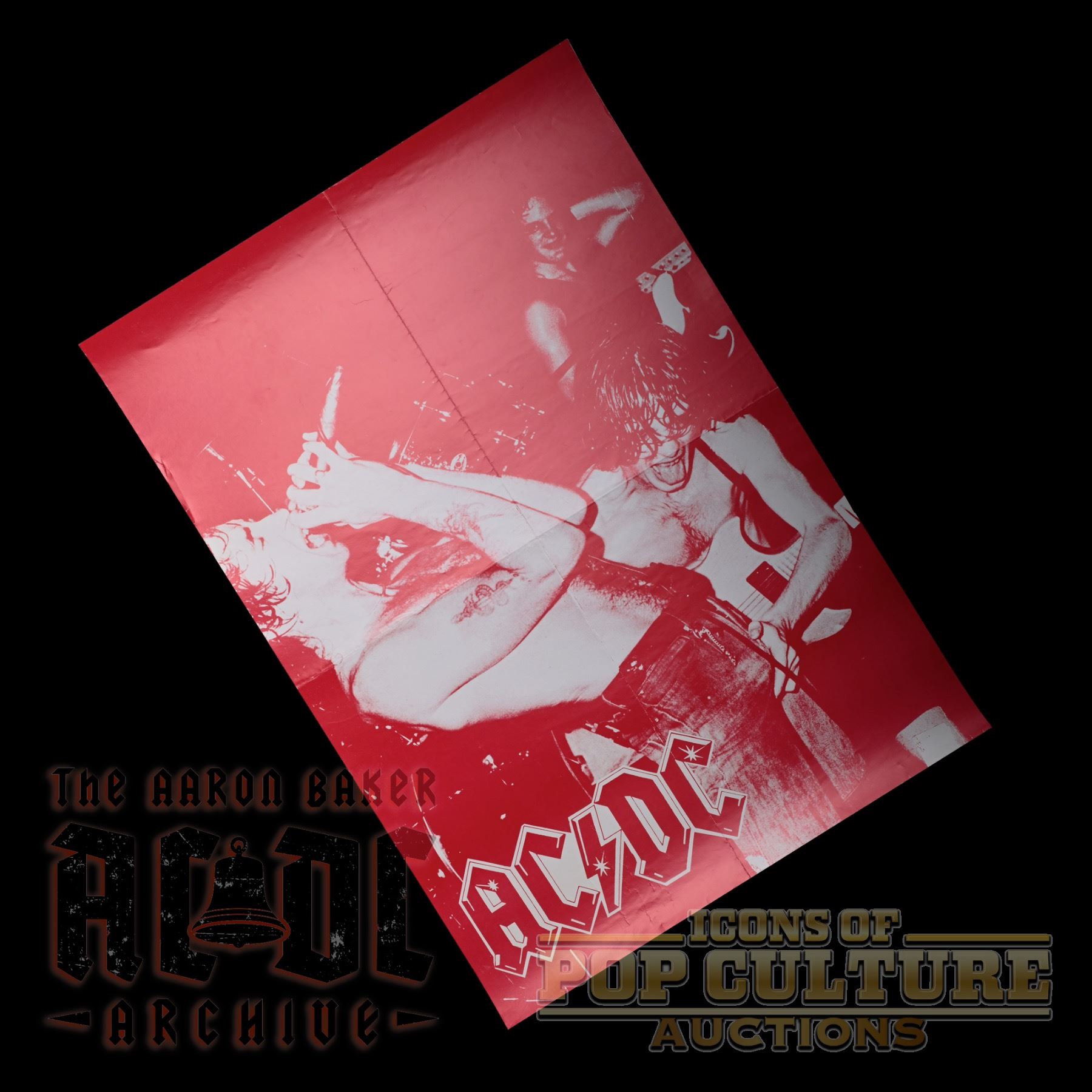 Presented here is a 23.5" × 16.5" vintage AC/DC poster featuring a powerful live performance image of the band. The design captures Bon Scott at the microphone in full voice, Angus Young delivering his trademark guitar energy while leaning against Bon, and bassist Mark Evans visible in the background. Printed in bold red tones with the AC/DC logo prominently displayed, this poster highlights the raw energy and classic lineup of the band during the Bon Scott era, making it a striking collectible for fans of early AC/DC.