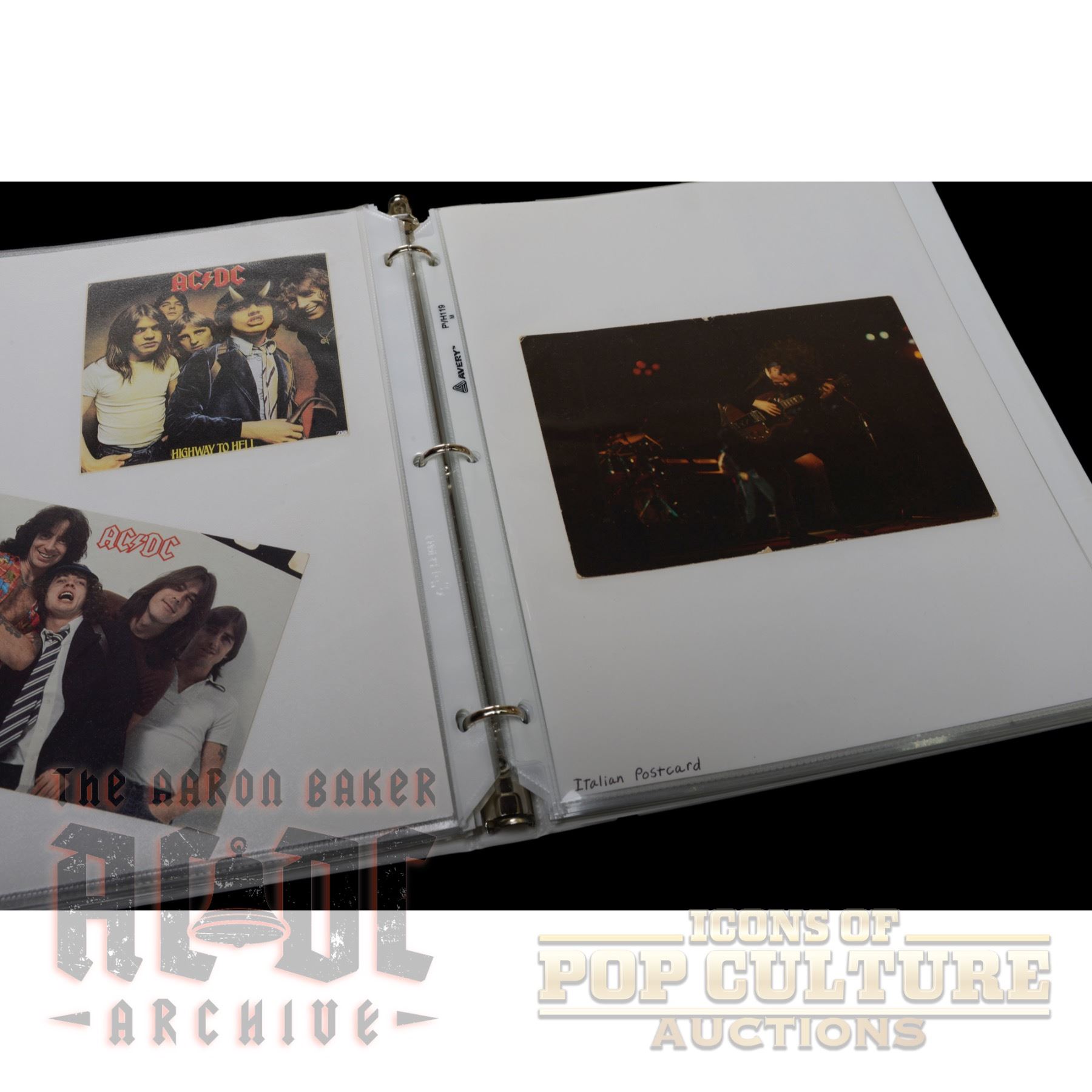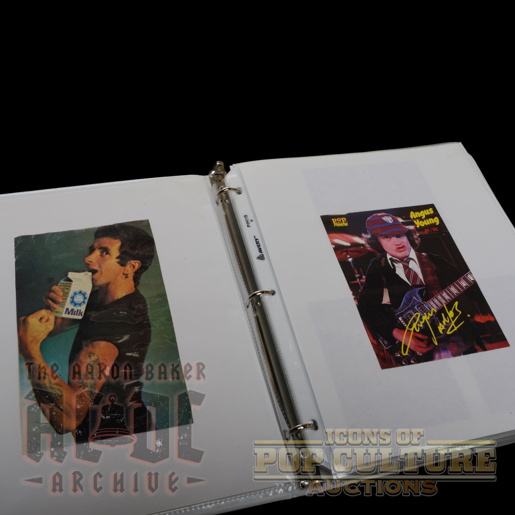 Offered here is a unique scrapbook compiled by noted AC/DC collector and archivist Aaron Baker, focused on the band’s legendary Bon Scott era. This one-of-a-kind collection brings together original photographs, postcards, and contemporary news clippings that document the group during their formative years in the 1970s. Included are rare images of Bon Scott, Angus Young, and the band both on and off stage, as well as press materials capturing their rise to international fame. With its combination of visual memorabilia and period coverage, this scrapbook provides an invaluable historical record of AC/DC during one of the most celebrated chapters in the band’s history.