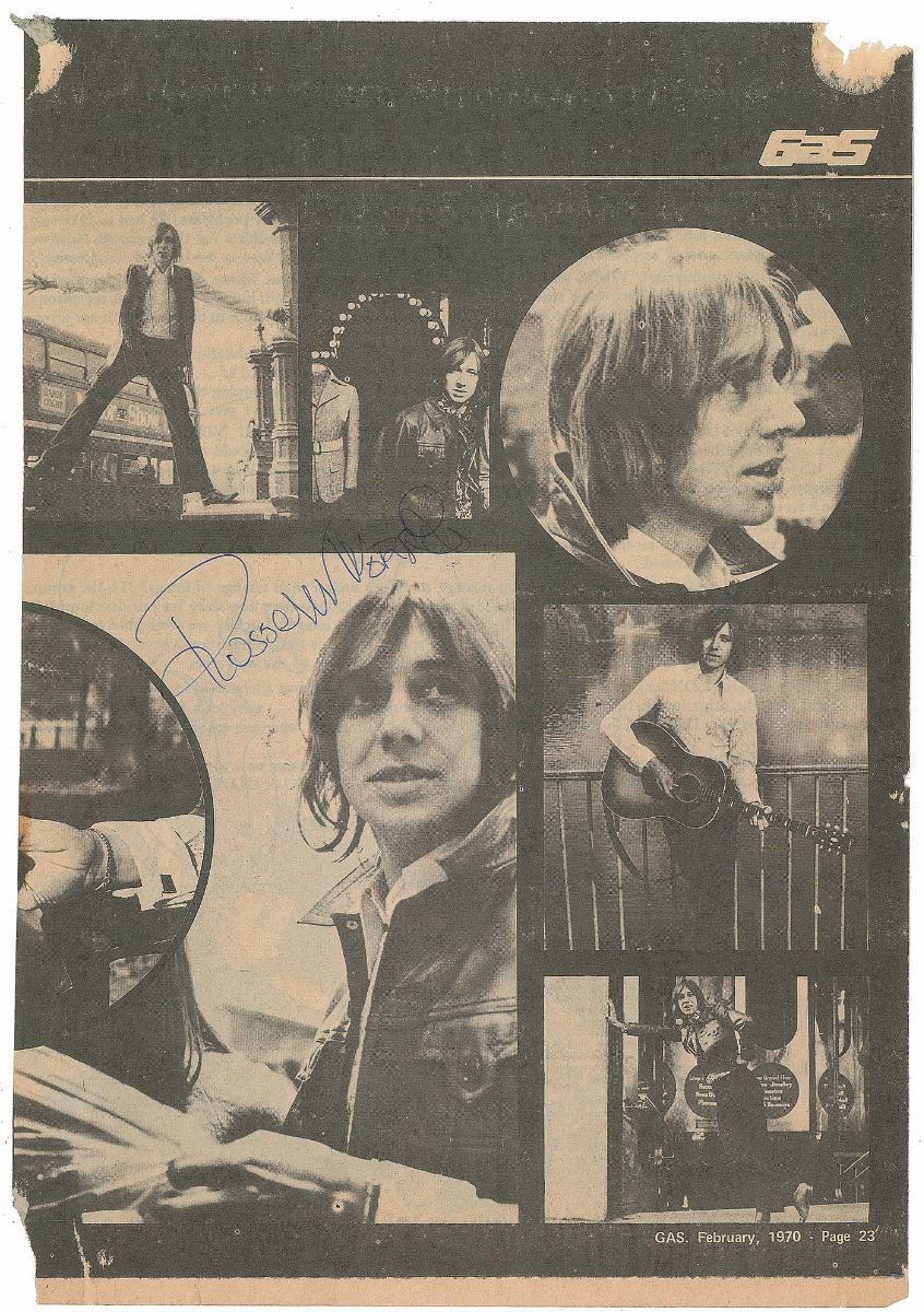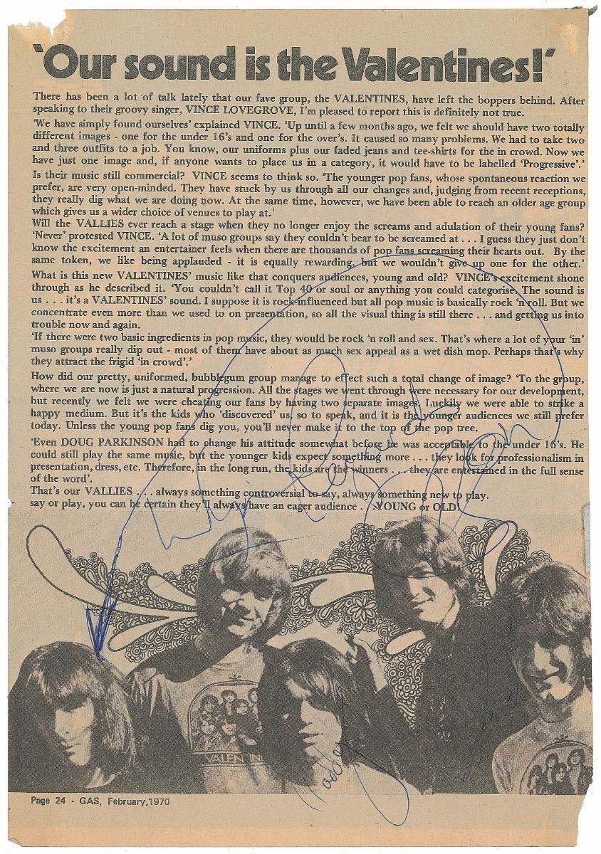 Exceedingly early article from Gas magazine, page twenty-four, dated February 1970, concerning the Australian pop band The Valentines, signed in blue ballpoint, “Regards, Bon [Scott],” who draws an arrow over to his image, “Wyn [Milson],” “Paddy [Beach],” and “Ted [Ward].” In fine condition. Consignor notes that the signatures were obtained in August of 1970, shortly before the disbanding of the group. Before he replaced Dave Evans as the frontman for AC/DC in September of 1974, Scott shared lead singing duties in the band The Valentines, a union of local acts The Winstons and The Spektors. An awesome piece of rock history, and the earliest example of a Bon Scott signature we have ever offered.