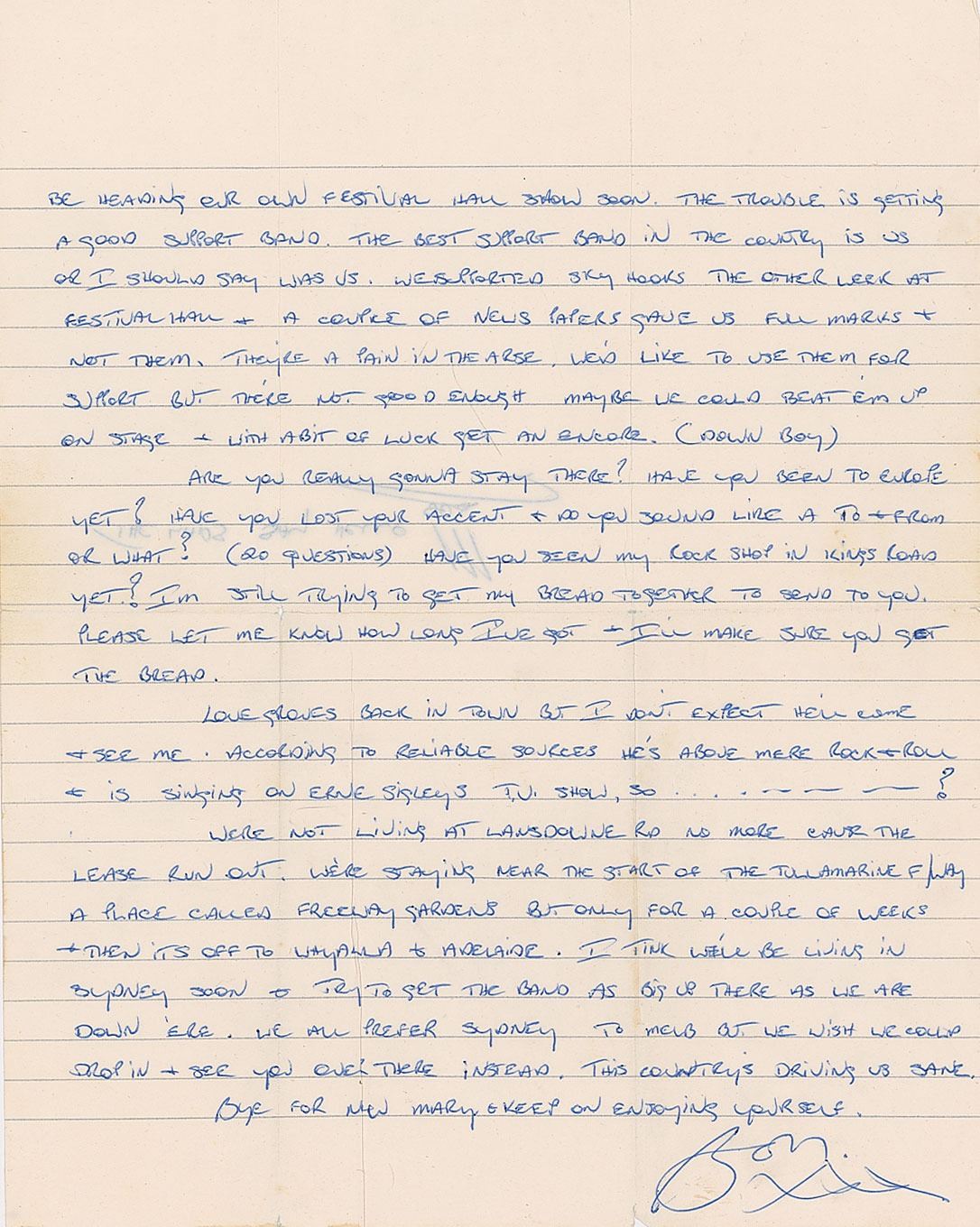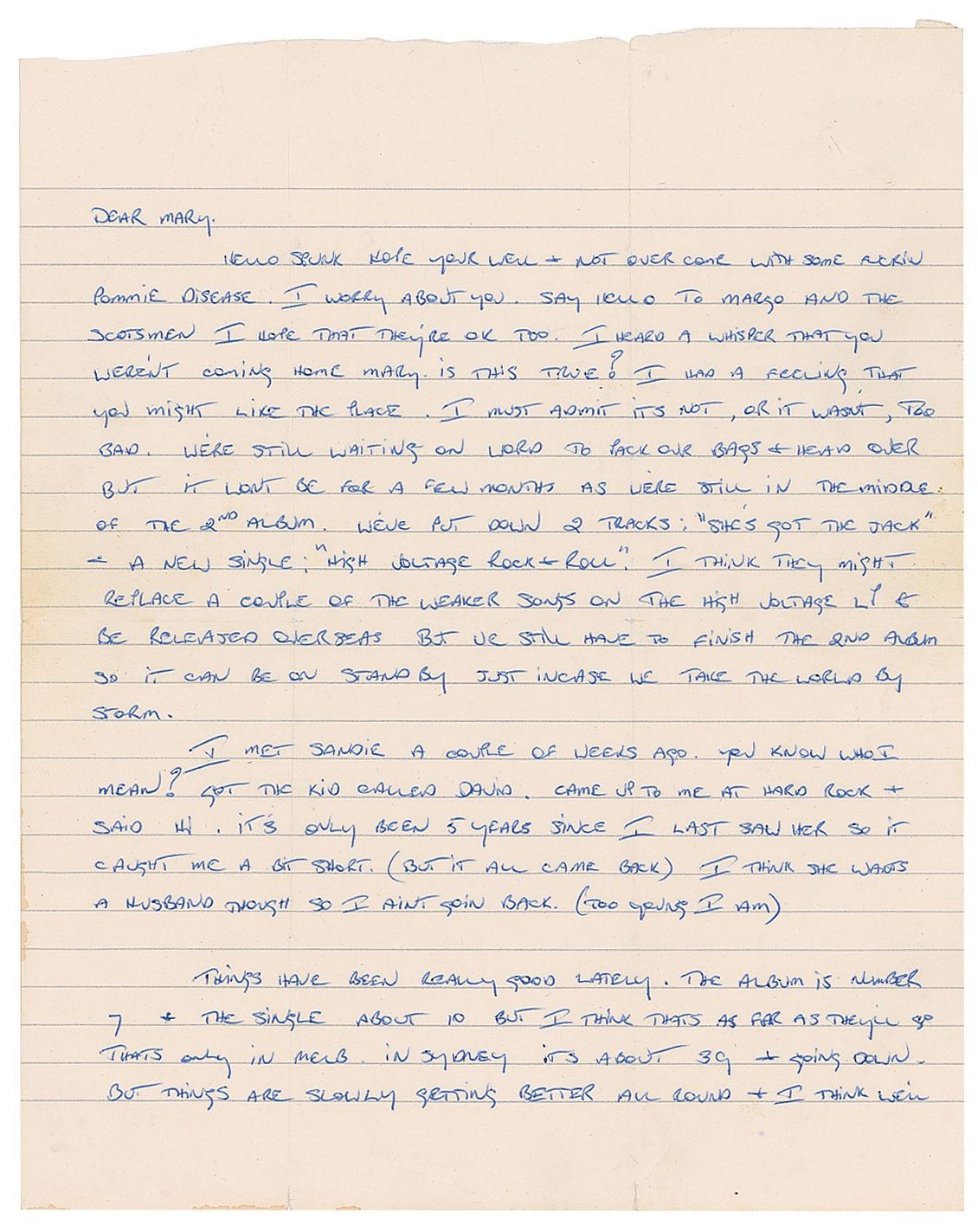 ALS signed “Bon, xxx,” two pages, 8 x 9.75, postmarked 1975. Letter to close friend Mary Walton, in full: "Hello spunk. Hope your well & not overcome with some fuckin Pommie disease. I worry about you. Say hello to Margo and the Scotsmen I hope that they’re OK too. I heard a whisper that you weren’t coming home Mary. Is this true? I had a feeling that you might like the place. I must admit it’s not, or it wasn’t, too bad. We’re still waiting on word to pack our bags & head over but it won’t be for a few months as we’re still in the middle of the 2nd album. We’ve put down 2 tracks: 'She’s Got The Jack'—a new single: 'High Voltage Rock & Roll.' I think they might replace a couple of the weaker songs on the High Voltage LP & be released overseas but we still have to finish the 2nd album so it can be on standby just in case we take the world by storm.