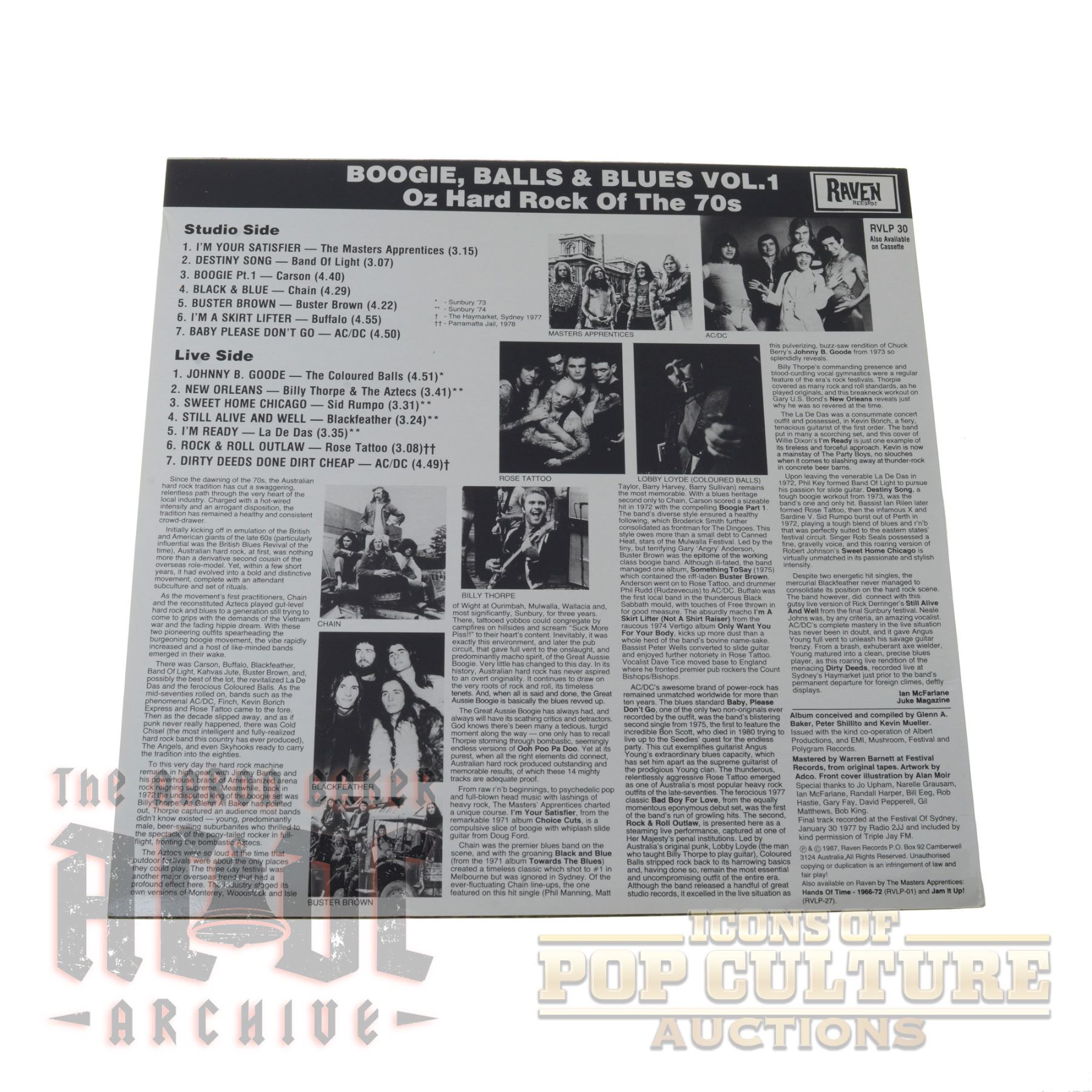 Offered is a vintage Australian compilation LP, Boogie, Balls & Blues Vol. 1 (Oz Hard Rock of the 70s), issued in 1987 by Raven Records (catalog RVLP 30). This collection showcases a powerful cross-section of Australia’s ’70s hard-rock scene, featuring AC/DC’s early live track “Baby, Please Don’t Go”, alongside other era-defining artists such as The Masters Apprentices, Band of Light, Carson, Buffalo, Buster Brown, and Rose Tattoo. The vinyl heavyweight album cover sports a bold, raw illustration of lively blues-rock imagery, while inside, a mix of studio cuts and pulse-racing live performances captures the undercurrent of the period’s vibrant music culture. Raven Records, known for its retrospectives and reissue collections, delivers an engaging snapshot of early AC/DC alongside its contemporaries. This compilation offers both genre historians and AC/DC collectors a rare glimpse into the band’s formative legacy embedded within Australia’s hard-rock tapestry.