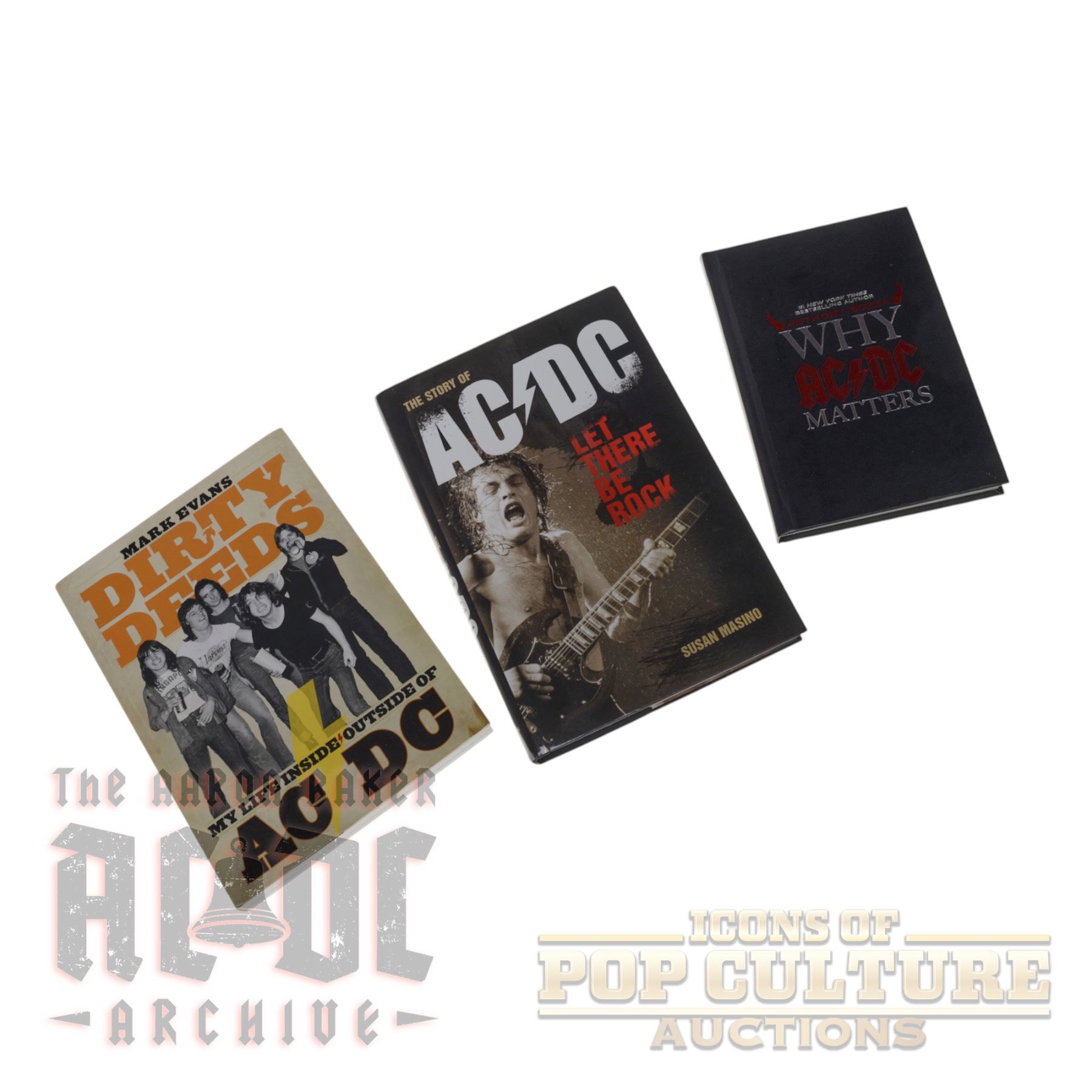 This collection consists of three publications focused on the history and legacy of AC/DC. Dirty Deeds: My Life Inside/Outside of AC/DC by Mark Evans is a memoir from the band’s former bassist, featuring personal photographs and stories from his time with the group. The Story of AC/DC: Let There Be Rock by Susan Masino provides a detailed history of the band, illustrated with archival photos and performance shots. Why AC/DC Matters explores the band’s cultural impact and enduring relevance. The collection contains both text and photographic content, covering band performances, behind-the-scenes moments, and personal anecdotes.