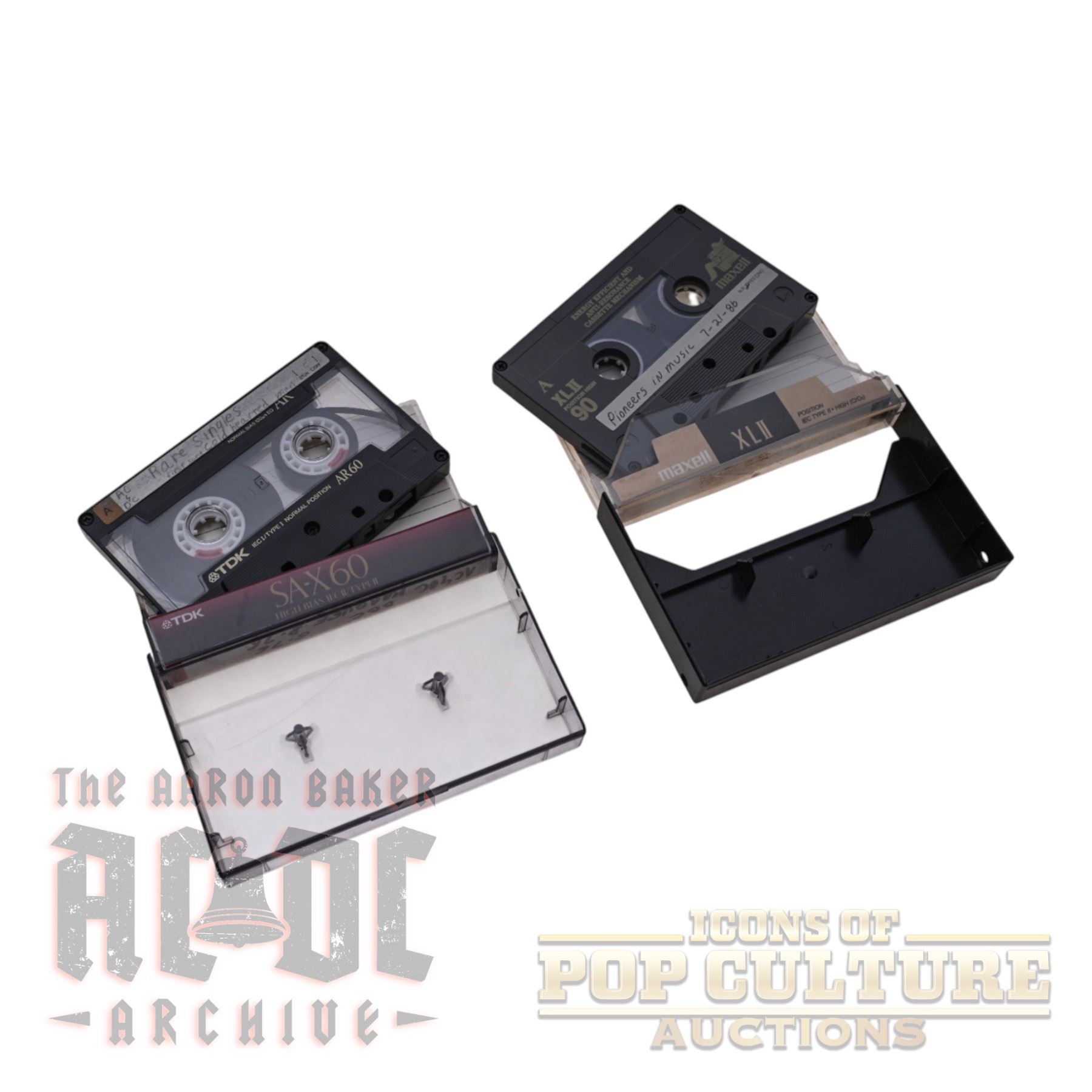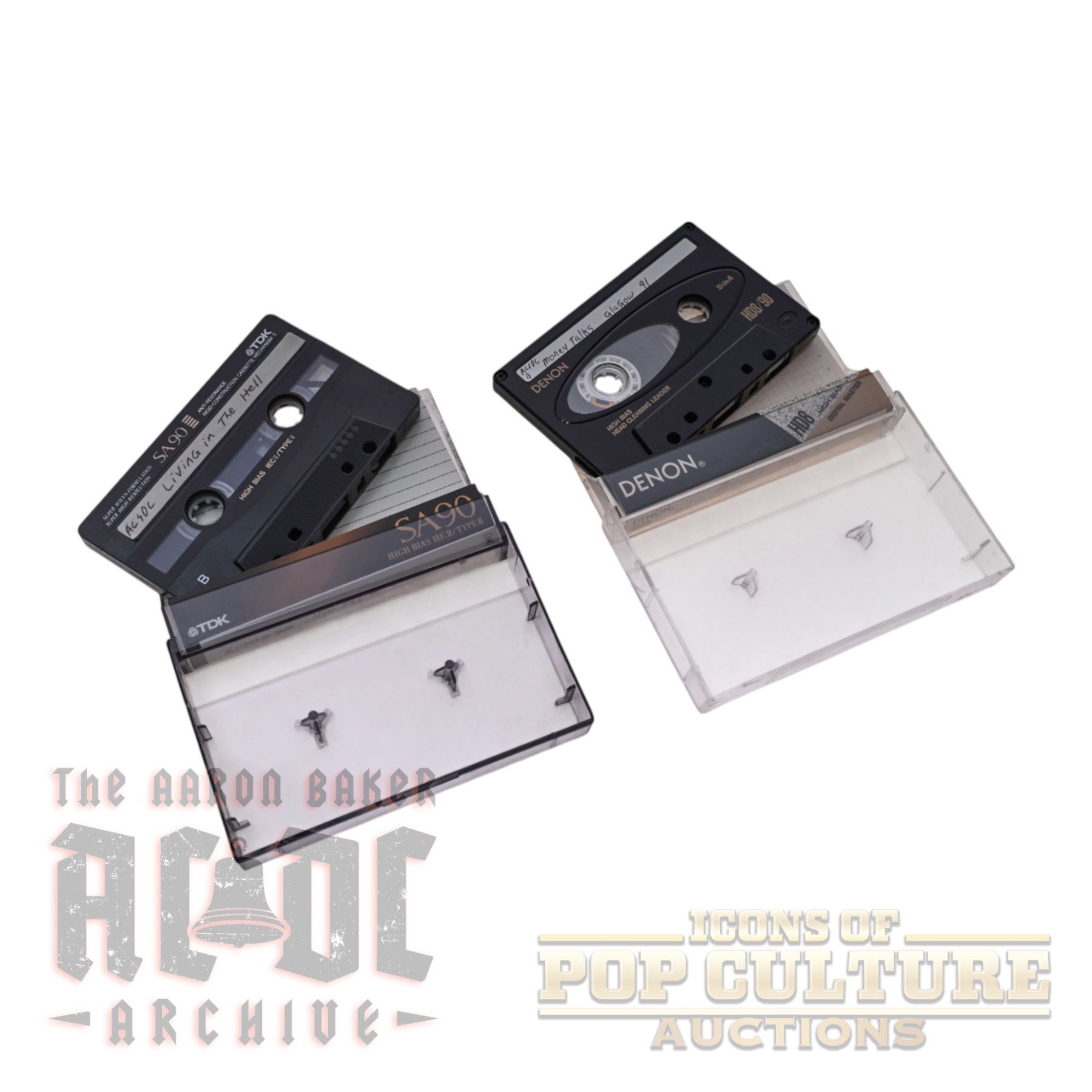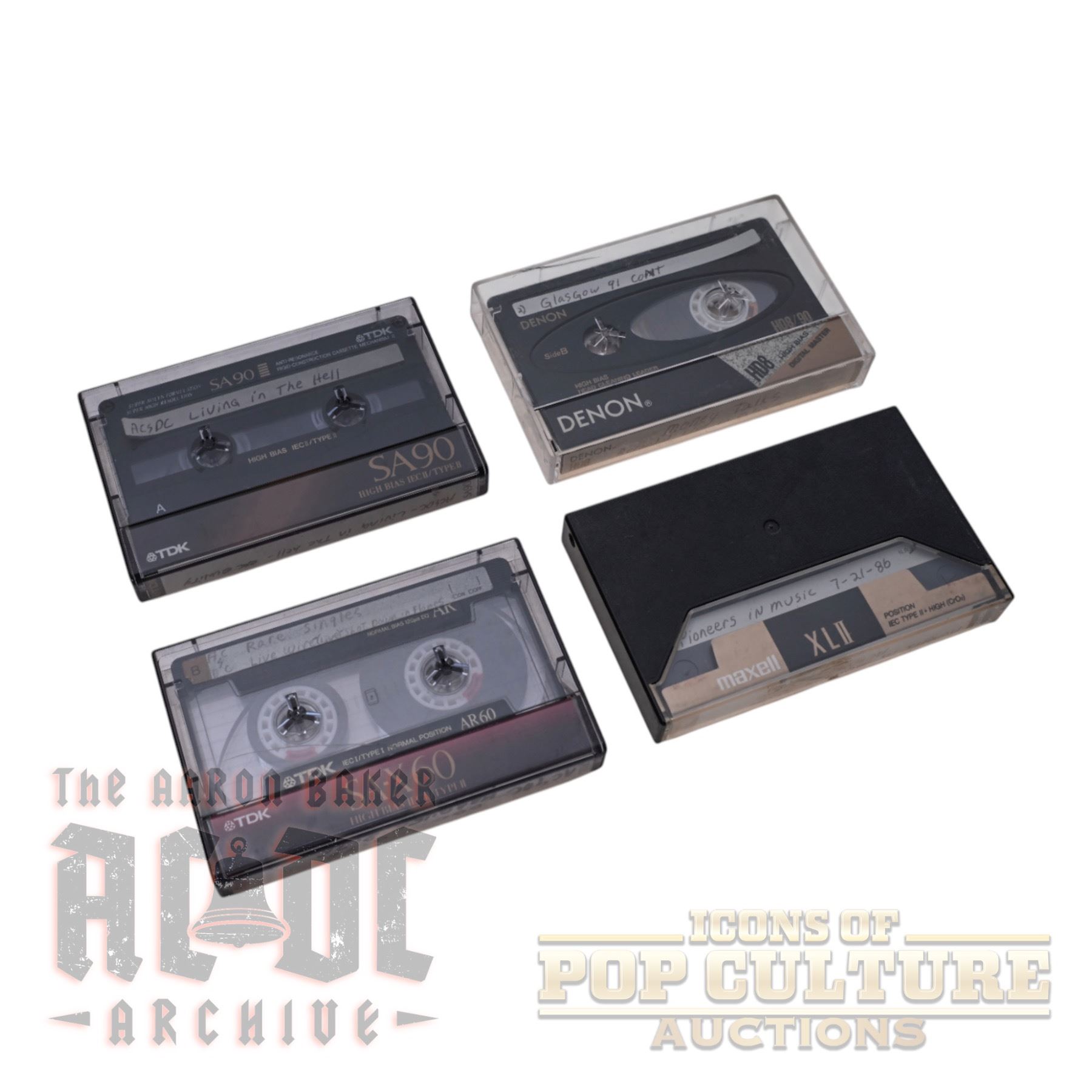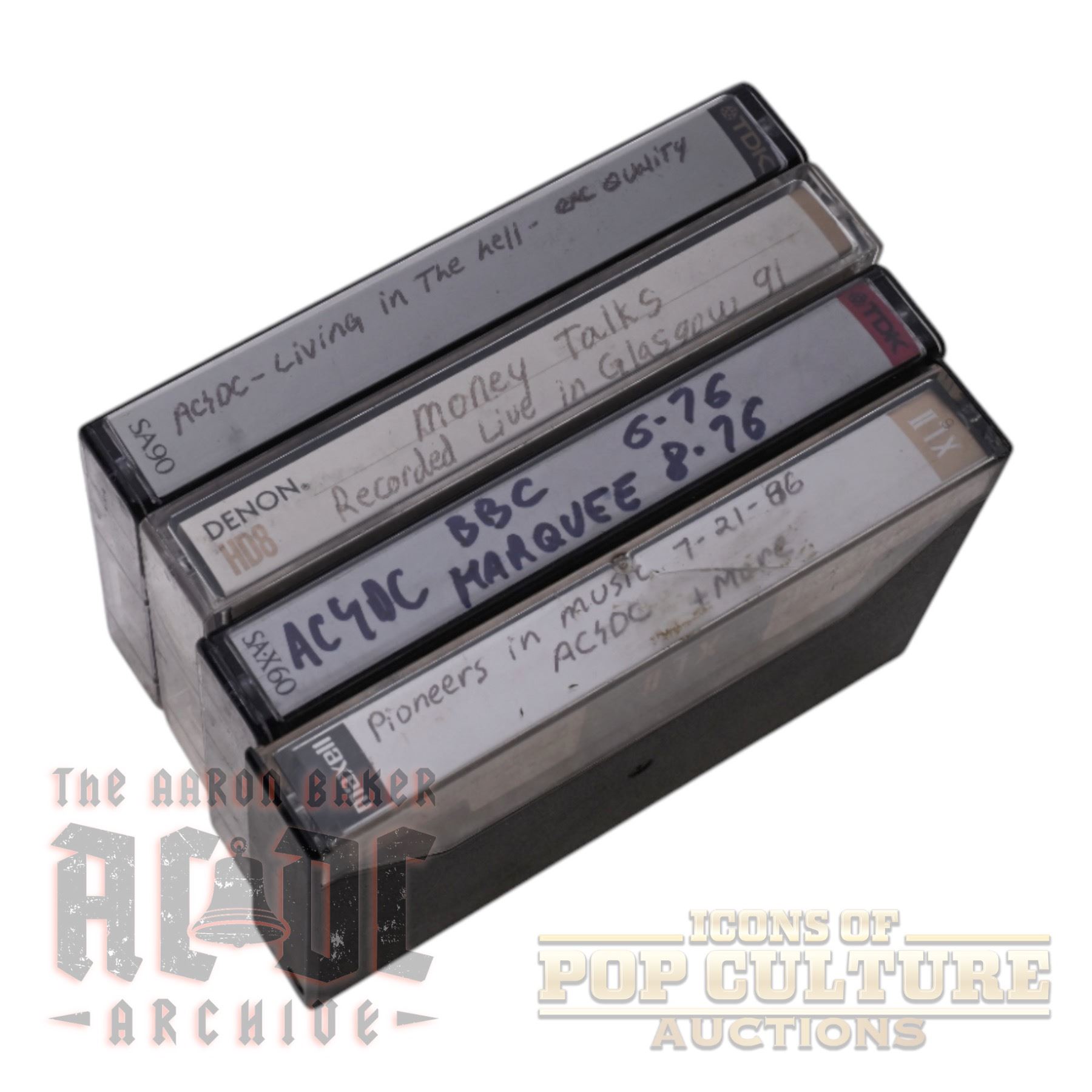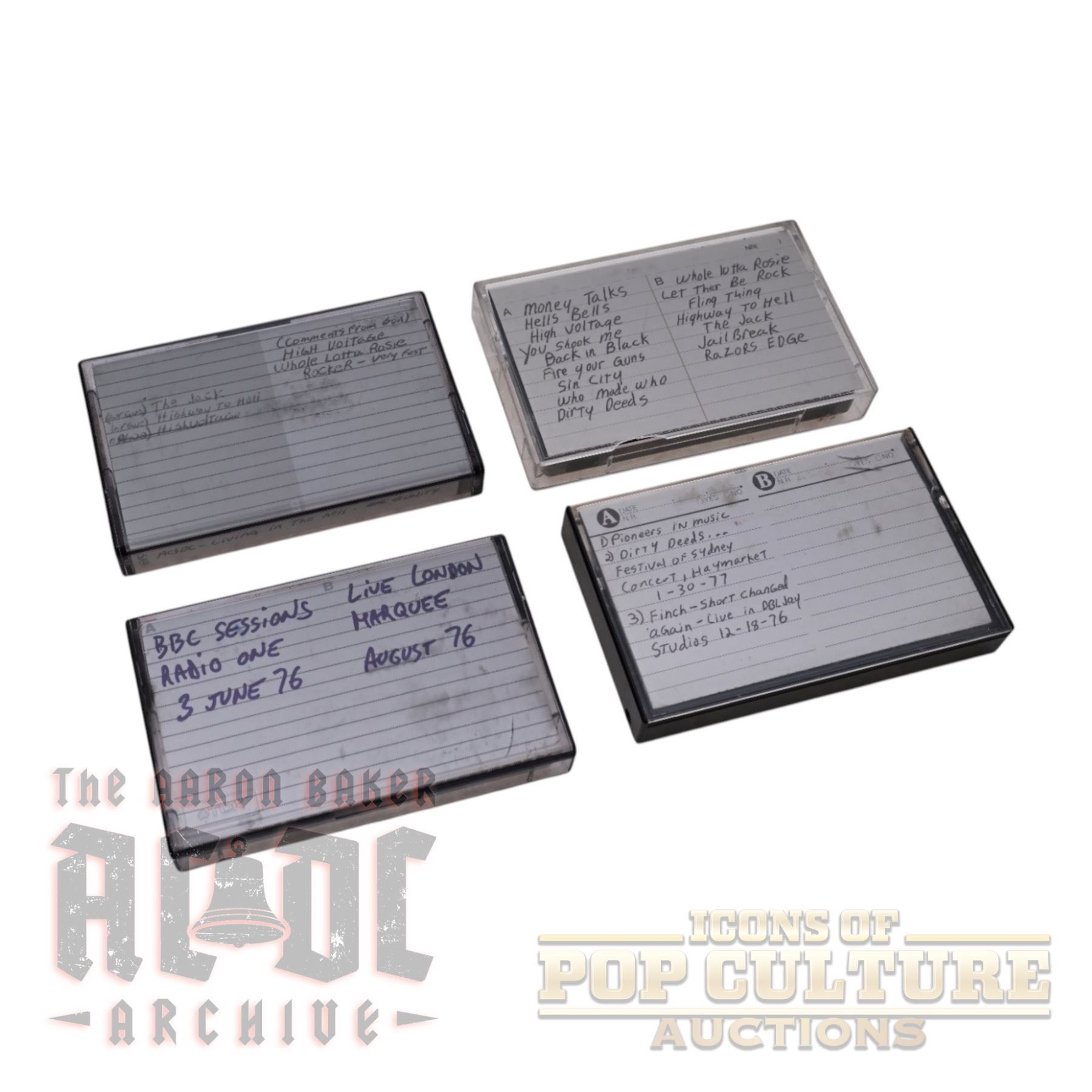 Offered here is a set of four AC/DC bootleg cassette tapes, each featuring rare live performances and broadcasts. Included are recordings labeled with BBC Sessions – Radio One, June 3, 1976, Live at the Marquee, London, August 1976, and a 1991 Glasgow live set featuring Moneytalks. Also present is a tape noted as Living in the Hell – Arc Equity along with additional recordings such as Pioneers in Music dated July 21, 1986. Handwritten track listings across the cases reference AC/DC classics including High Voltage, Sin City, You Shook Me All Night Long, Let There Be Rock, Highway to Hell, and Back in Black. A unique collection capturing AC/DC in live and broadcast settings across multiple eras.