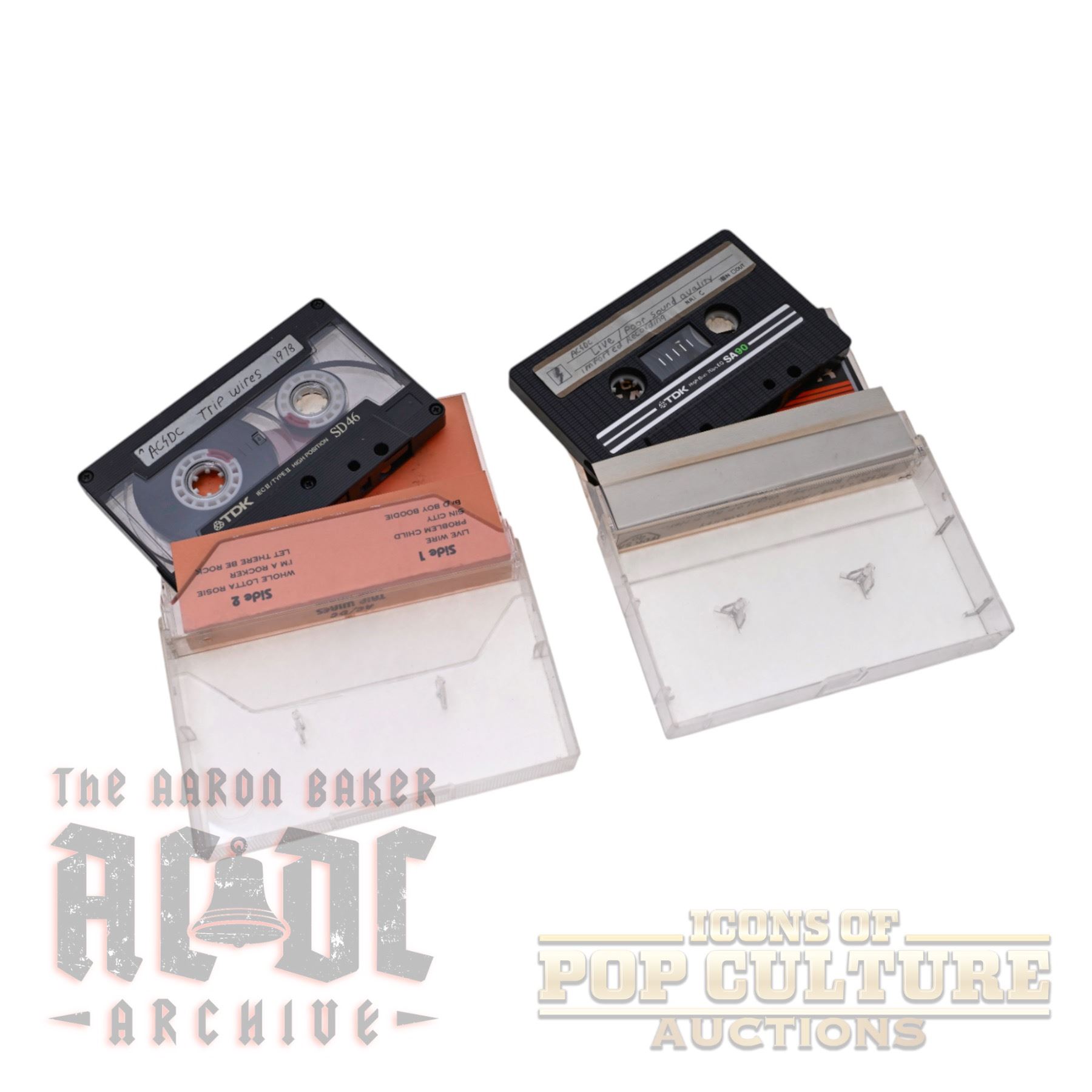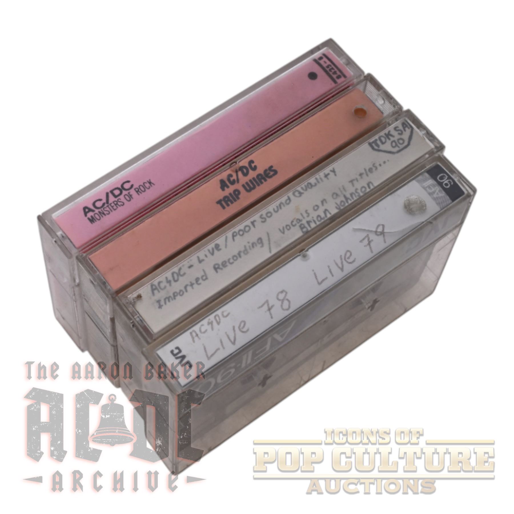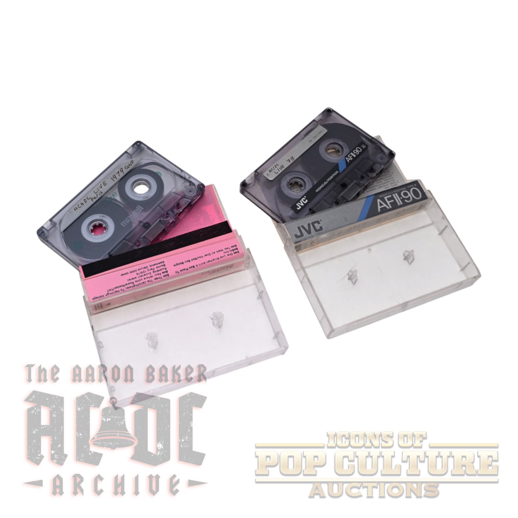 Offered here is a set of four AC/DC bootleg cassette tapes featuring rare live recordings and unofficial releases from the band’s prime touring years. The collection includes Trip Wires 1978, Live 1978, Live 1979, and Monsters of Rock, each with handwritten setlists and notes. Performances capture AC/DC classics such as Live Wire, Problem Child, Sin City, Bad Boy Boogie, Highway to Hell, Rock ’n’ Roll Damnation, The Jack, Whole Lotta Rosie, and Rocker, among others. These tapes showcase the band’s raw energy on stage during both the Bon Scott and early Brian Johnson eras, offering collectors a unique glimpse into AC/DC’s historic live legacy.