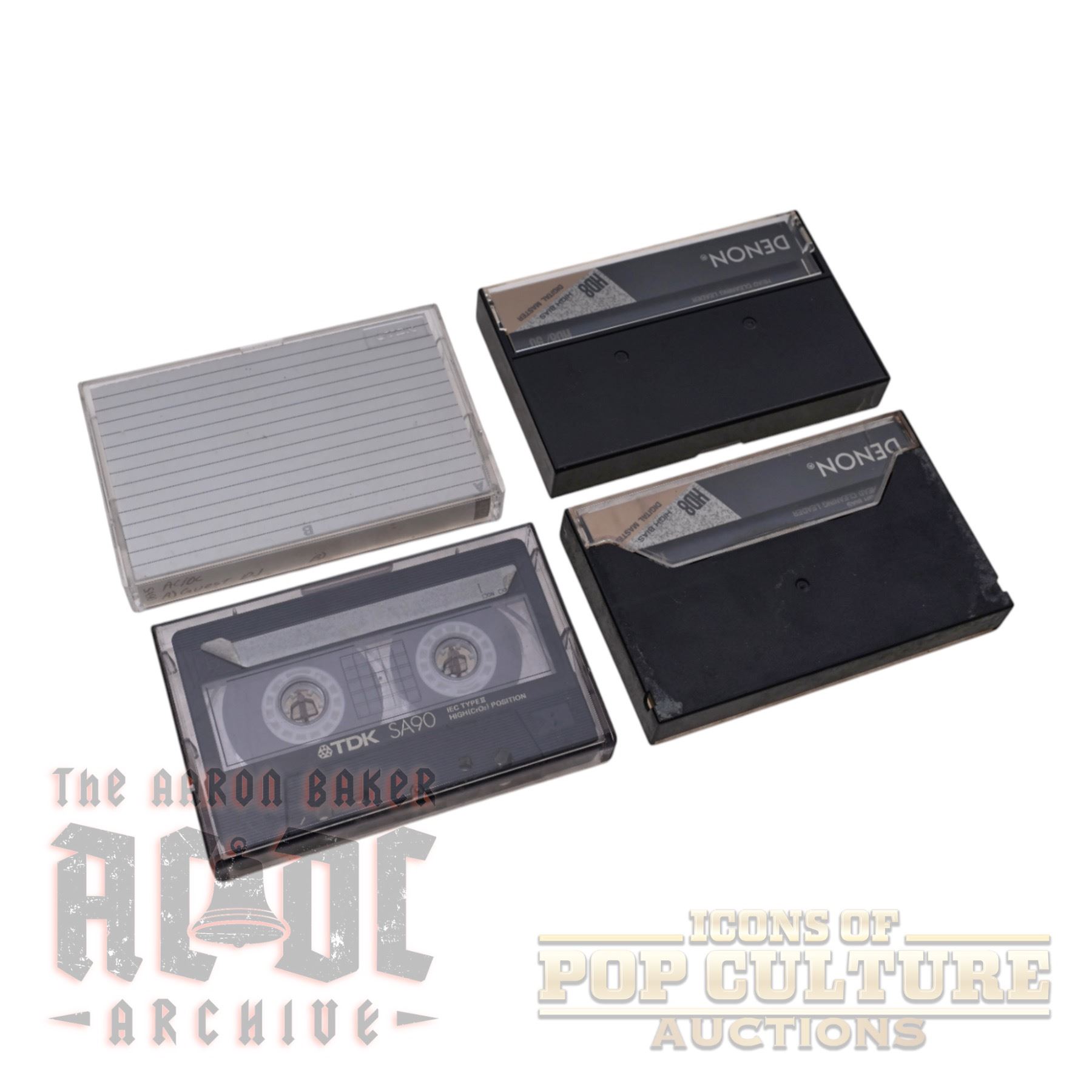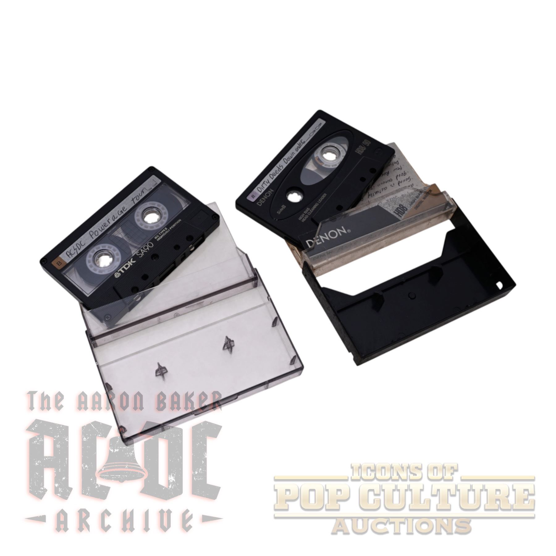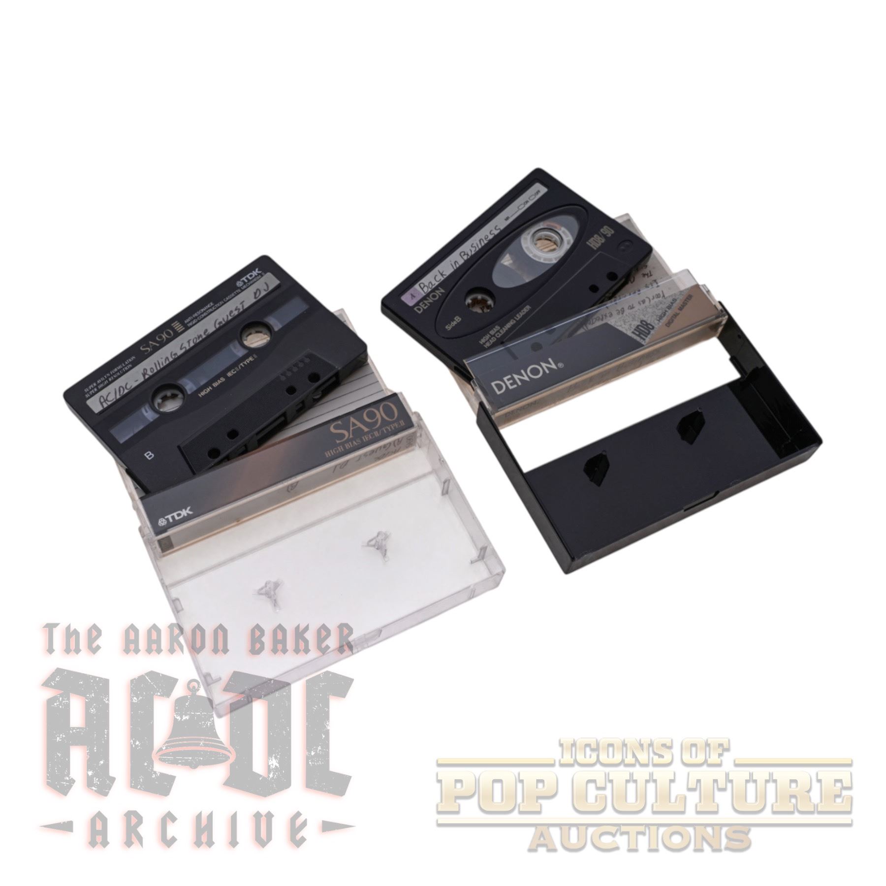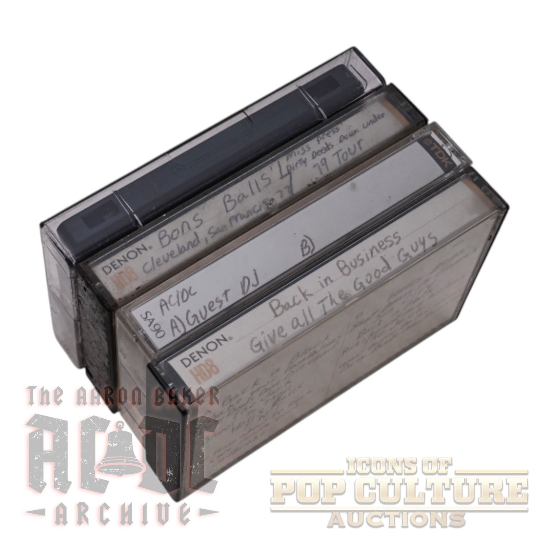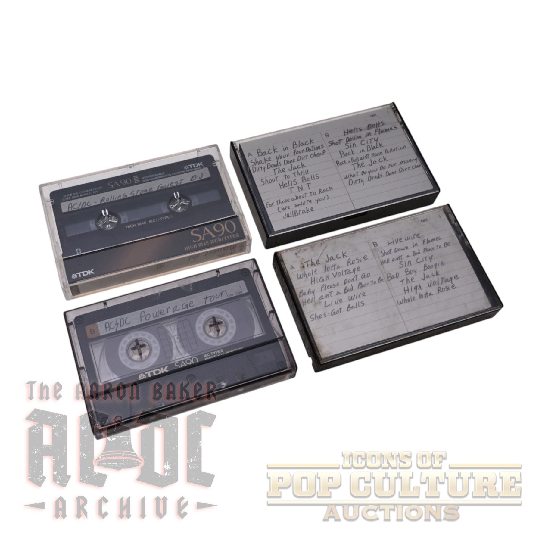 This lot includes four AC/DC bootleg cassette tapes capturing live performances and rare recordings from different eras of the band. One tape is labeled Bon’s Balls with references to 1977–1979 tour recordings from Cleveland and San Francisco. Another features a Powerage Tour setlist with tracks such as The Jack, Whole Lotta Rosie, High Voltage, Live Wire, and She’s Got Balls. A third tape is marked Rolling Stone Guest DJ, highlighting AC/DC content tied to a radio broadcast. The fourth is noted as Back in Business / Give All the Good Guys, referencing tracks like Back in Black, Shoot to Thrill, Hells Bells, Dirty Deeds Done Dirt Cheap, and For Those About to Rock. Together these tapes provide a fascinating mix of live energy, rare recordings, and radio appearances spanning AC/DC’s Bon Scott and Brian Johnson years.