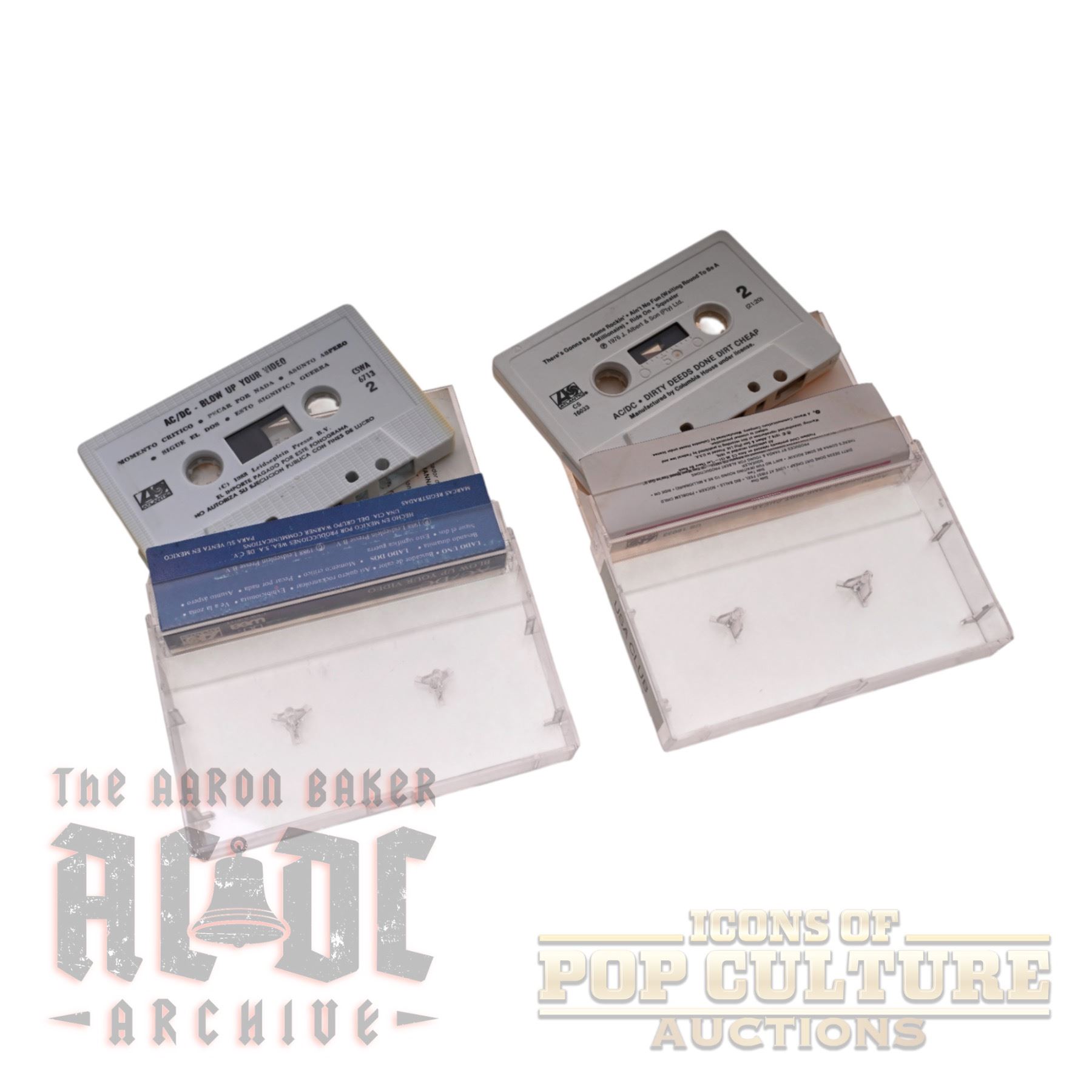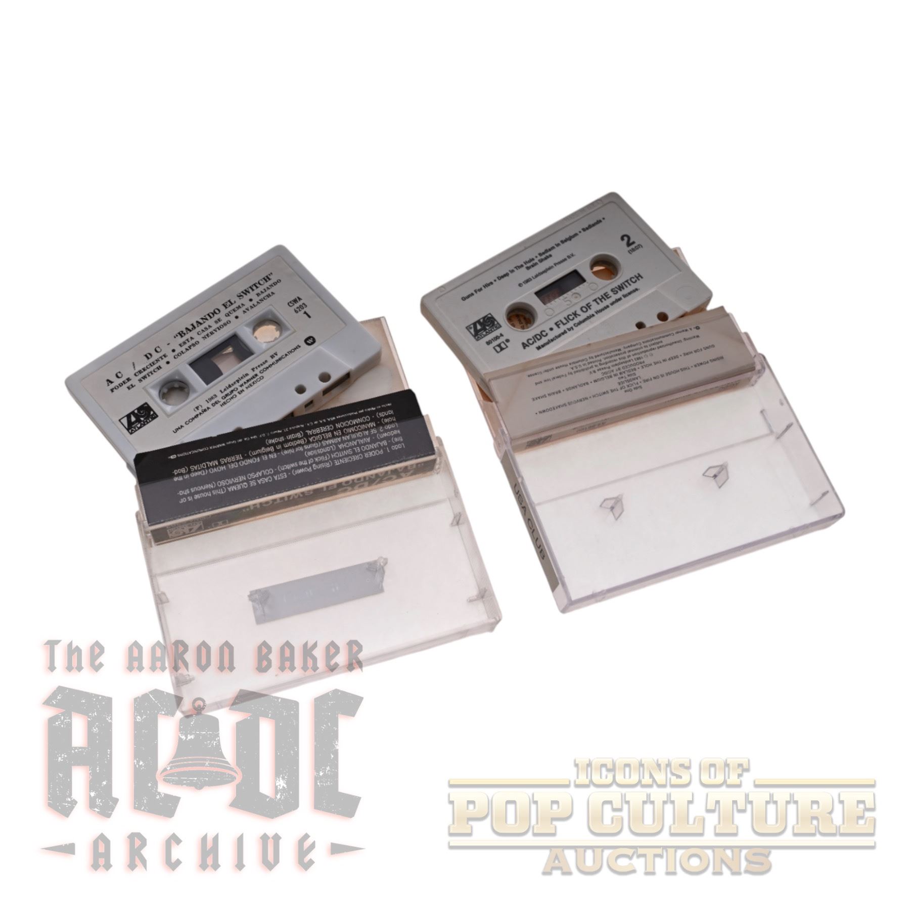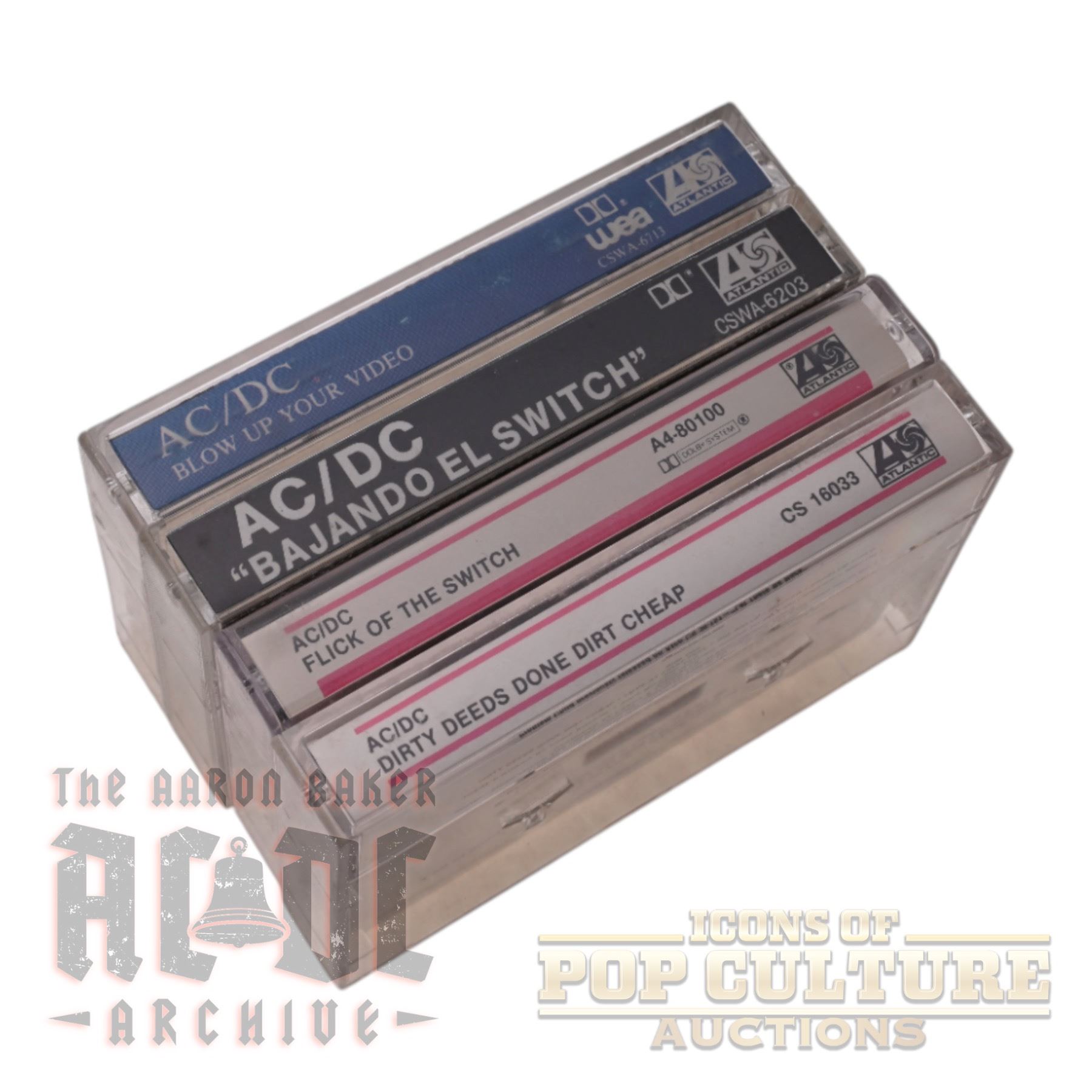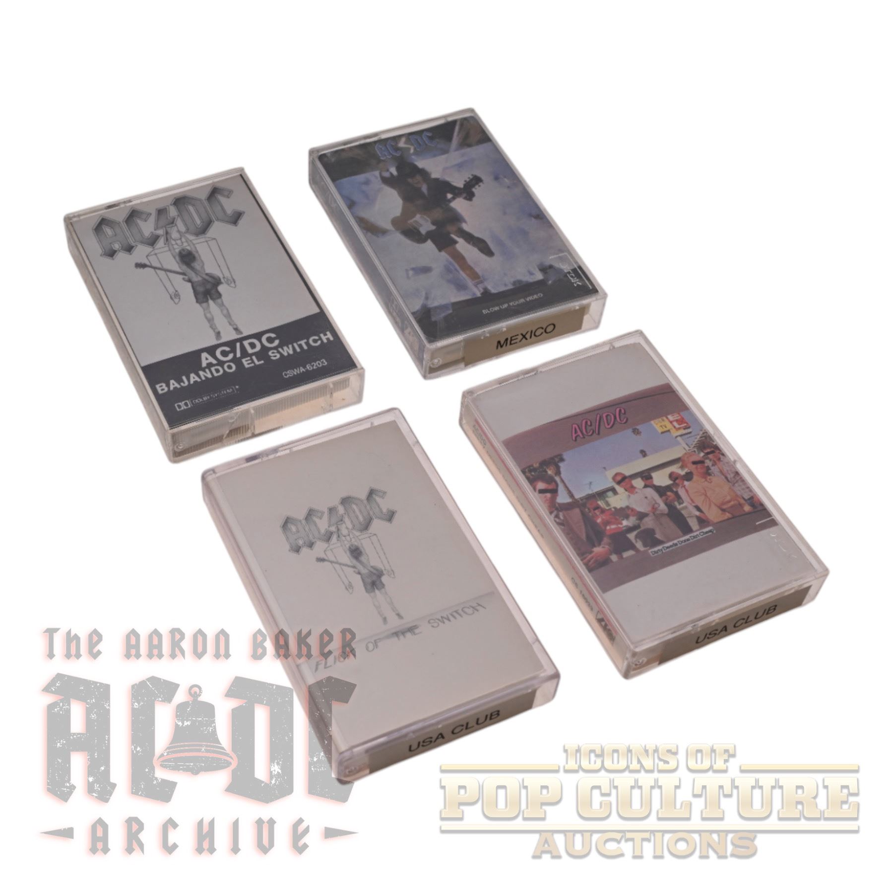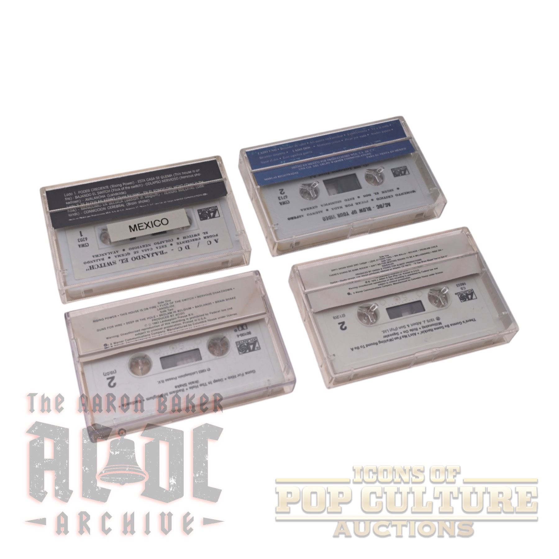 This lot features four AC/DC cassette tapes from both Mexico and the USA. Included are Bajando El Switch (Mexico release of Flick of the Switch), Blow Up Your Video (Mexico release), and two U.S. club editions: Flick of the Switch and Dirty Deeds Done Dirt Cheap. Each cassette comes in its original plastic case with printed inserts, showcasing variations in artwork and labeling between the Mexican and American issues. A unique mix of international editions, this lot highlights the diverse formats in which AC/DC’s music was distributed during the cassette era.