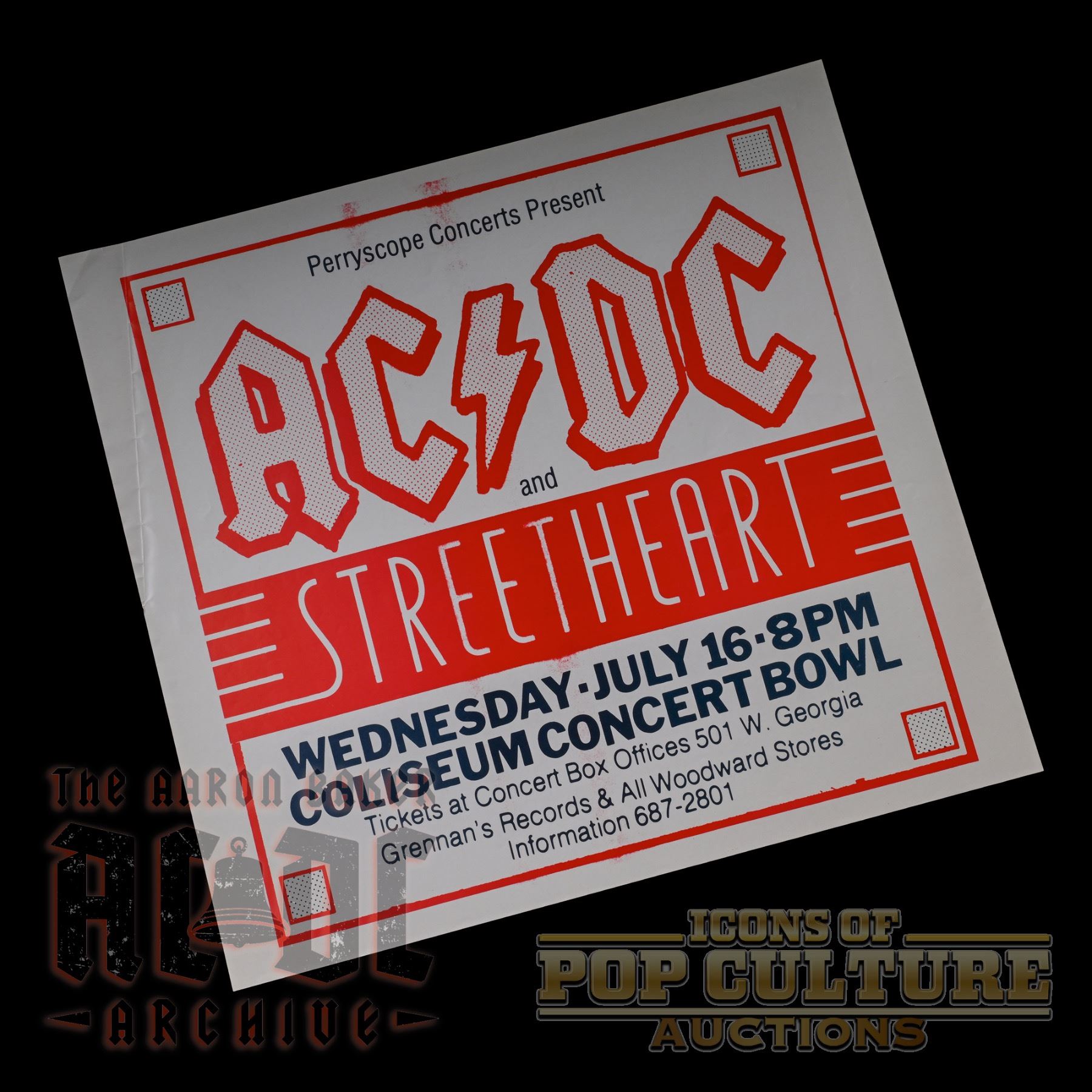 This is a 15" × 14" AC/DC concert poster promoting the band’s performance at the Coliseum Concert Bowl on Wednesday, July 16 at 8 PM. Presented by Perryscope Concerts, the poster also features Canadian rock band Streetheart as the supporting act. Printed in bold red and blue text on a white background, the design highlights AC/DC’s classic logo and provides ticket information through Grennan’s Records, Woodward Stores, and the Concert Box Offices. A rare promotional piece from AC/DC’s late 1970s era, this poster captures the energy of the band’s rise to international fame.
