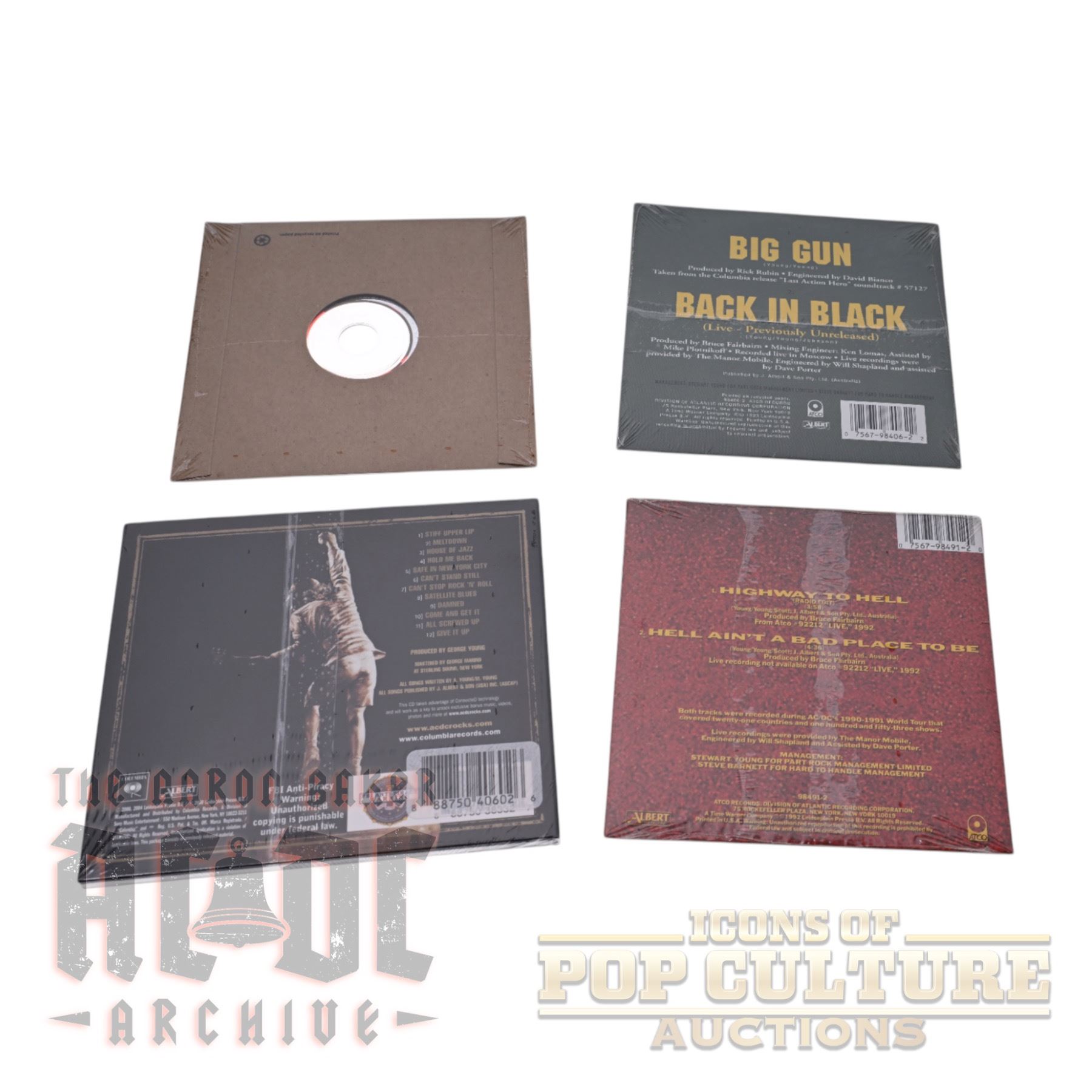 This set includes four factory-sealed AC/DC compact discs spanning promotional, single, and remastered releases. Featured is the Big Gun Collector’s Edition CD single, which also includes a live version of “Back in Black,” and the Highway to Hell maxi single, backed with live recordings including “Hell Ain’t a Bad Place to Be.” Also included is the remastered edition of Stiff Upper Lip with a digital copy offer, part of the AC/DC Remasters series, and an Atlantic promotional disc packaged in a replica 45-style sleeve. Together, these sealed discs showcase a mix of collectible singles, a remastered studio album, and a rare promo edition, making for a unique and desirable AC/DC collection.