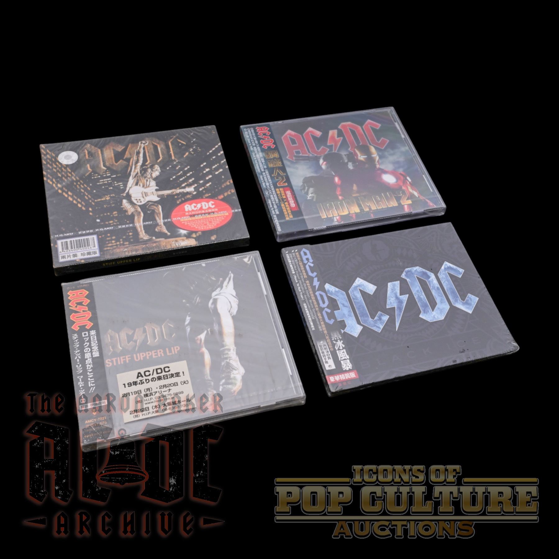 This set includes four factory-sealed AC/DC compact discs representing releases from the band’s later catalog and special editions. Featured are Stiff Upper Lip (2000), Black Ice (2008), and the Iron Man 2 soundtrack (2010), which compiles 15 classic AC/DC tracks used in the Marvel film. Also included is AC/DC Live, a release capturing the band’s legendary stage presence. Each CD remains factory-sealed, with several editions produced for international markets, making this a desirable collection of sealed AC/DC titles spanning studio, live, and soundtrack material.