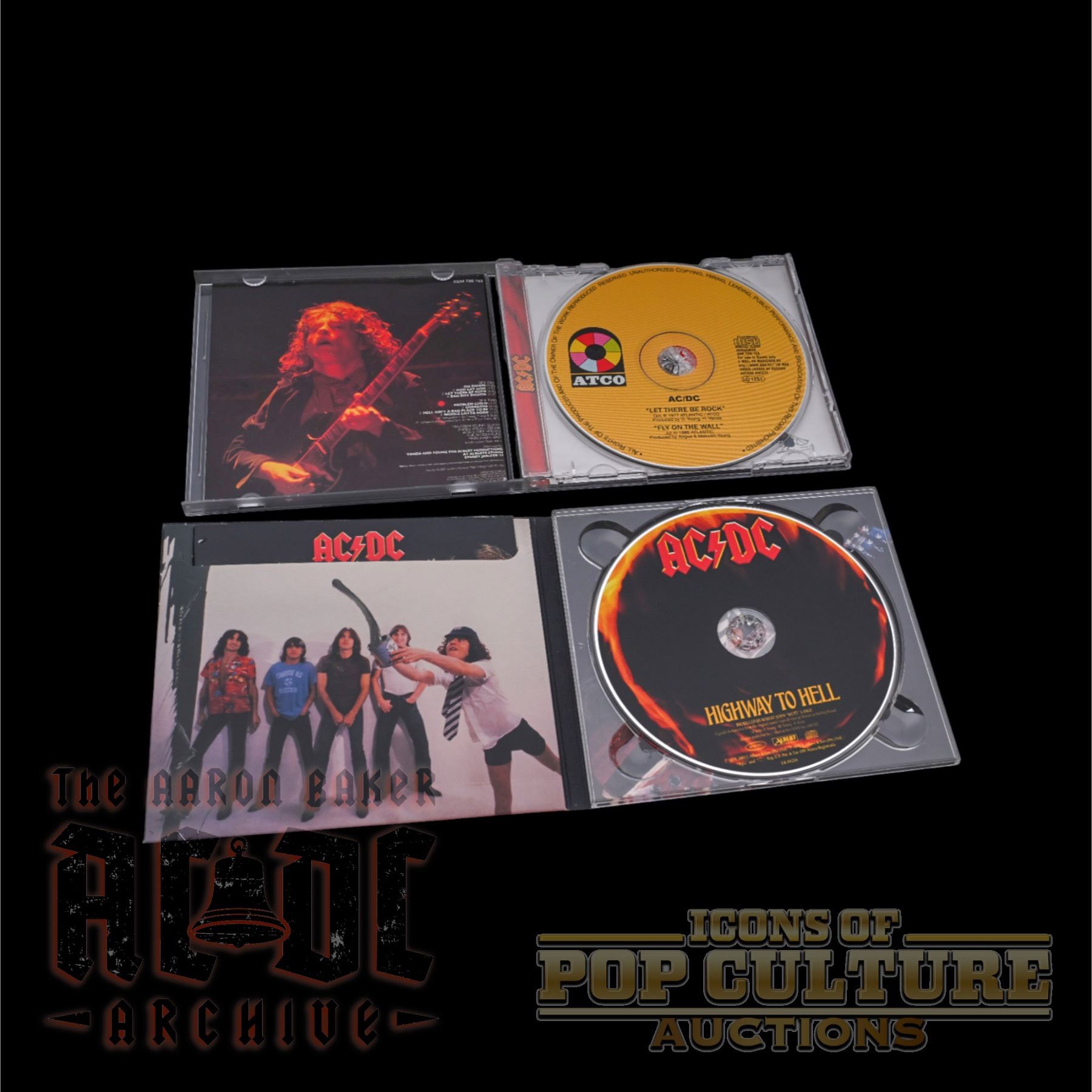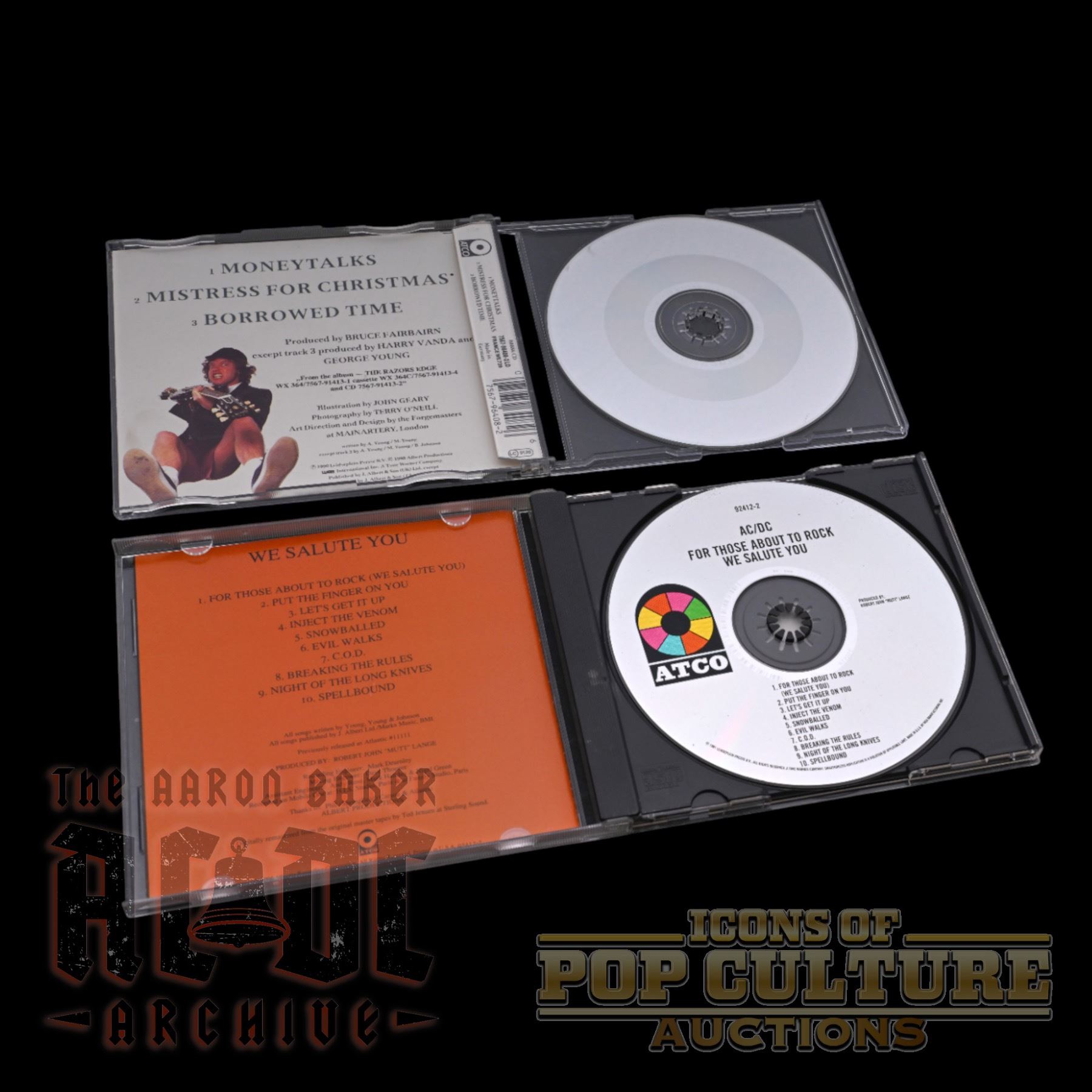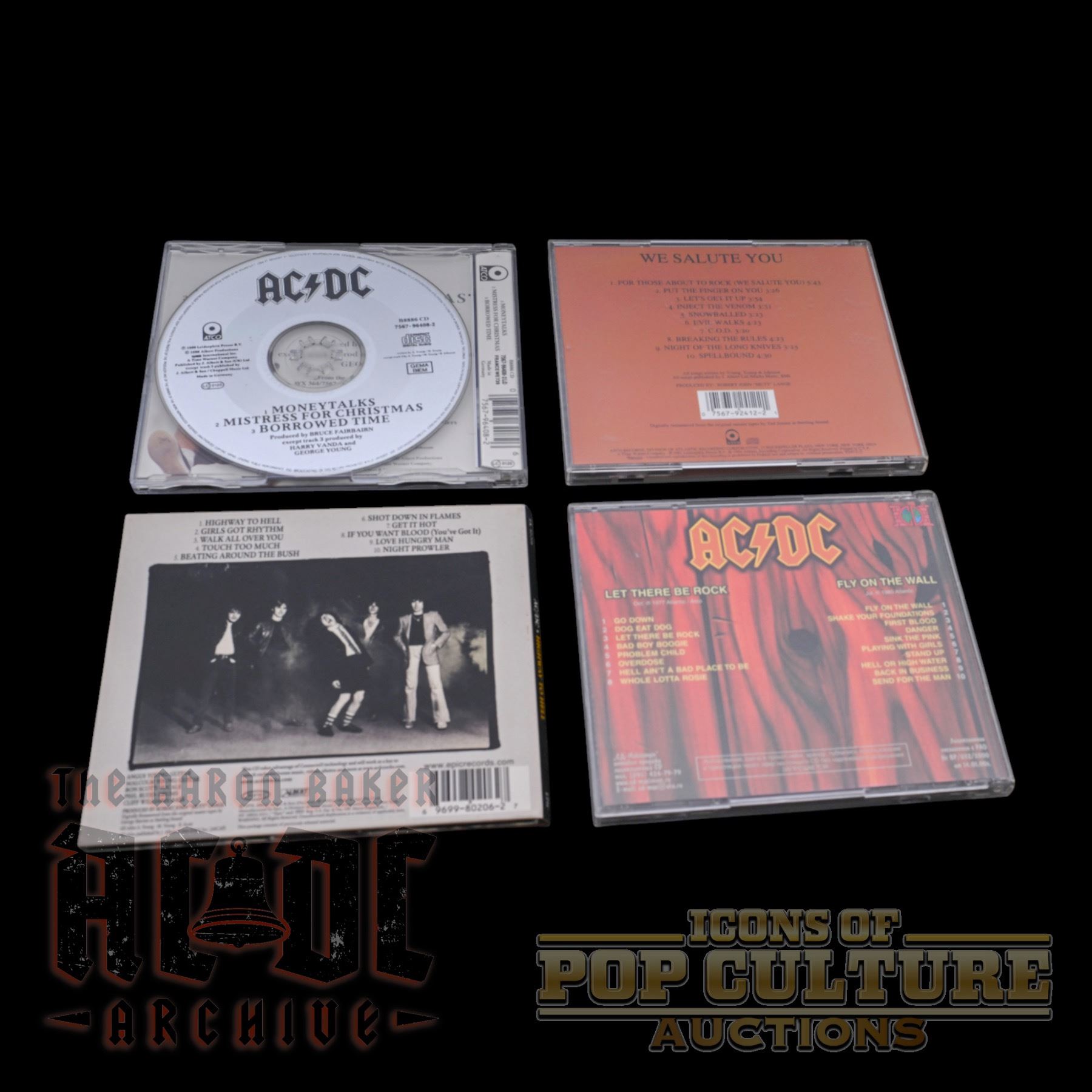 This lot includes four AC/DC compact discs spanning multiple eras of the band’s career. The collection features the Moneytalks CD single, which includes “Moneytalks,” “Mistress for Christmas,” and “Borrowed Time,” For Those About to Rock (We Salute You) originally released in 1981, and Highway to Hell, the band’s landmark 1979 album. Also included is a two-album disc pairing Let There Be Rock (1977) and Fly on the Wall (1985), issued together in one release. This set brings together studio albums, a CD single, and a multi-album release, making it a versatile addition for AC/DC collectors.
