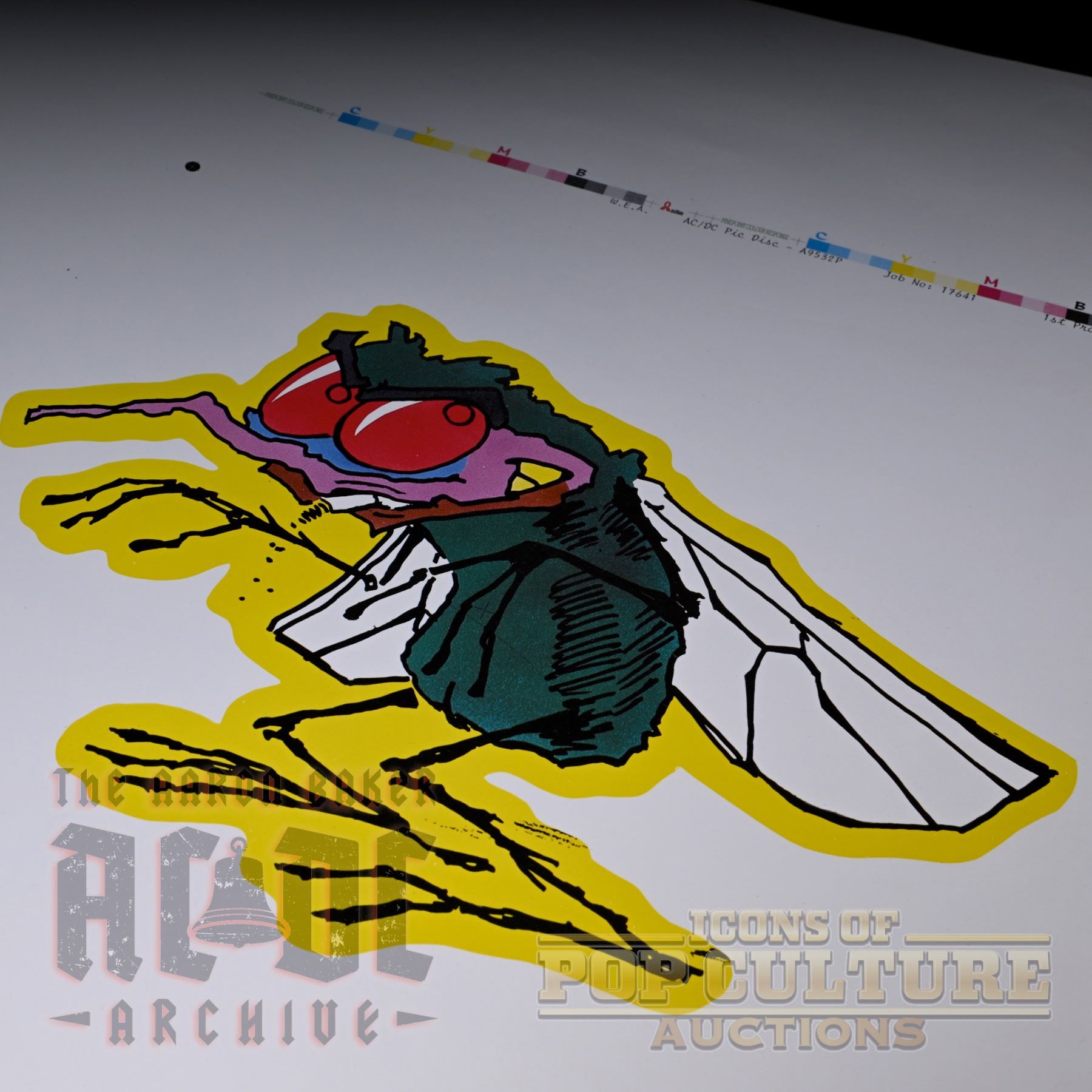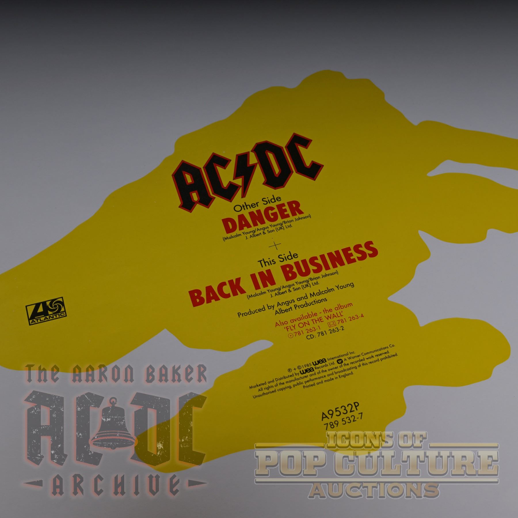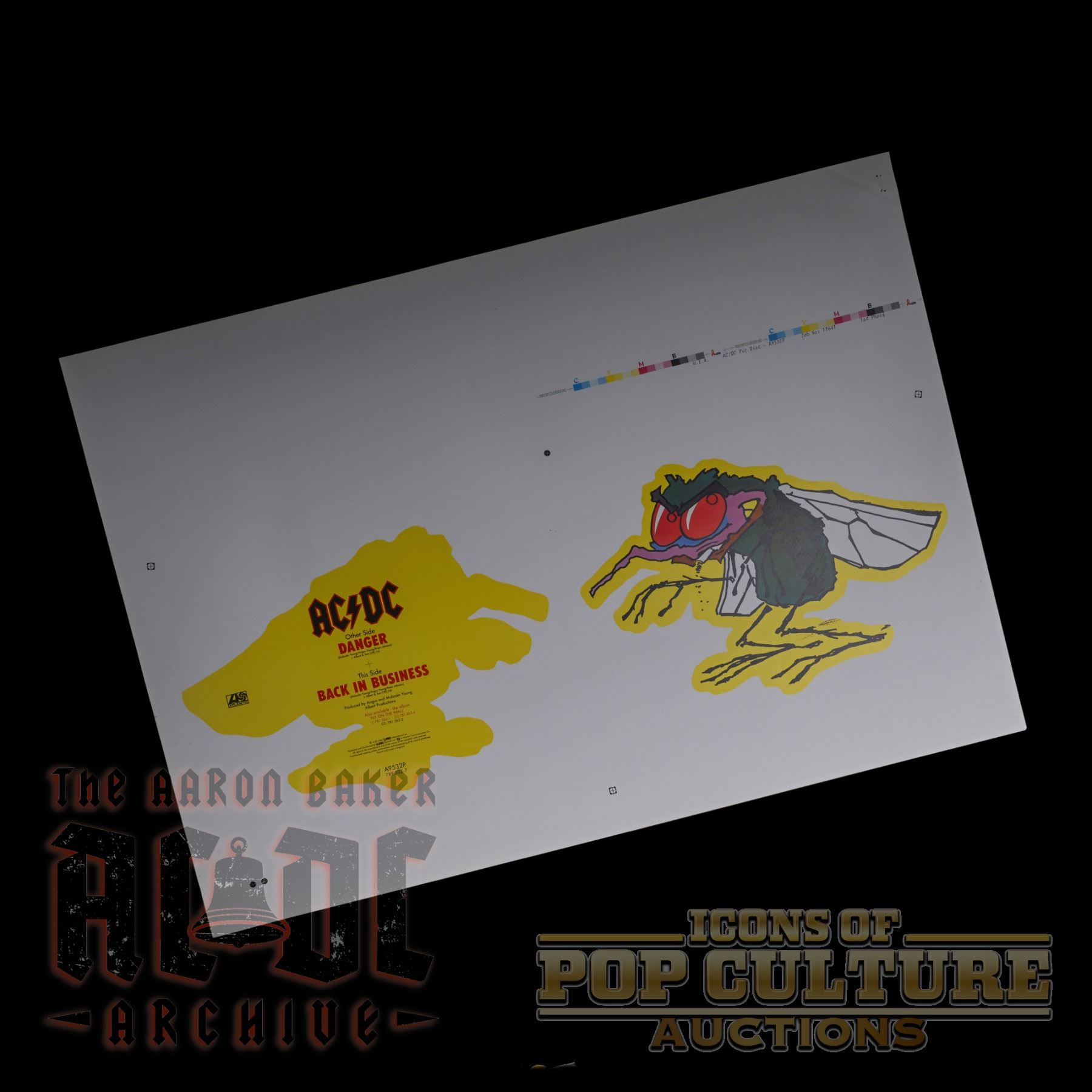 This is an original 25.25" × 17.75" printer’s proof for the AC/DC 7" picture disc release of Danger backed with Back in Business, issued in 1985 by Atlantic/WEA with catalog number A9532P. The proof sheet shows the artwork for both Side A and Side B of the disc prior to production, including the bold yellow splatter design with track details on one side and the colorful fly illustration on the reverse. Both songs were featured on the band’s Fly on the Wall album, produced by Angus and Malcolm Young. Printer’s proofs such as this were used in the manufacturing process to check color alignment and design layout before the final picture discs were pressed, making them a rare piece of production history tied to AC/DC’s mid-1980s discography.